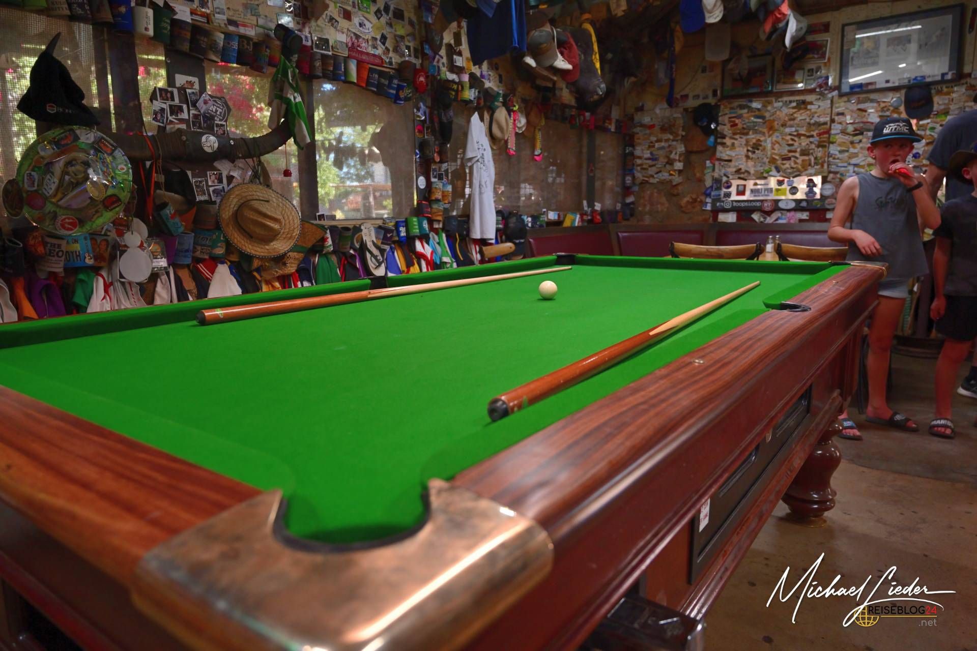 Wir hatten das Pech, genau während der Ruhezeit in der Kneipe anzukommen – ab 14:30 Uhr gab es nichts Warmes mehr aus der Küche. Dabei hatten wir uns so darauf gefreut, das echte Outback-Leben zu erleben, gemütlich einzukehren und unsere Bordküche gegen eine der viel gepriesenen Mahlzeiten im Pub von Daly Waters einzutauschen. Doch die strikte Mittagspause ließ nur Zeit für einen Kaffee, und so musste unsere Bordküche am Abend zeigen, was sie zu bieten hatte.