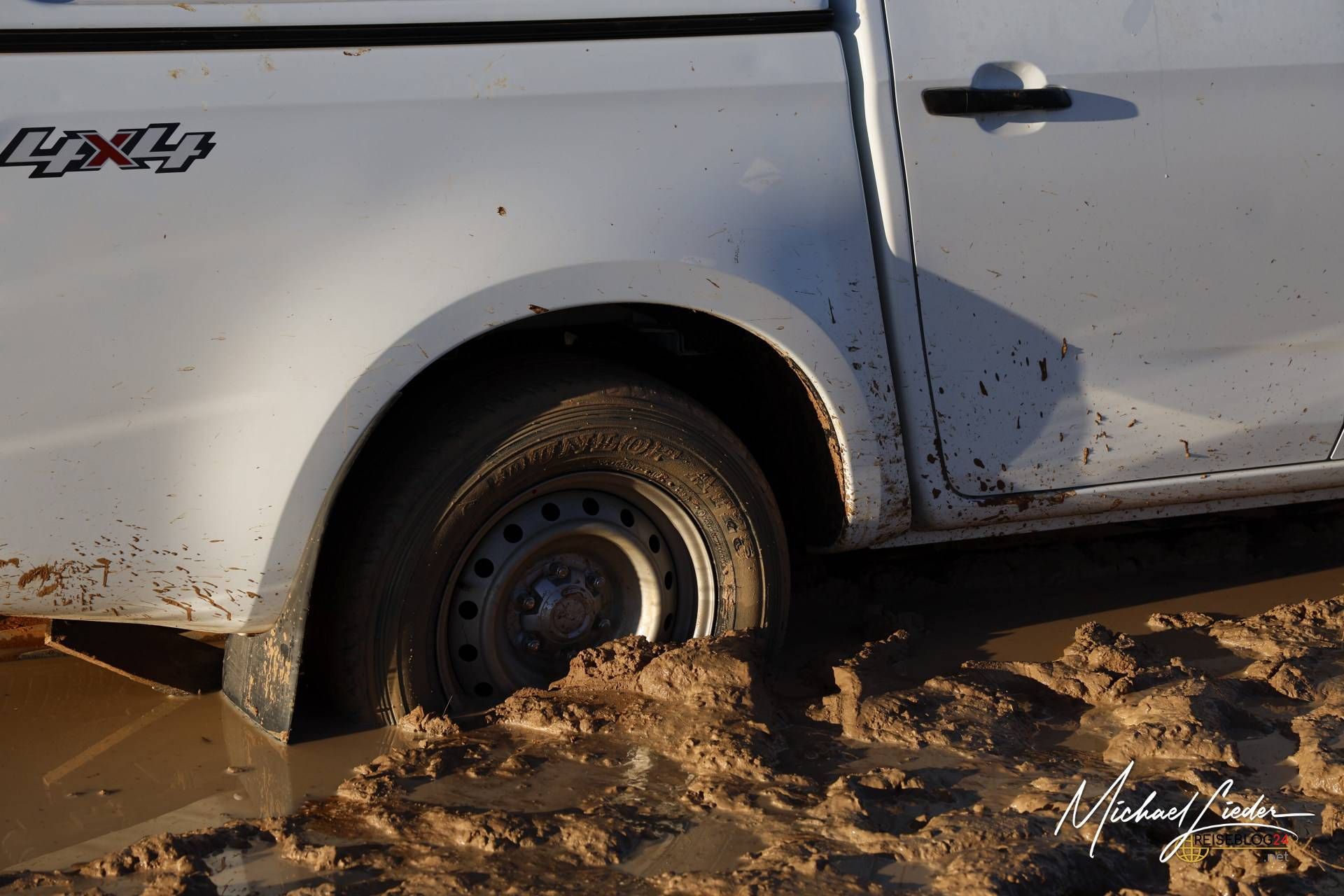 Unser Auto, trotz Allradantrieb und Untersetzung, hatte keine Chance. Es steckte fest. Wirklich fest. Mit jedem Versuch, uns aus dem Schlamm zu befreien, grub sich unser Fahrzeug nur noch tiefer in den Morast. Der Zeitpunkt hätte kaum ungünstiger sein können: Die Sonne verschwand langsam hinter dem Horizont, und die Dunkelheit breitete sich wie eine Decke über die Landschaft aus.