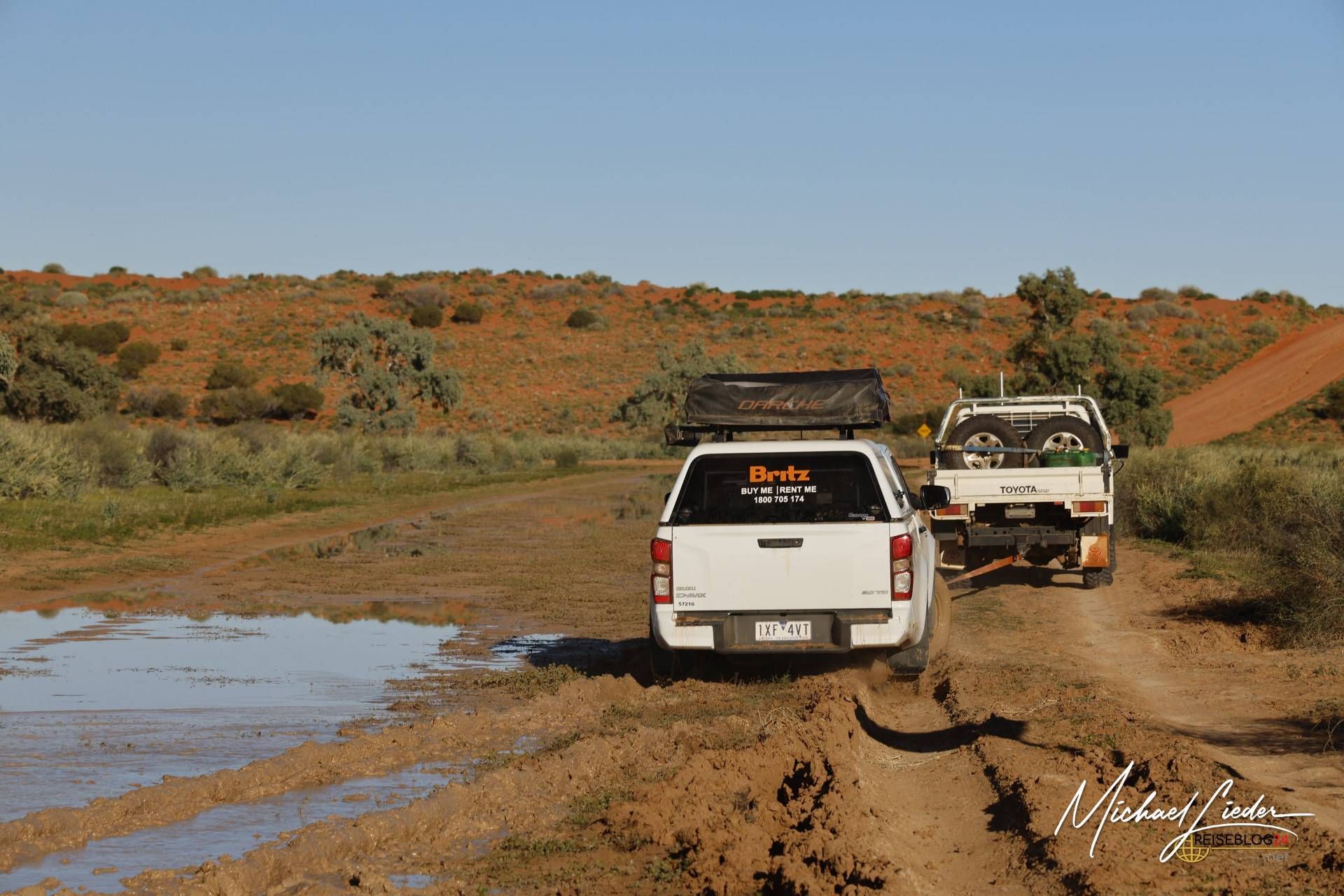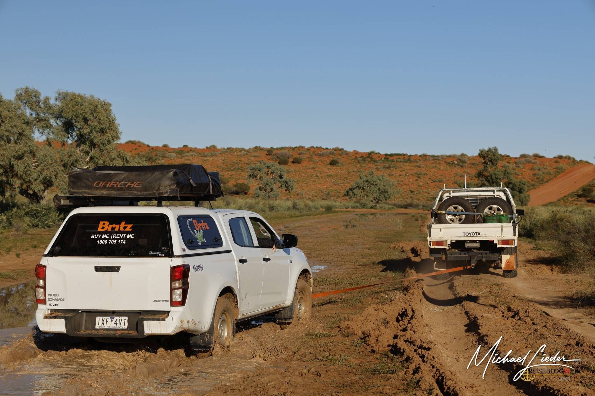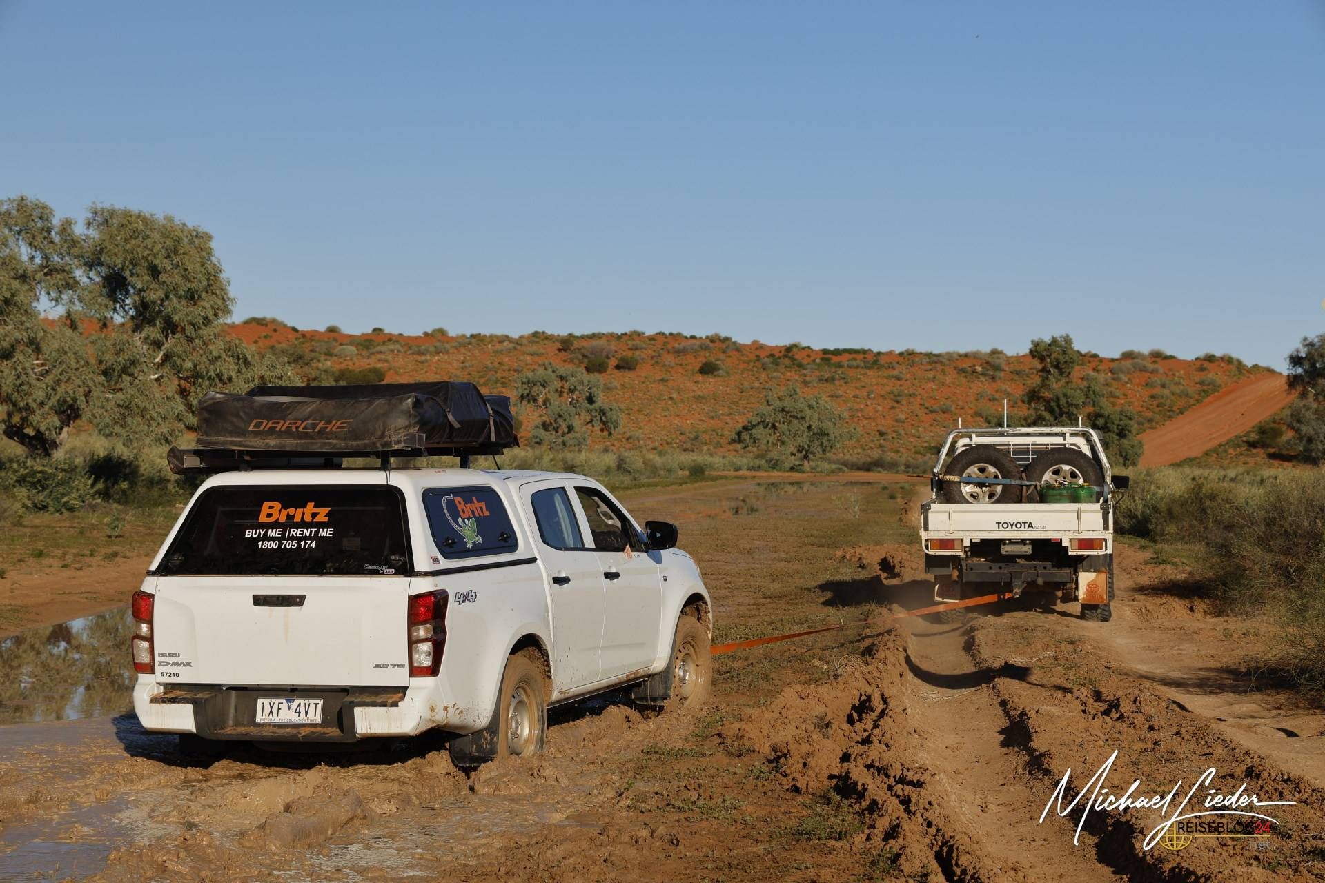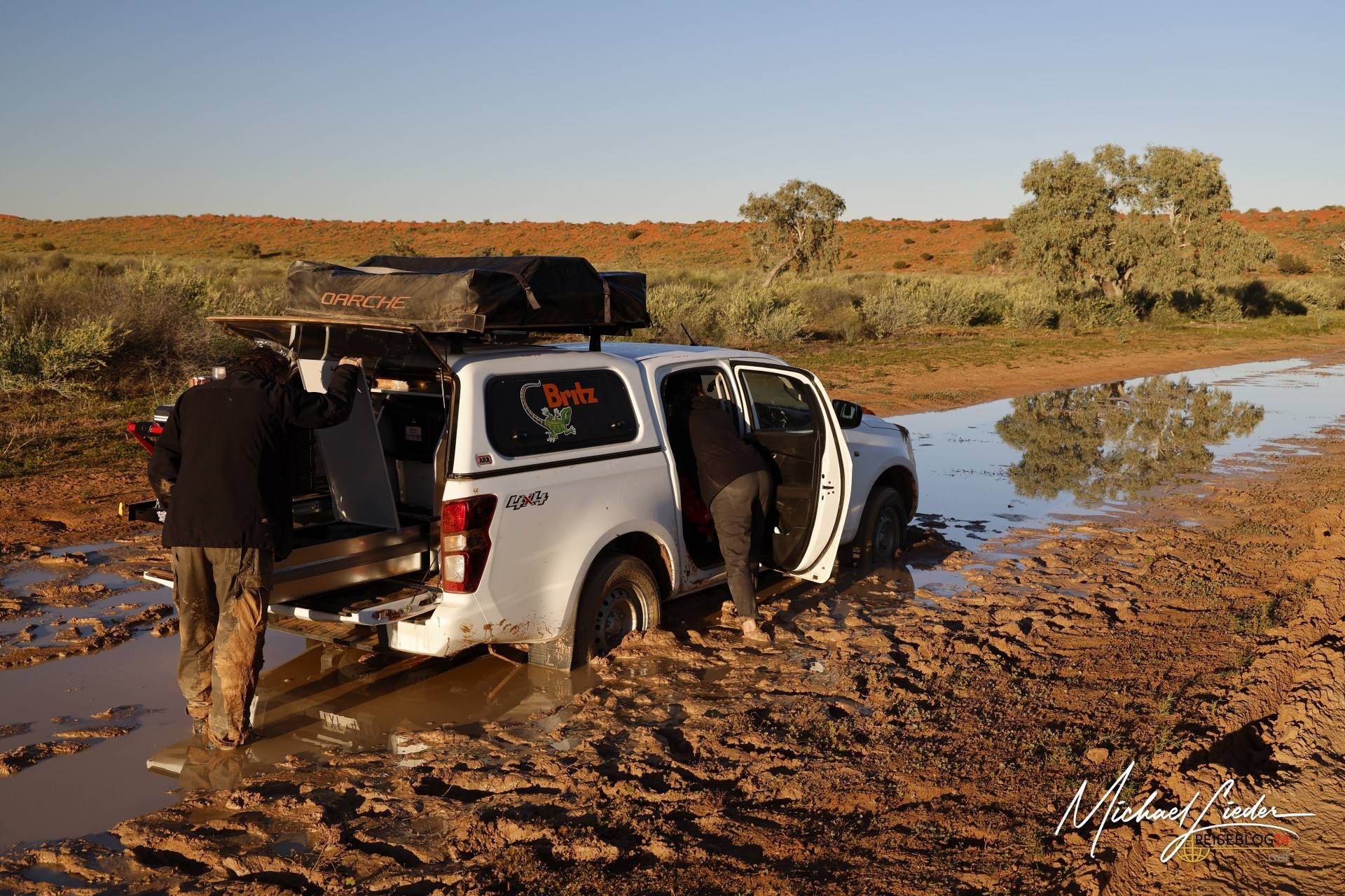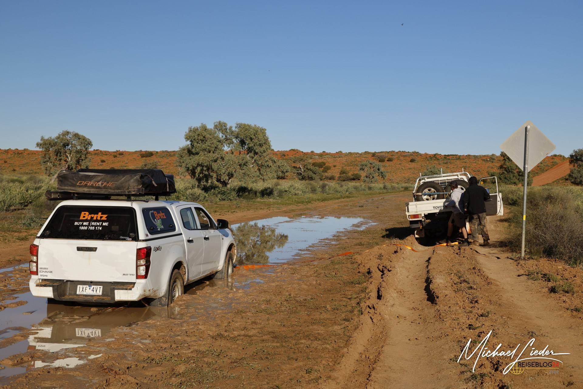 Leider war ihr Fahrzeug nicht kräftig genug, um uns aus dem Matsch zu ziehen. Doch anstatt einfach weiterzufahren, drehten sie um und fuhren zurück zur Station, um Hilfe zu organisieren. Eine halbe Stunde später tauchte – ganz im typisch unkomplizierten australischen Stil – ein kräftiger Pick-up auf. Ohne viele Worte zu verlieren, wurde mein vorbereitetes Abschleppseil an seinem Wagen befestigt, und ehe wir uns versahen, zogen sie uns aus dem Morast.