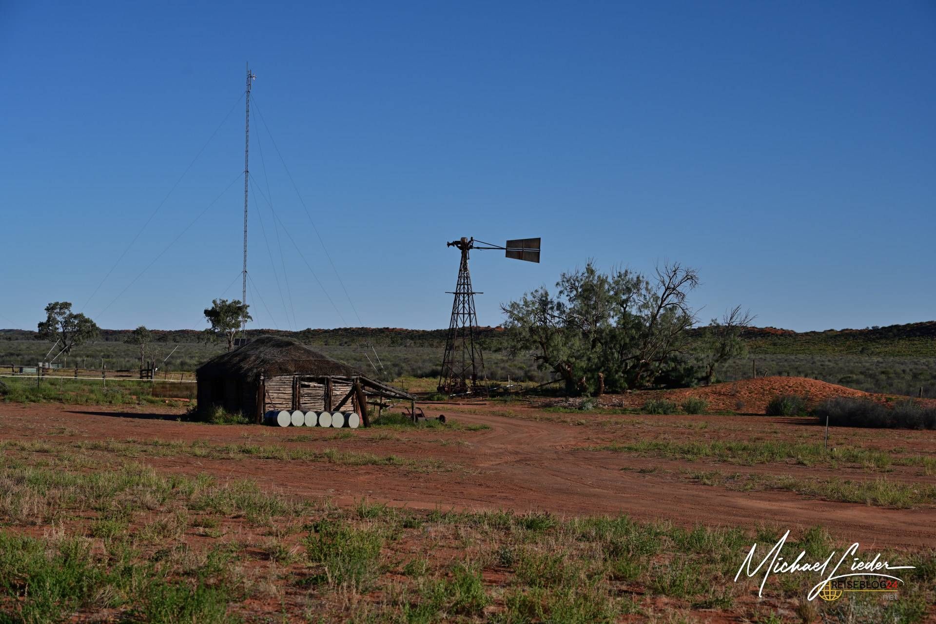 Als wir schließlich die Old Andado Station erreichten, fühlte es sich an, als würden wir in eine andere Zeit eintauchen. Die trockene, rotbraune Erde knirschte unter unseren Füßen, während der warme Wüstenwind sanft durch die alten Gebäude strich. Die Station, ursprünglich in den 1920er Jahren gegründet, hat bis heute ihren ursprünglichen Charme bewahrt. Alte, wettergegerbte Holzzäune, ein rostiger Windpumpenbrunnen und verlassene Stallungen vermittelten den Eindruck, dass hier die Zeit stehen geblieben war.