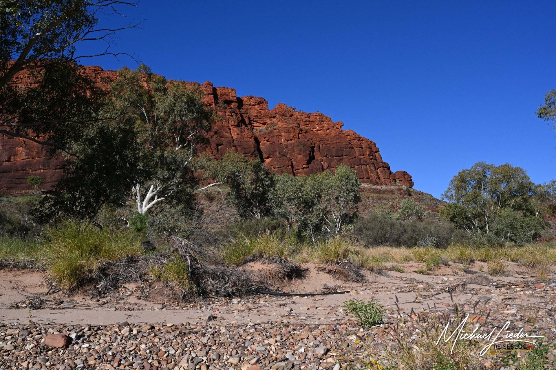 Durch dieses Tal zieht sich der Finke River, von den Arrernte Larapinta genannt. Einer der ältesten Flüsse der Welt – rund 350 Millionen Jahre alt. Ein ehrwürdiges Alter für ein Gewässer, das heute meist trocken daliegt. Nur nach langen Regenfällen schiebt sich noch träge Wasser durch das breite Flussbett, auf dem Weg nach Südosten, bis es irgendwann sang- und klanglos im Sand der Simpson Desert verschwindet. Kein Drama, kein Finale. Einfach vorbei.