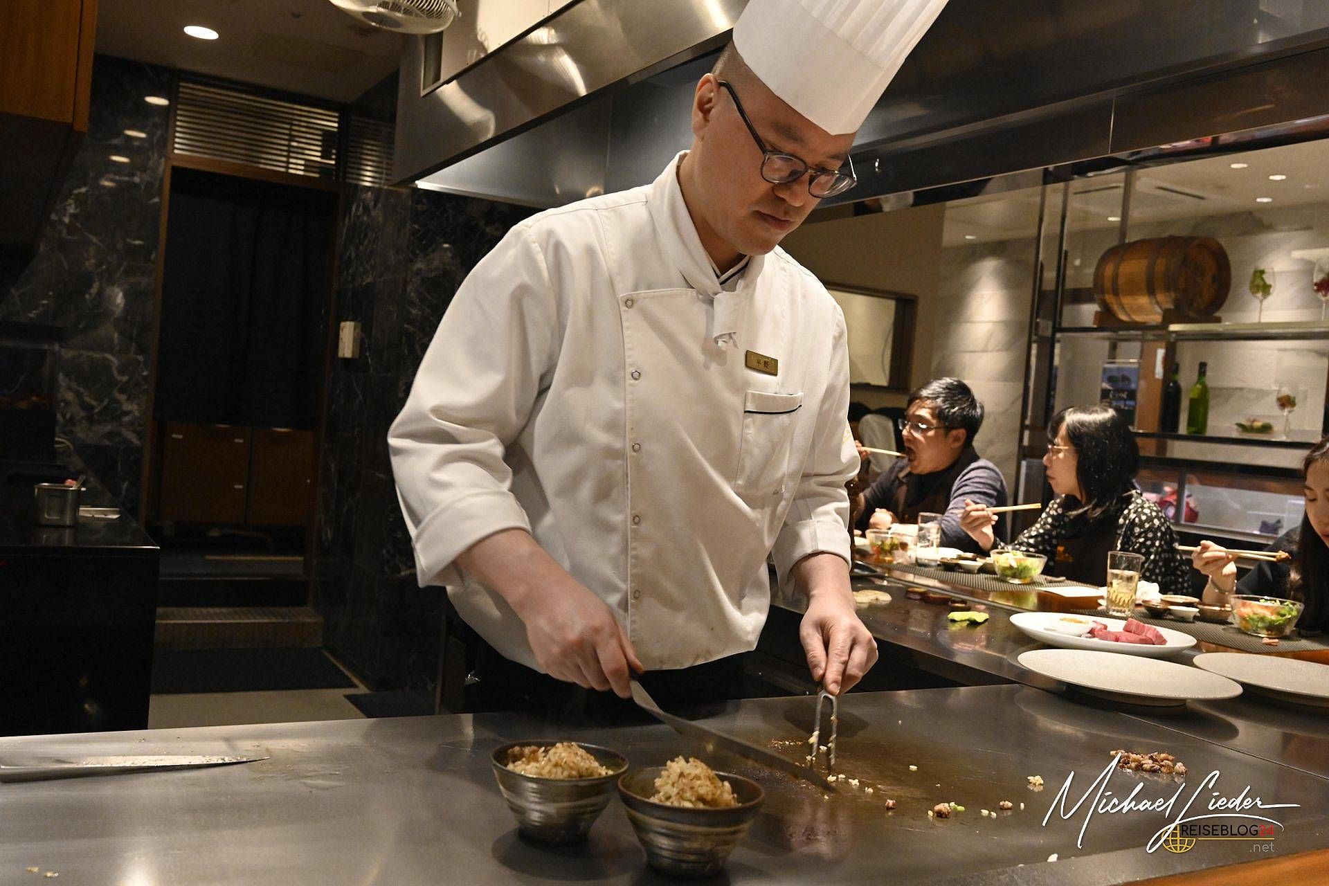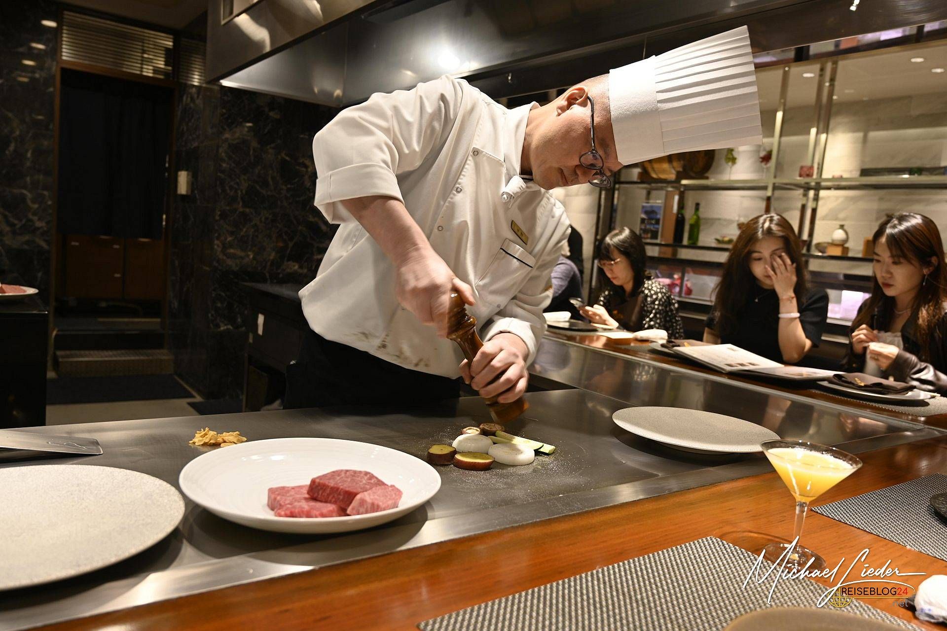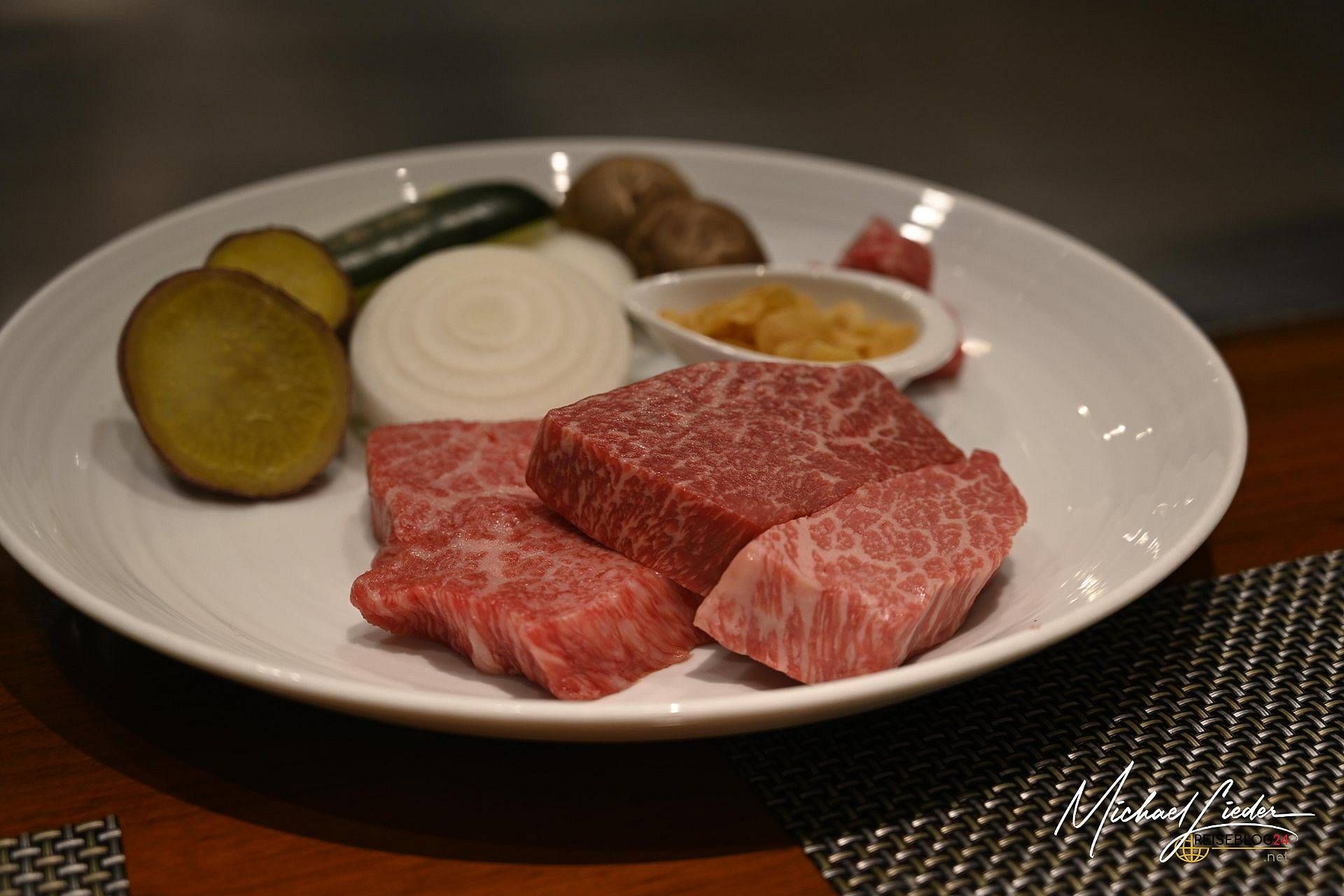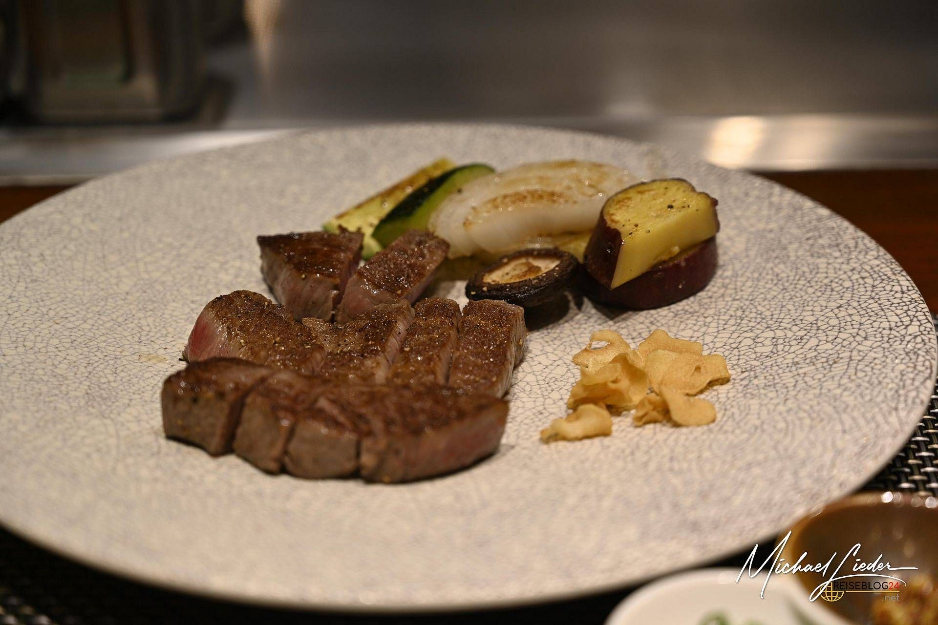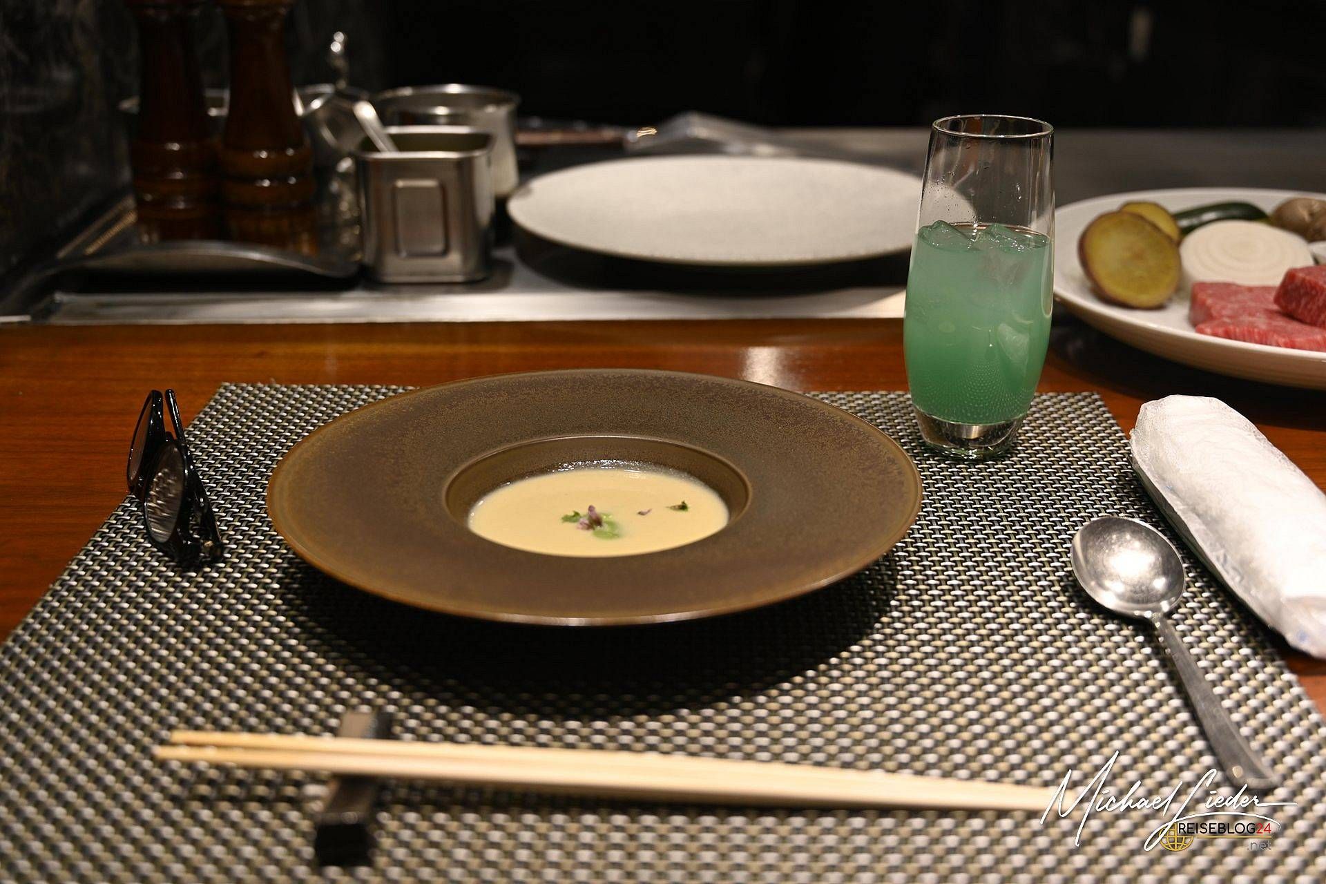 Am Eingang wurde mein Name abgehakt, wie bei einem streng geheimen Steak-Kult. Zutritt gewährt, wir durften Platz nehmen. Vor uns: die Bühne. Dahinter: der Meister der Hitze, bewaffnet mit Spachtel, Messer und einem höflichen Dauerlächeln. Was folgte, war ein mehr gängiges Ritual. Die Vorsuppe kam, gefolgt von kleinen Kunstwerken in Schälchen – alles liebevoll erklärt von freundlichem Personal, das auch auf Englisch charmant durch den Speiseplan führte. Und dann… der Moment: Der Chefkoch persönlich präsentierte das Kobe-Rind – mit einer Mischung aus Ehrfurcht und Stolz, wie ein Dompteur seinen Starlöwen. Das Fleisch: fein marmoriert, zart wie Wolken. Die Zubereitung: leise, konzentriert, fast meditativ.
