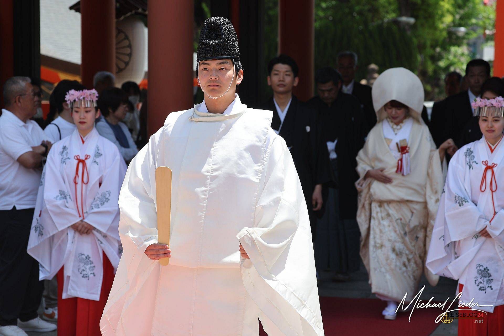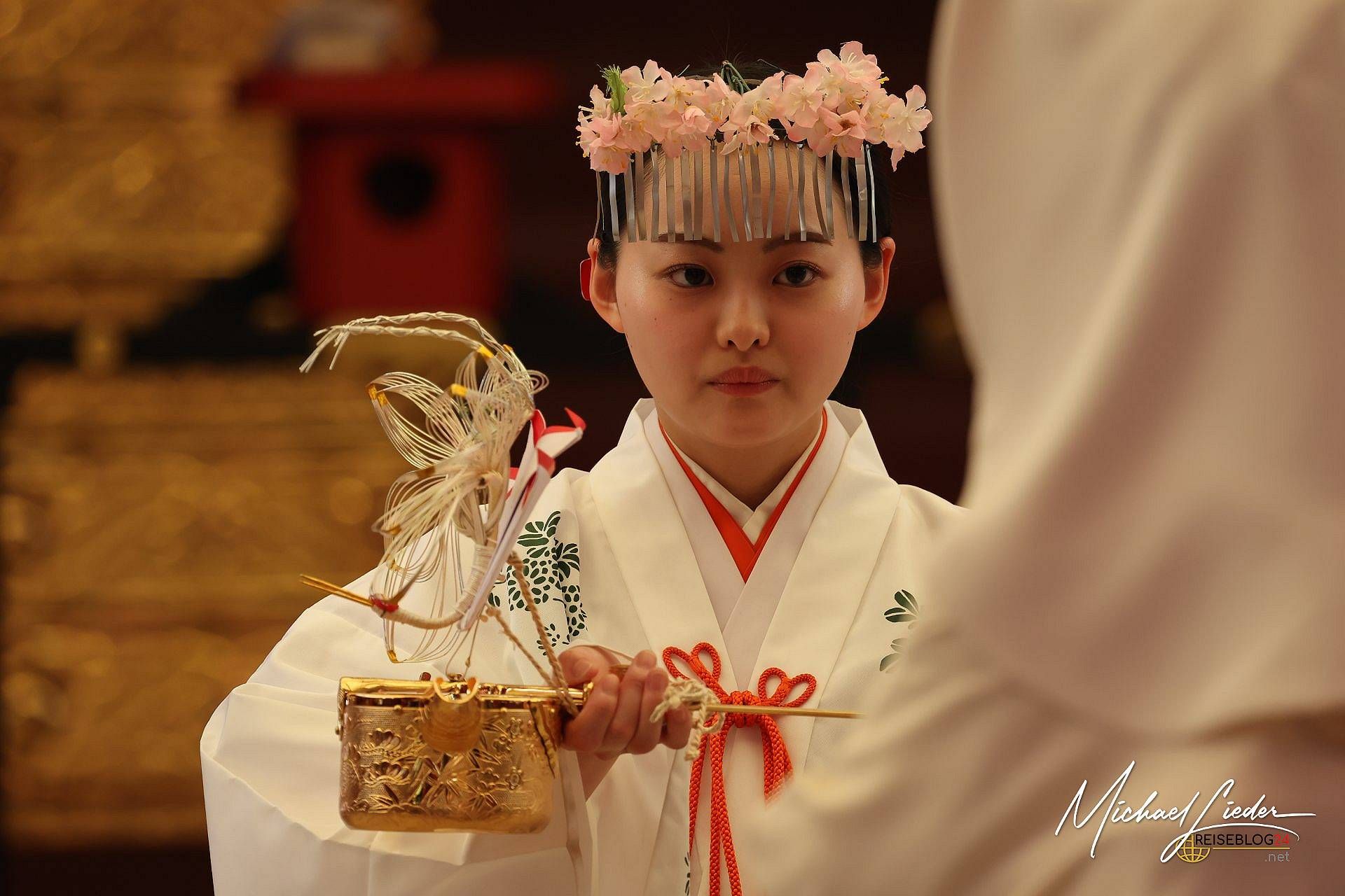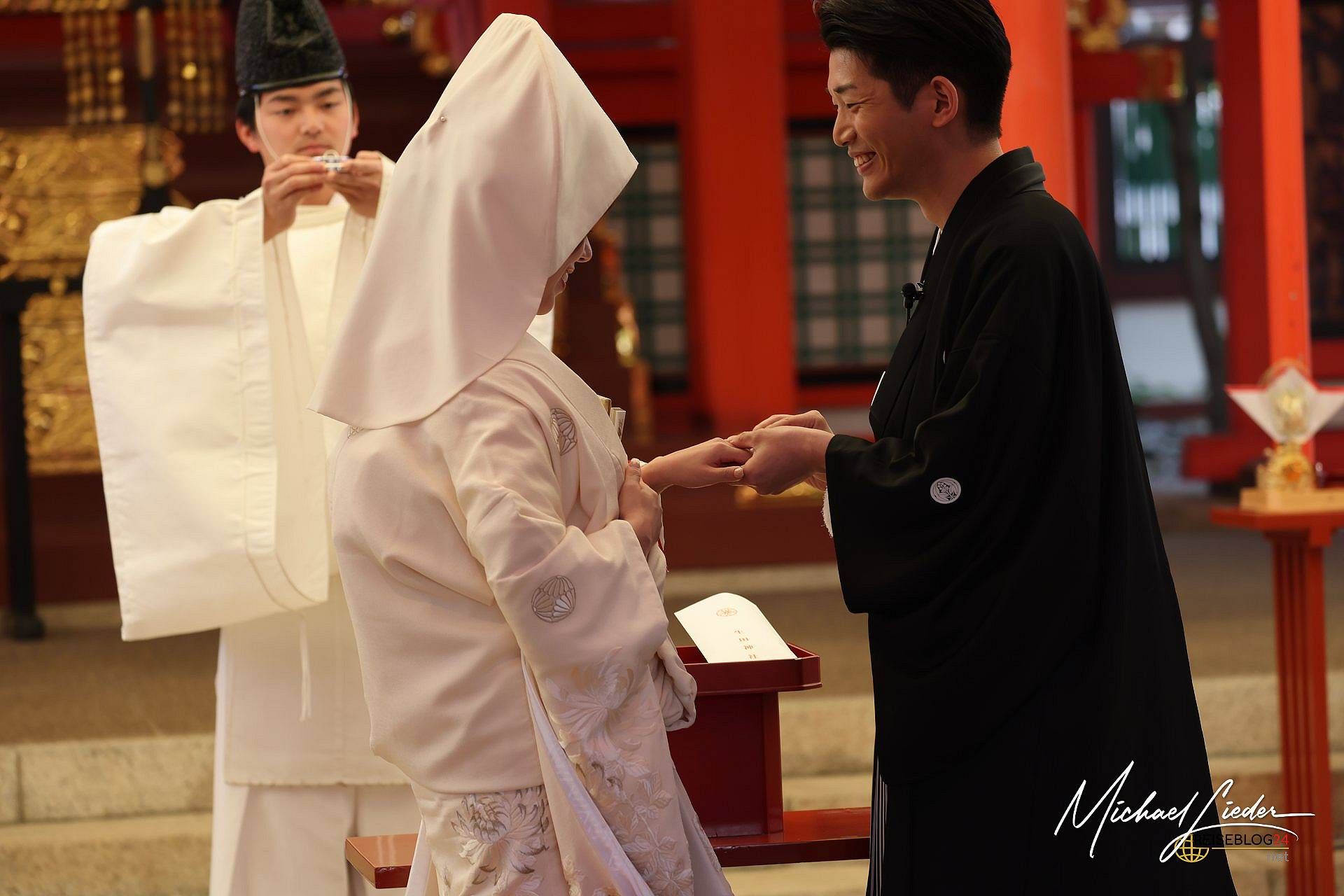 Was wir beobachteten, war eine klassische Shintō-Hochzeit – eine Zeremonie, die tief in der japanischen Kultur verwurzelt ist. In einem ruhigen, spirituellen Rahmen schwört das Paar vor den Kami (Göttern) des Schreins ewige Treue. Es gibt rituelle Reinigung, das feierliche Trinken von Sake in drei Schlucken (san-san-kudo), Opfergaben an die Götter und schließlich das Überreichen der Ringe. Das Ganze ist streng strukturiert, leise und dennoch unglaublich bedeutungsvoll – ganz im Gegensatz zu manch westlichem Hochzeits-Feuerwerk.