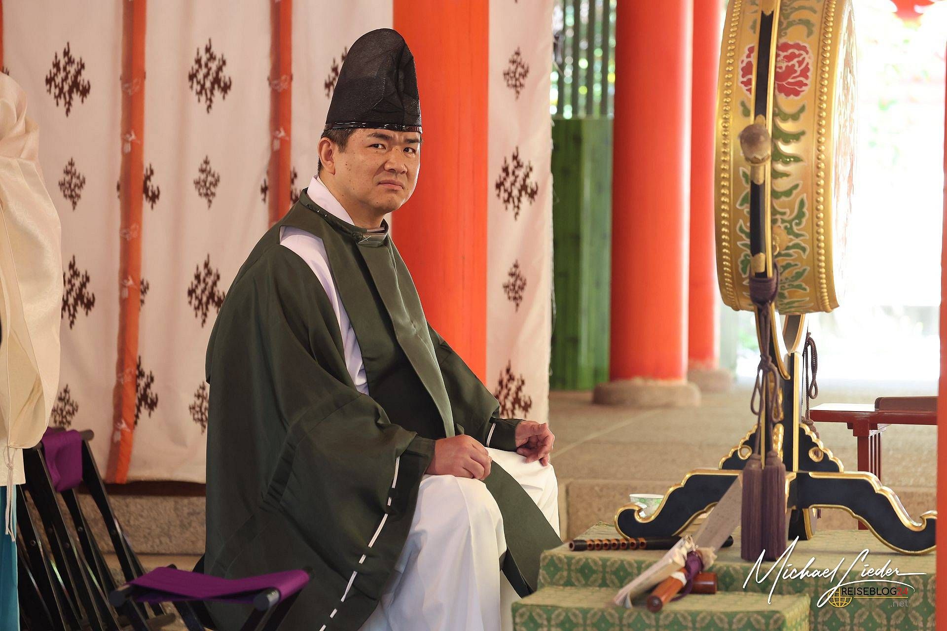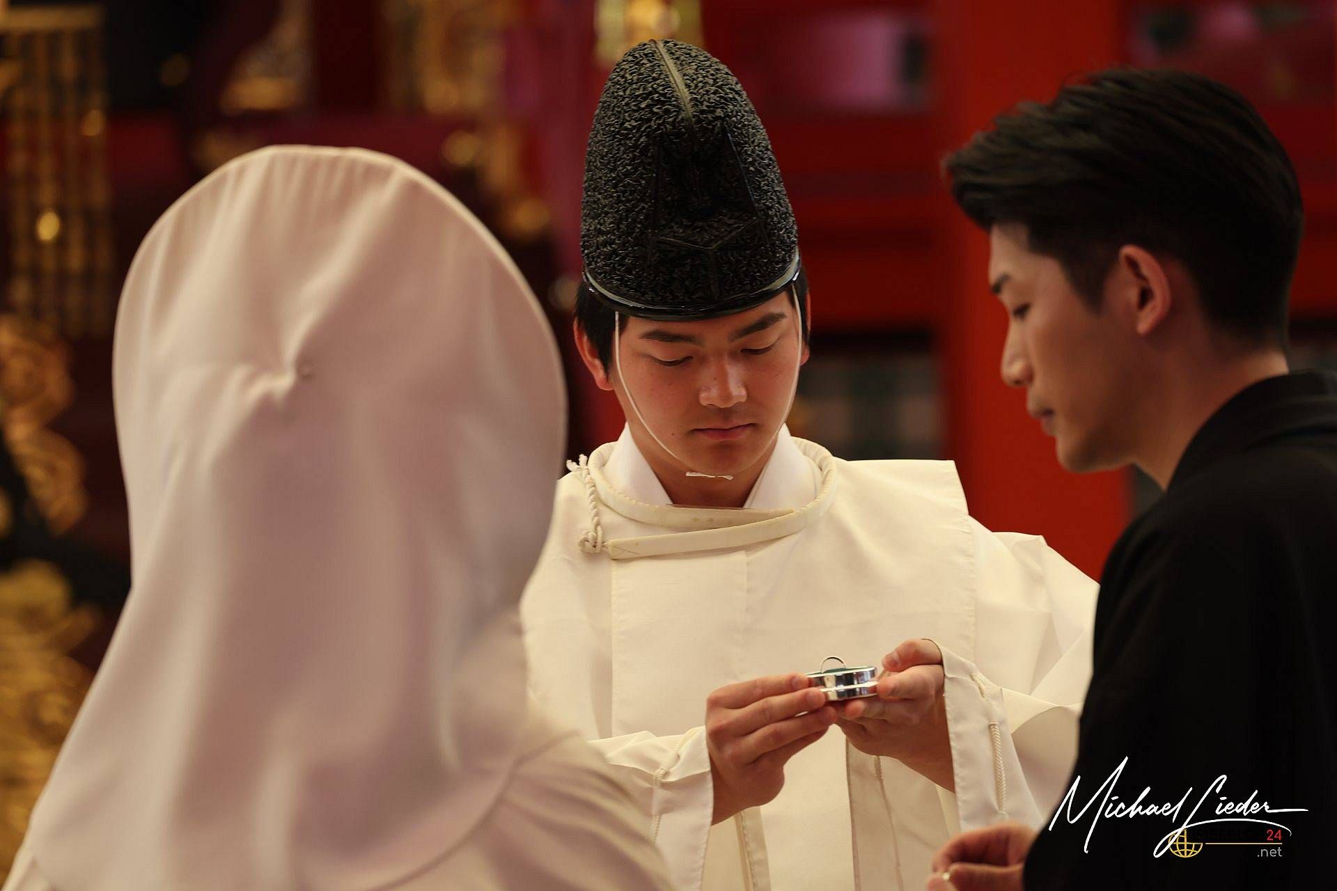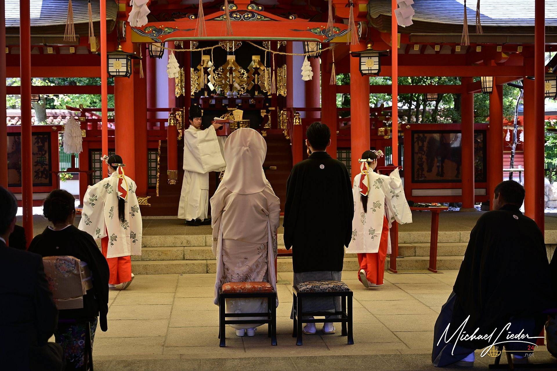 Was wir beobachteten, war eine klassische Shintō-Hochzeit – eine Zeremonie, die tief in der japanischen Kultur verwurzelt ist. In einem ruhigen, spirituellen Rahmen schwört das Paar vor den Kami (Göttern) des Schreins ewige Treue. Es gibt rituelle Reinigung, das feierliche Trinken von Sake in drei Schlucken (san-san-kudo), Opfergaben an die Götter und schließlich das Überreichen der Ringe. Das Ganze ist streng strukturiert, leise und dennoch unglaublich bedeutungsvoll – ganz im Gegensatz zu manch westlichem Hochzeits-Feuerwerk.