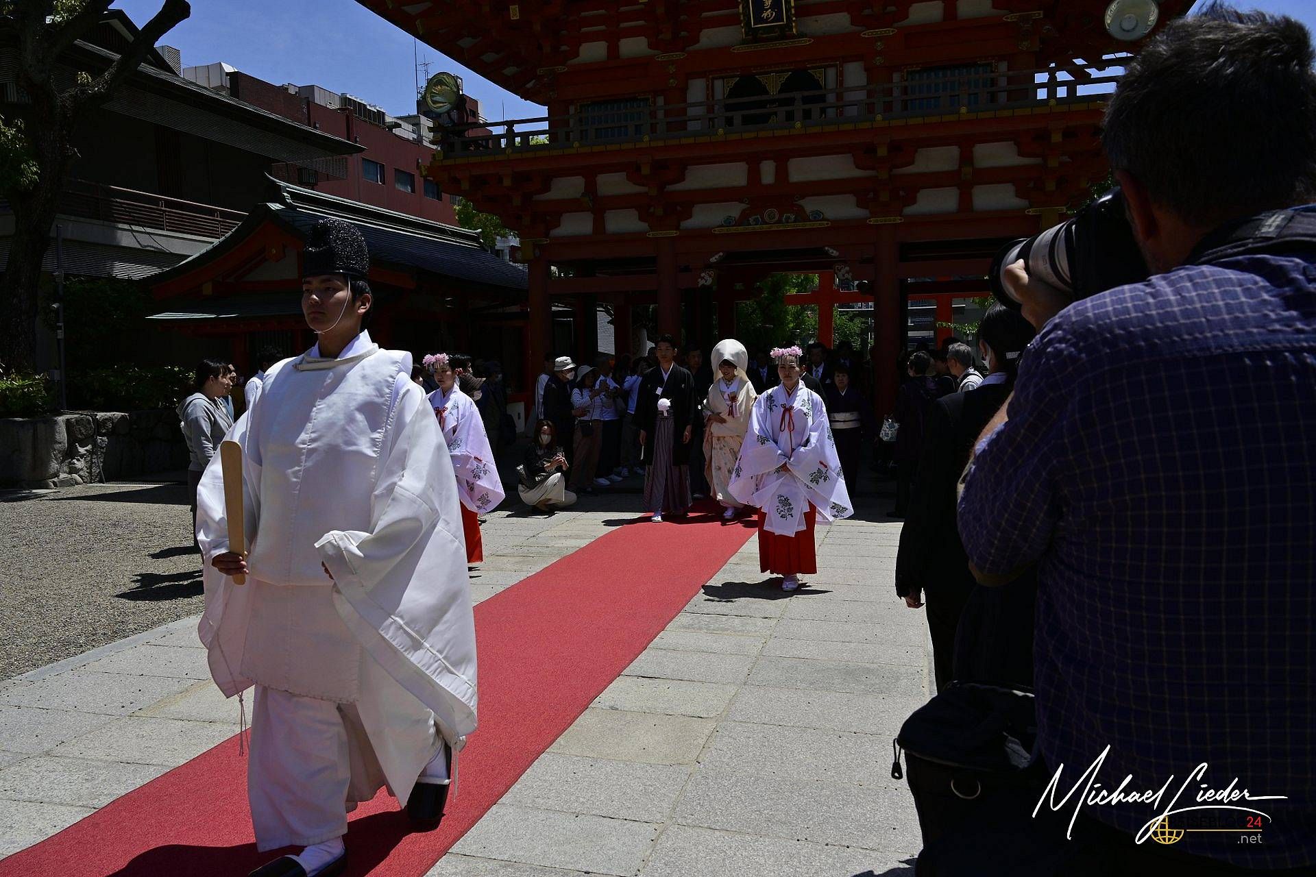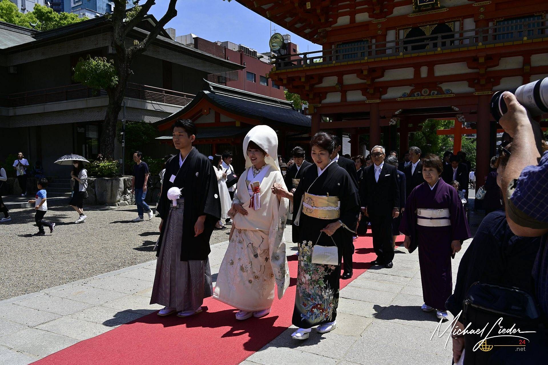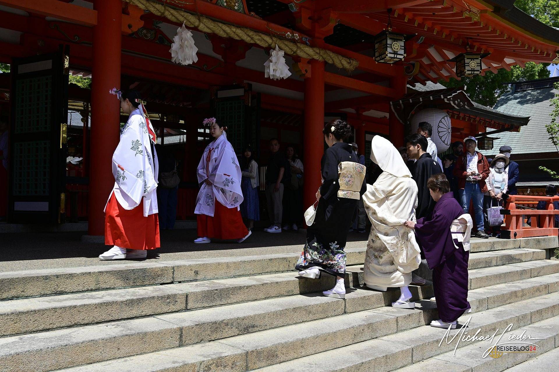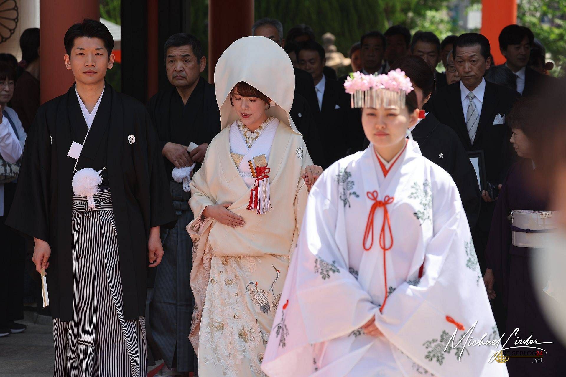 Und dann, tatsächlich: Eine Prozession setzte sich in Bewegung. Vorneweg ein Shintō-Priester mit ernstem Gesicht und noch ernsterem Schritt, gefolgt vom Brautpaar in prachtvoller Tracht. Dahinter schritten Tempeldienerinnen, die wir Europäer wohl als Brautjungfern bezeichnen würden. Und dann – ein Festzug der Eleganz. Die Hochzeitsgesellschaft im feinsten Zwirn, teils in traditionellen Gewändern, als hätte ein Studio-Ghibli-Film kurz realen Boden betreten.