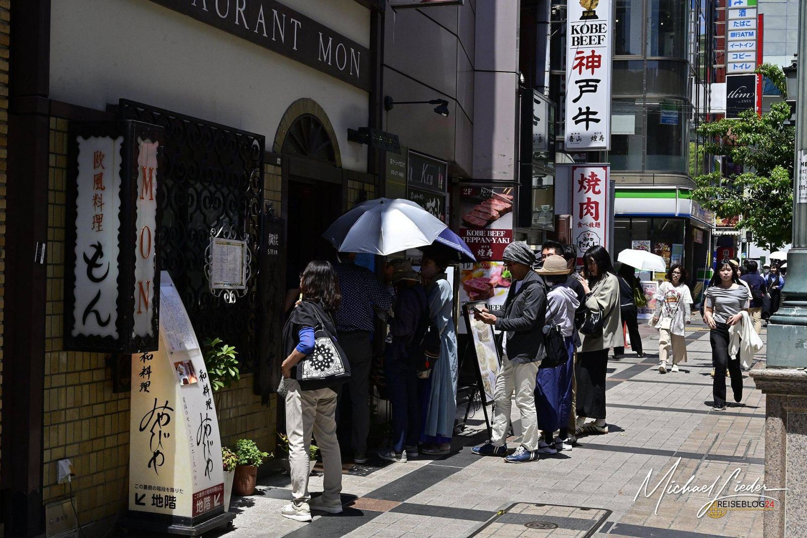 Natürlich kennt man Kobe – zumindest vom Hörensagen, kulinarisch jedenfalls. Das sagenumwobene Rind, das mehr Massagen bekommt als ich im ganzen letzten Jahr, war für uns Grund genug, dieser Stadt einen Besuch abzustatten. Und ehrlich: Wer einmal auf Japans Straßen unterwegs war, weiß, dass der Weg oft genauso viel Freude bereitet wie das Ziel selbst. Es lief alles wie geschmiert – der Verkehr höflich und ruhig, die Rastplätze sauberer als manches Wohnzimmer, und das Navi stets charmant zurückhaltend. Ganz unspektakulär tauchte Kobe am Horizont auf – und plötzlich war da dieses wohlig knurrende Gefühl in der Magengegend, als hätte sich mein Körper mit dem Stadtmarketing verbündet, oder war es einfach nur Vorfreude?