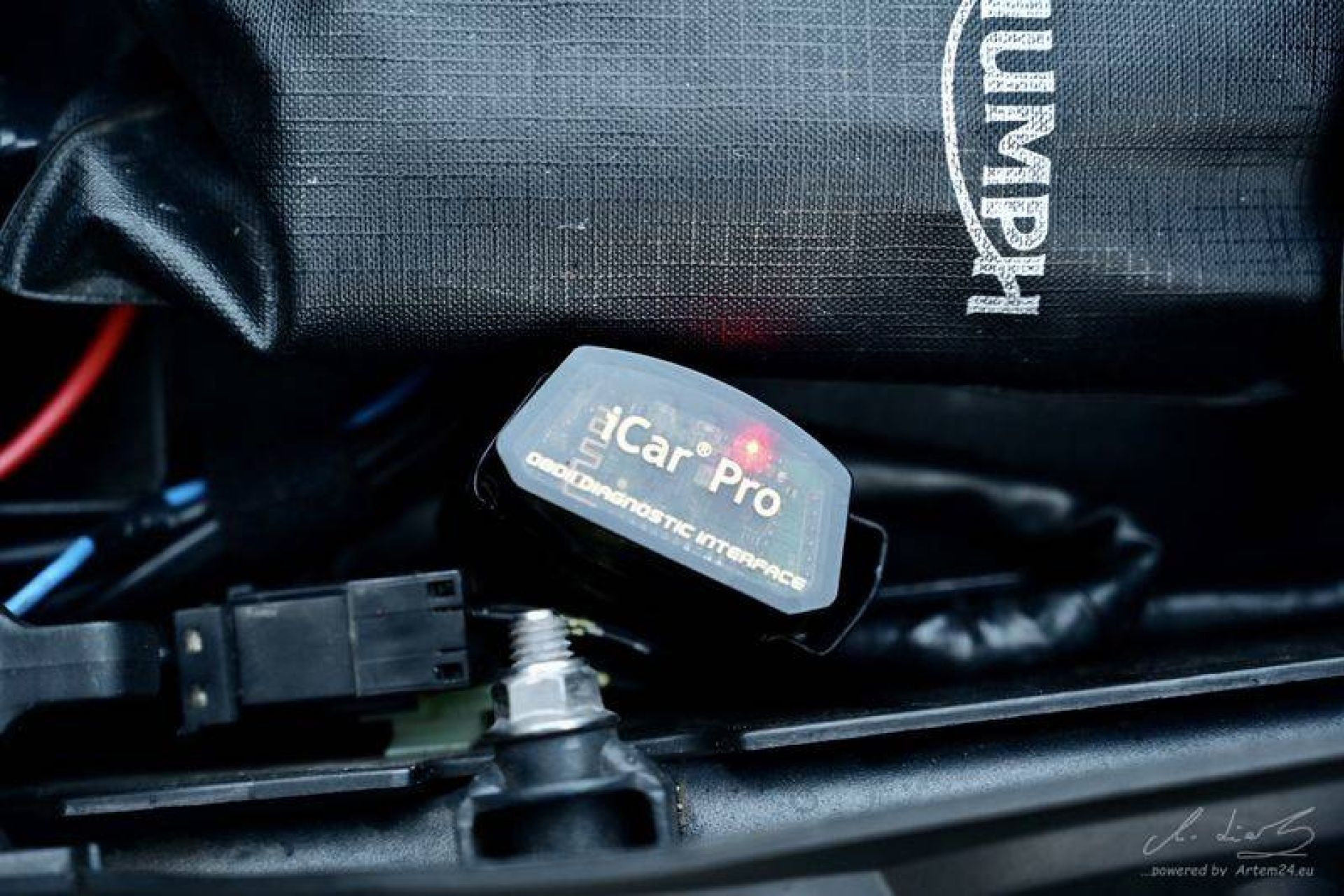 Zum Abrufen von Motordaten ist ein Bluetooth OBD Interface von iCar Pro unter der Sitzbank permanent eingerichtet, als App zum