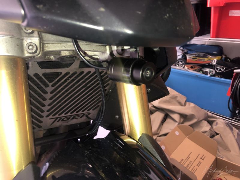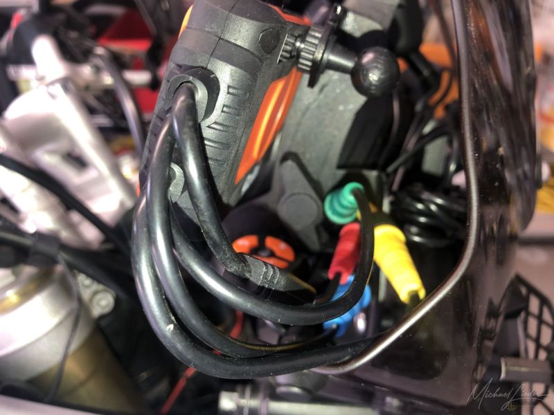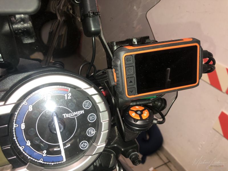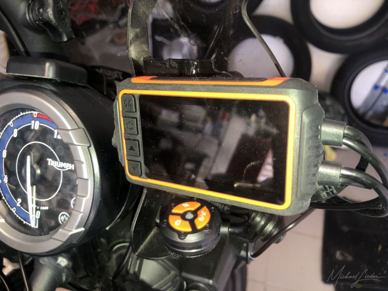 Ein wenig aufwendig ist die Verkabelung, da die Kabel wassergeschützt mit Steckern versehen sind und die Abgänge von der Kamera für meine Begriffe viel zu kurz sind, so ist hinter der Steuereinheit einfach zu viel Kabelsalat. Angeschlossen habe ich die M1 so, dass sie mit dem Motorstart automatisch angeht und die Aufzeichnung startet. So verbraucht sie beim Abstellen des Motorrades keinen Strom.