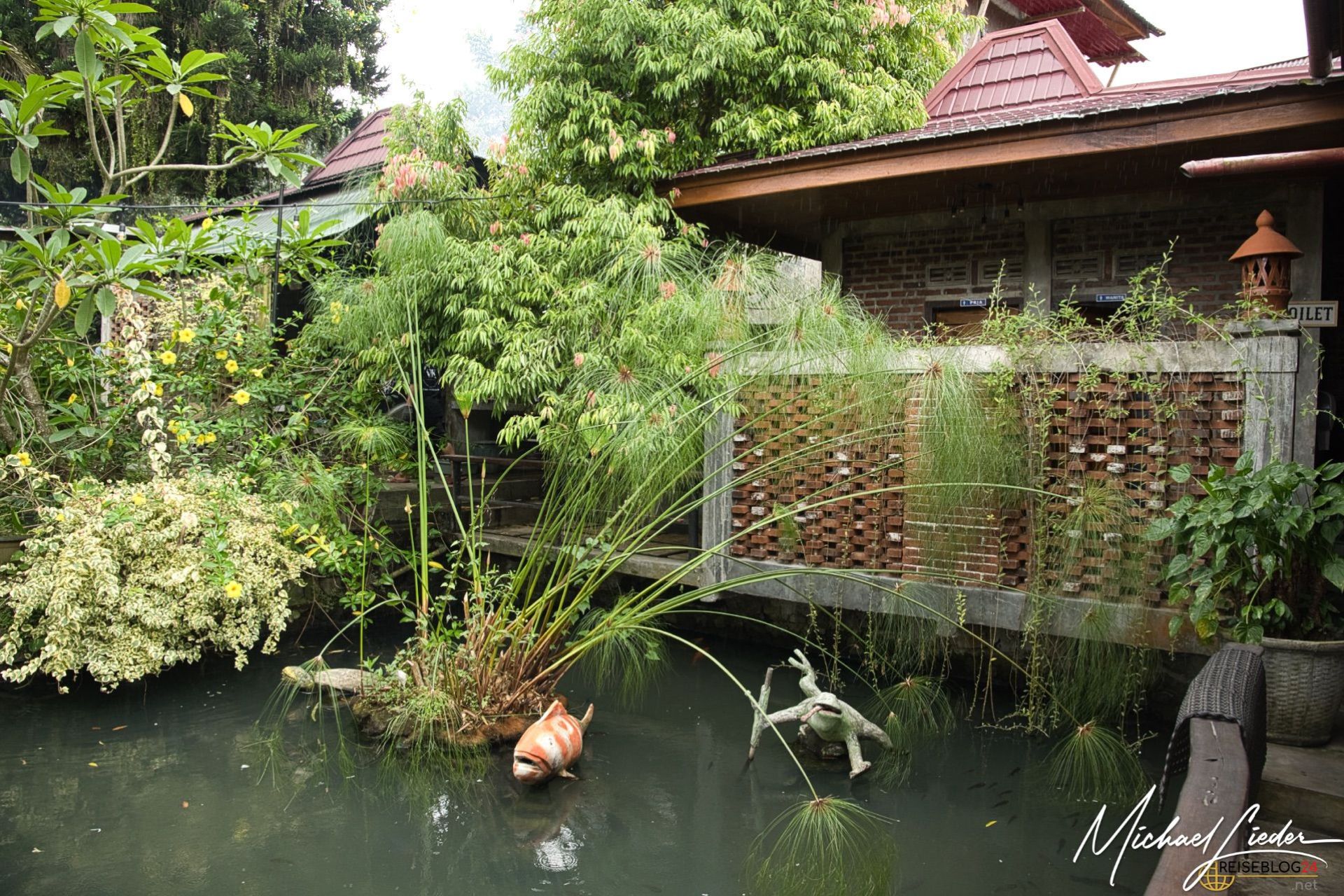 Das Restaurant liegt direkt an der Hauptstraße – und überrascht genau deshalb umso mehr. Kaum drin, ist der Verkehr vergessen. Stattdessen: viel Grün, kleine Teiche, Ruhe. Eine fast schon unverschämte Oase mitten im Alltag. Die Einrichtung ist geschmackvoll, nicht geschniegelt, sondern liebevoll. Bequeme Sofas, ein entspannter Außenbereich, alles mit einem Auge fürs Detail. Man bleibt automatisch länger sitzen, als man geplant hatte. Ein gutes Zeichen.