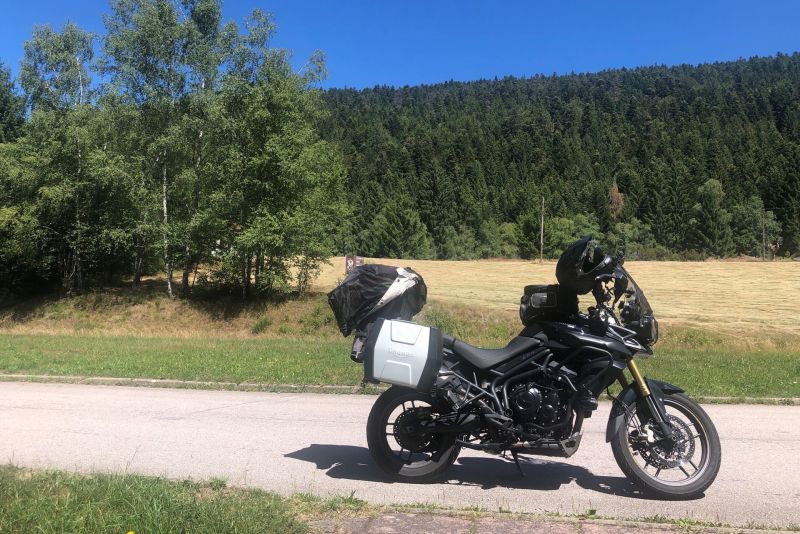 Die Landschaft um mich herum ist atemberaubend. Wälder und Wiesen erstrecken sich bis zum Horizont, in der Ferne sind die Gipfel der Vogesen zu sehen. Die Freiheit auf dem Motorrad ist hier oben grenzenlos, ich fühle mich wie eins mit der Natur.