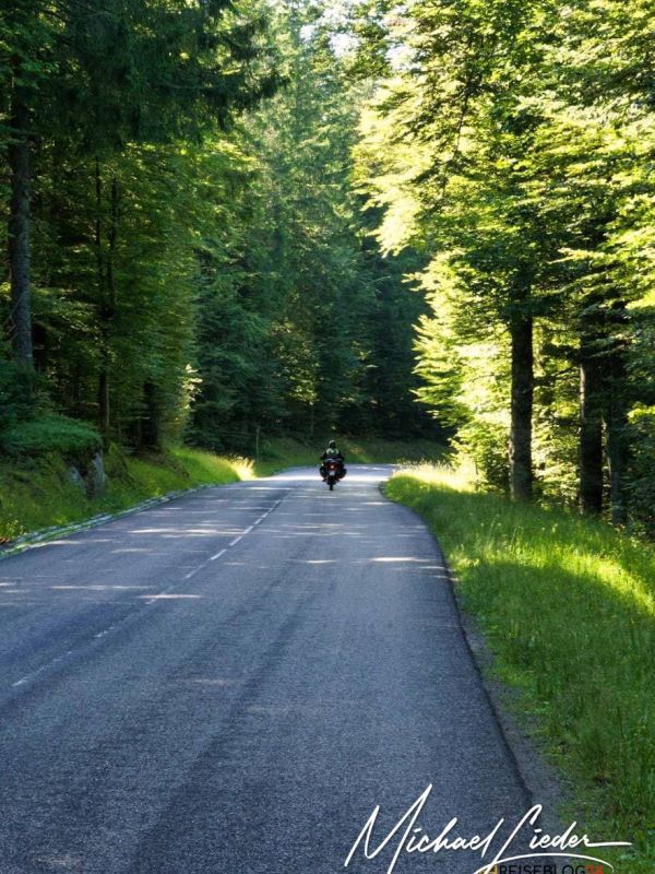 Gestärkt mache ich mich wieder auf den Weg. Die Straße führt nun weiter durch dichte Wälder, vorbei an schroffen Felsformationen und kristallklaren Bergseen. Die Kurven werden immer anspruchsvoller, aber die Herausforderung macht mir Spaß.
