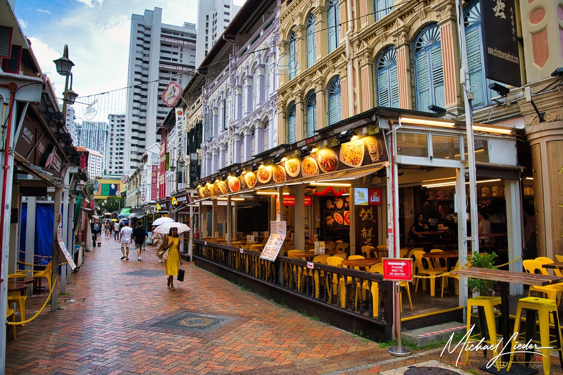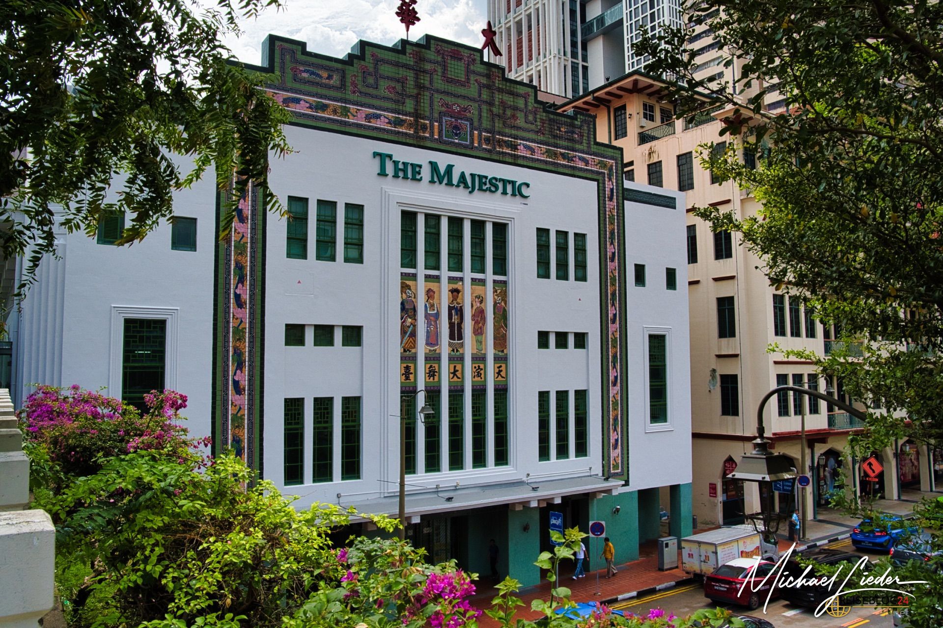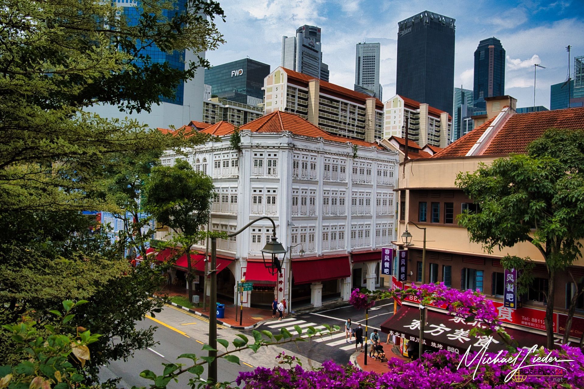 Bewundere die Mischung aus historischen Gebäuden, bunten Ladenhäusern und modernen Wolkenkratzern, die das Viertel prägen.