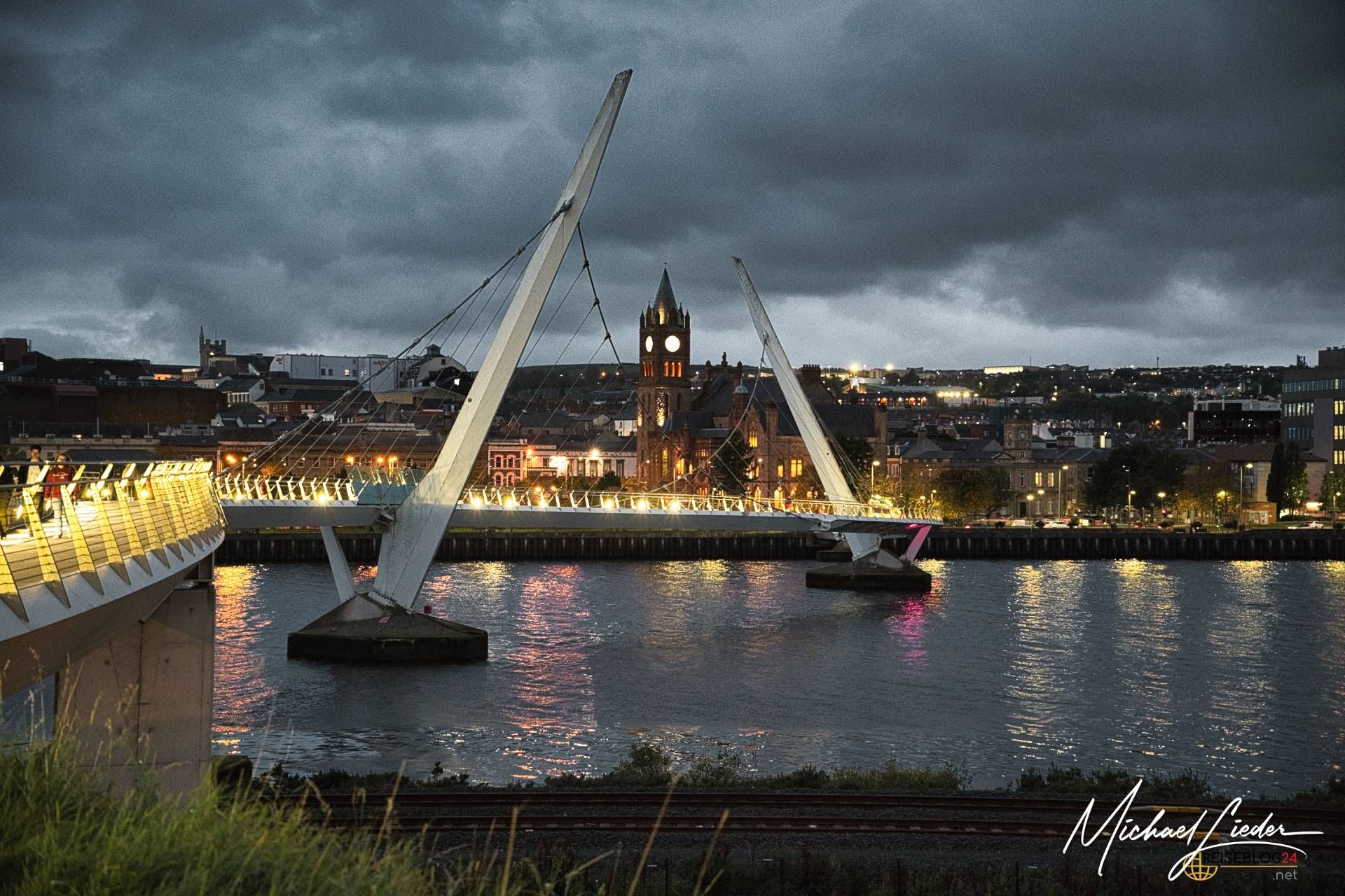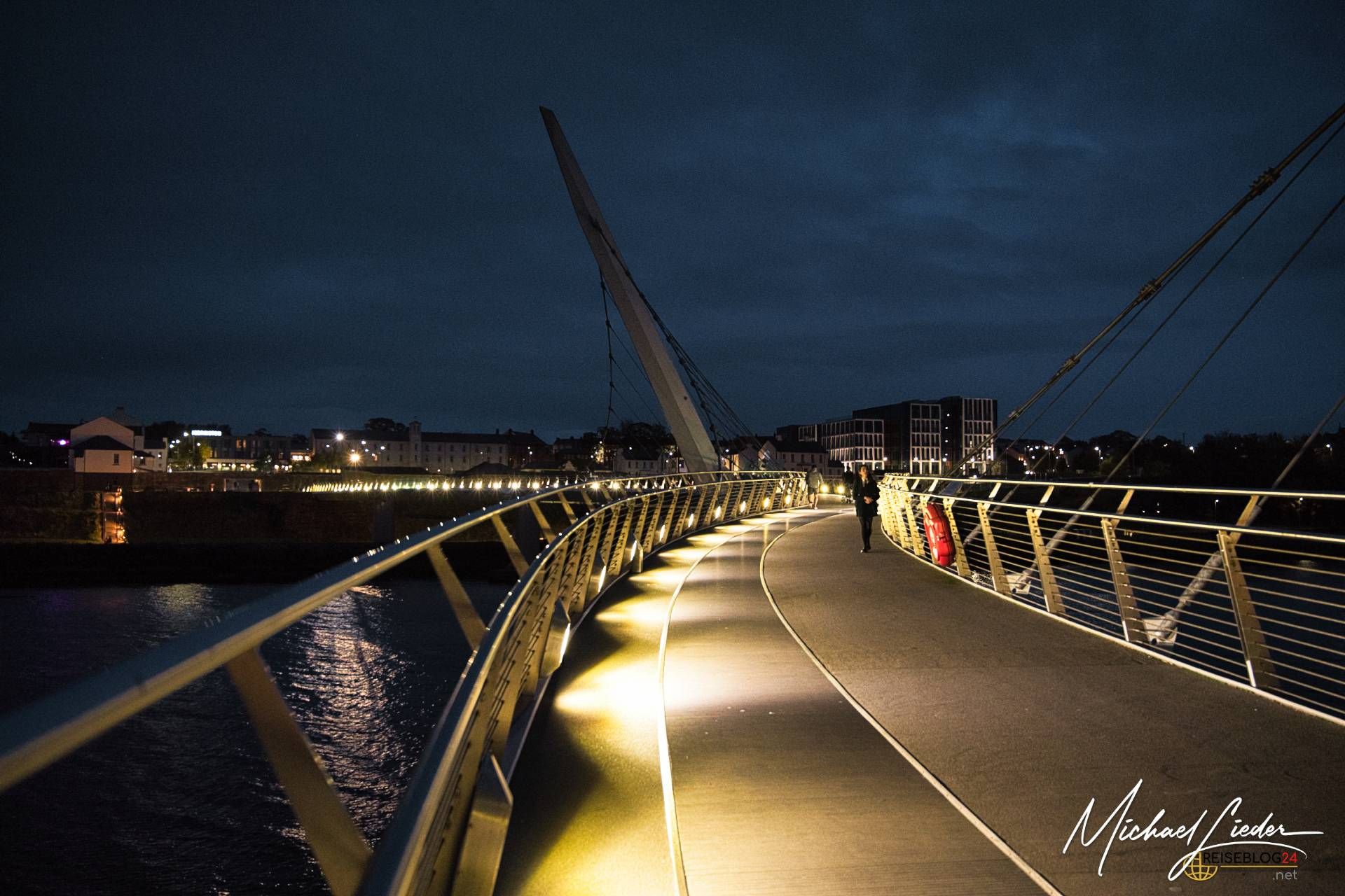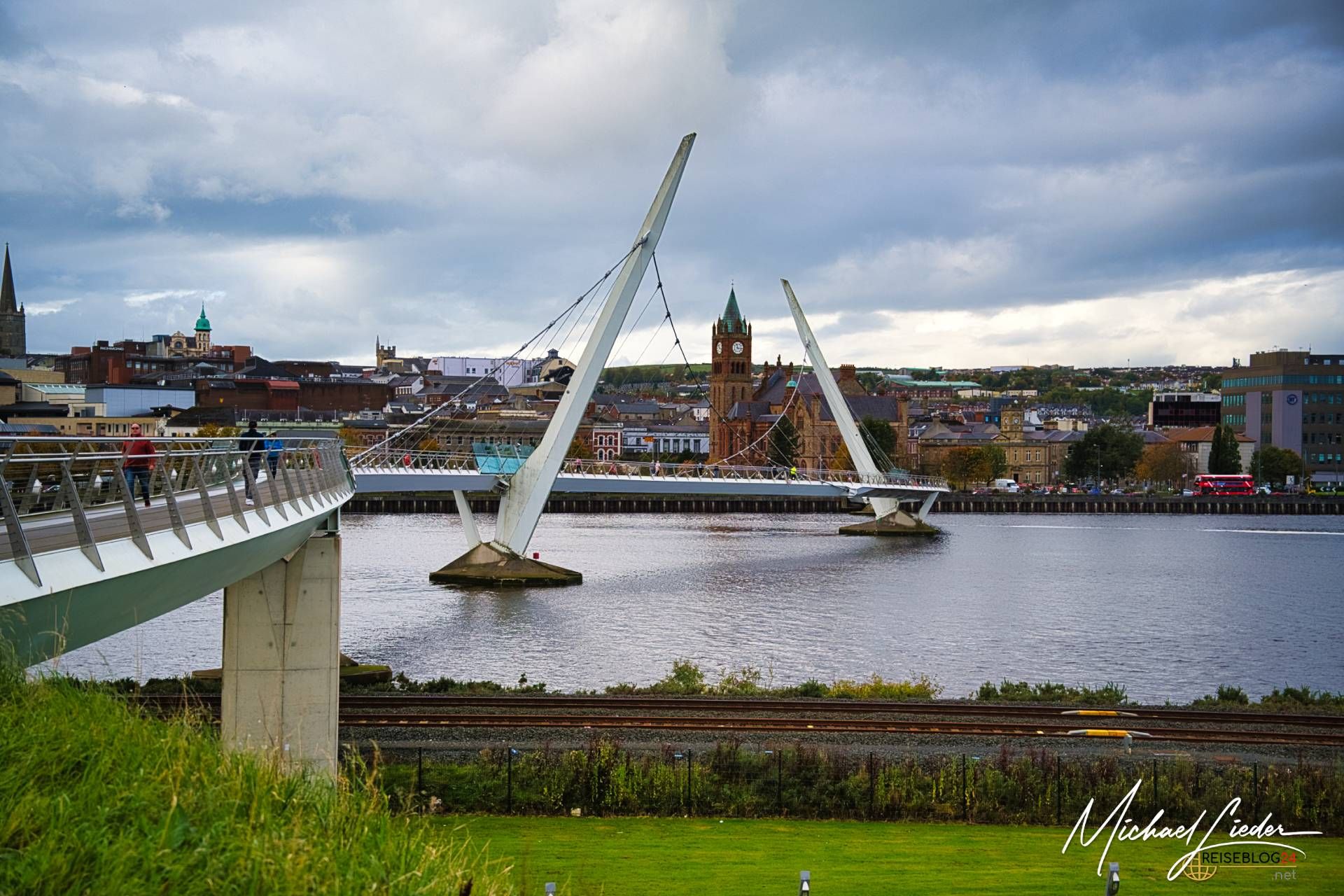 Die Peace Bridge, eröffnet 2011, verbindet die katholisch geprägte „Cityside“ mit der protestantischen „Waterside“ über den Fluss Foyle. Die Brücke symbolisiert die Hoffnung auf ein friedliches Miteinander und ist eines der schönsten Fotomotive in Derry.