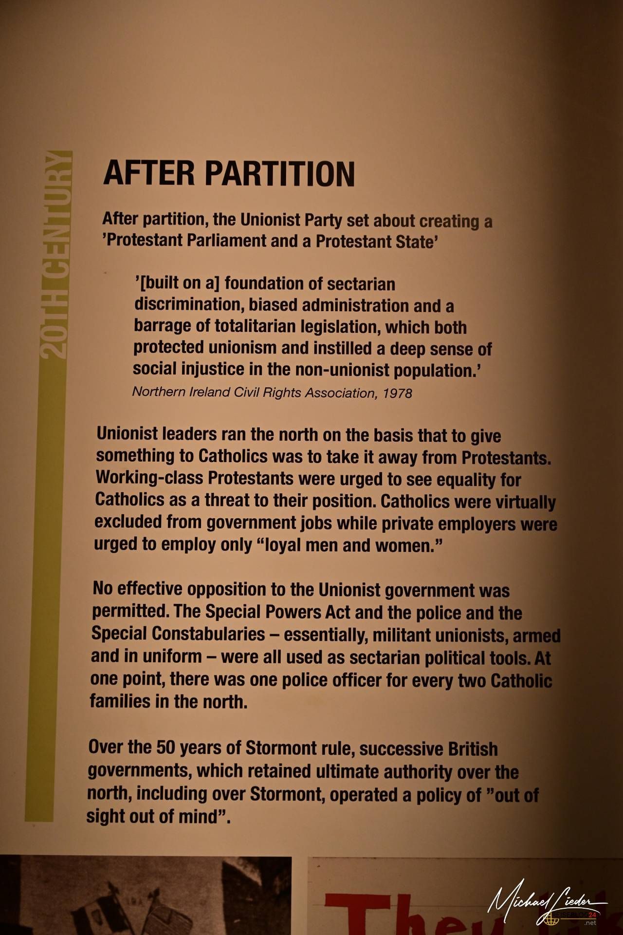 Es erzählt eindrucksvoll vom Aufstand eines überwiegend von Arbeitern bewohnten Stadtviertels, das nach jahrelanger Unterdrückung für seine Rechte kämpfte. Für uns, die wir Irland und seine Geschichte kennenlernen wollen, ist dieses Museum ein zentraler Ort zum Nachdenken – über den Sinn und Unsinn von Rivalitäten und Unterdrückung.