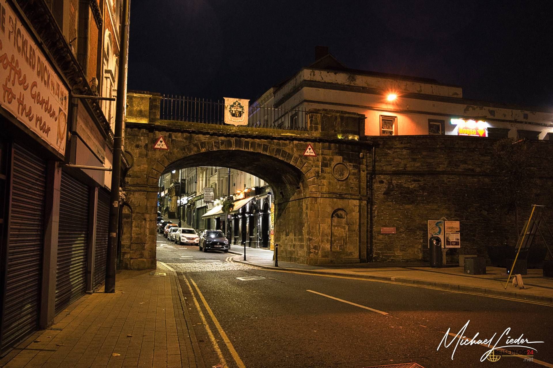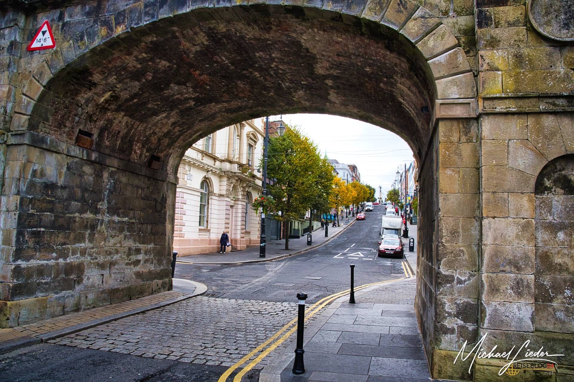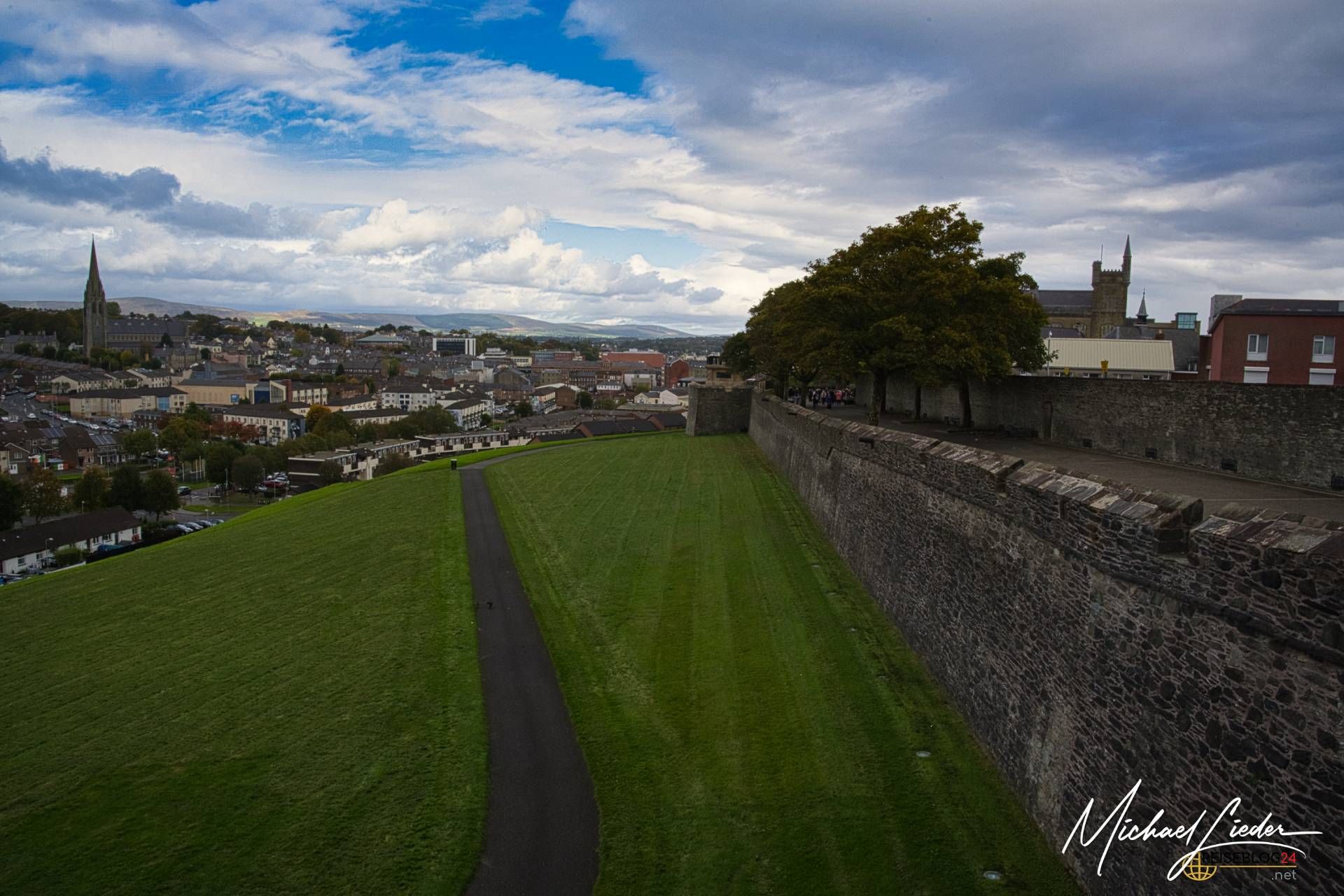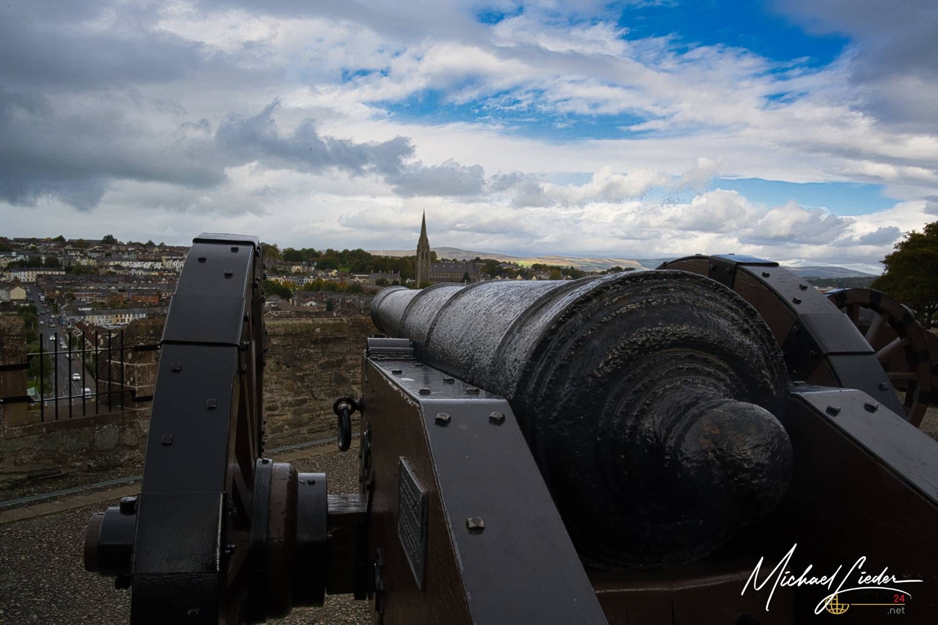 Eine der Hauptattraktionen Derrys sind natürlich die Stadtmauern, die seit dem Bau im 17. Jahrhundert fast vollständig erhalten geblieben sind. Sie ziehen sich in einem ungefähr 1,5 Kilometer langen Kreis um die Altstadt und bieten an einigen Stellen einen unglaublichen Blick über die Stadt und den Fluss Foyle. Der Mauer-Rundgang ist kostenlos und kann von verschiedenen Einstiegspunkten begonnen werden – ich empfehle den Start bei Bishop’s Gate, einem der beeindruckenden Stadttore.