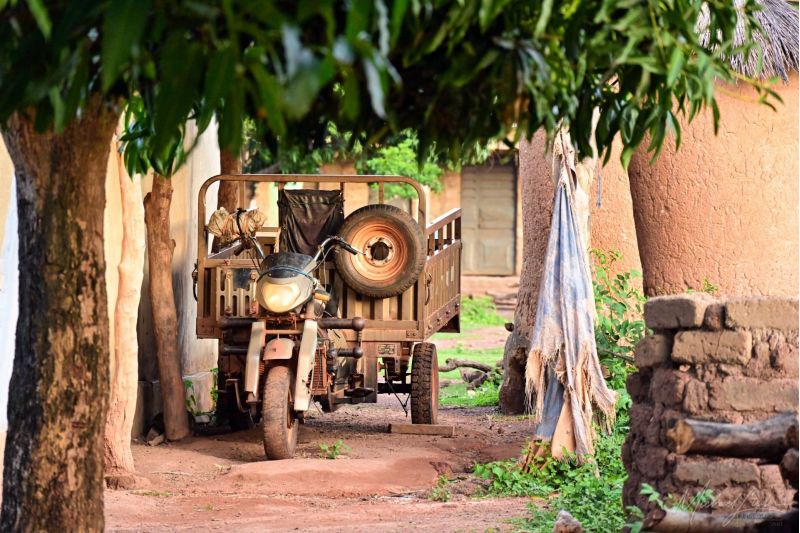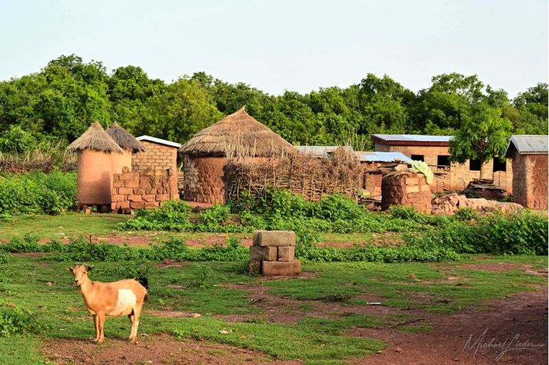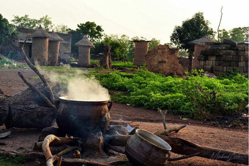 Aber der Reihe nach: Bevor wir in Niofoin fotografieren dürfen, müssen wir zuerst die Erlaubnis des Dorfältesten einholen. Also lassen wir unsere Kameras im Auto und machen uns auf den Weg durch das Dorf. Die Straßen sind teils staubig, doch vielerorts überraschend grün. Unterwegs erfahren wir, dass die geheimnisvollen Fetischhäuser unter keinen Umständen fotografiert werden dürfen – ein erster Hinweis darauf, wie tief hier Tradition und Respekt verwurzelt sind.