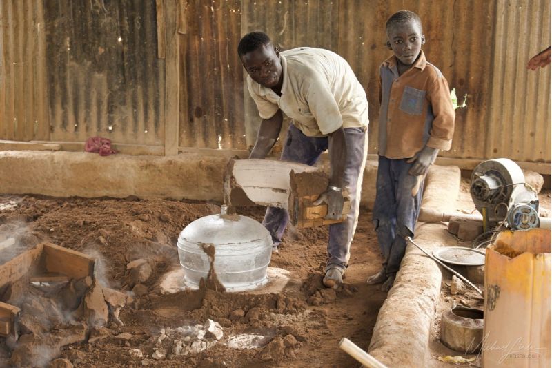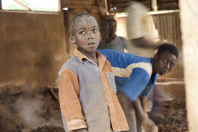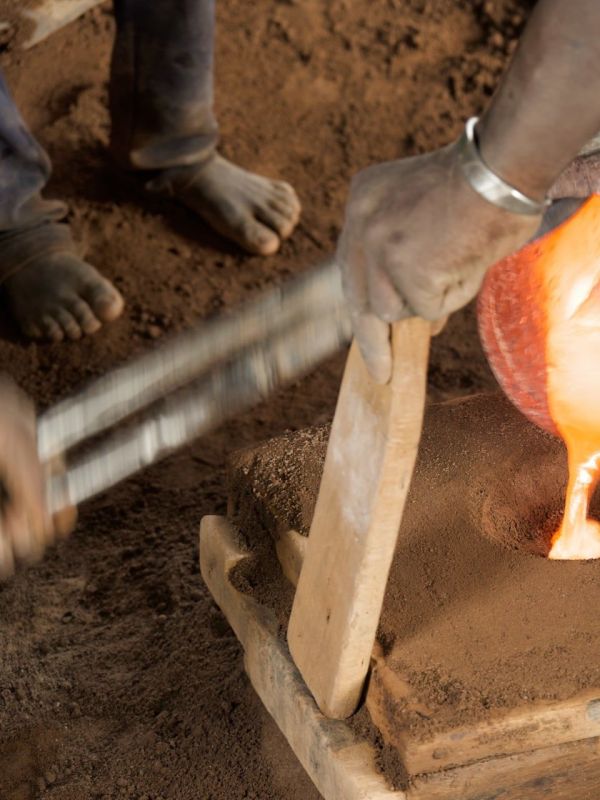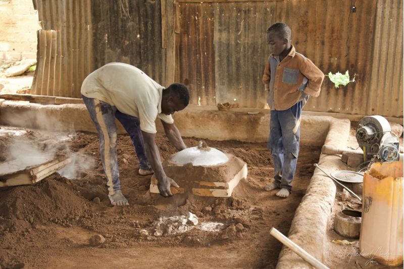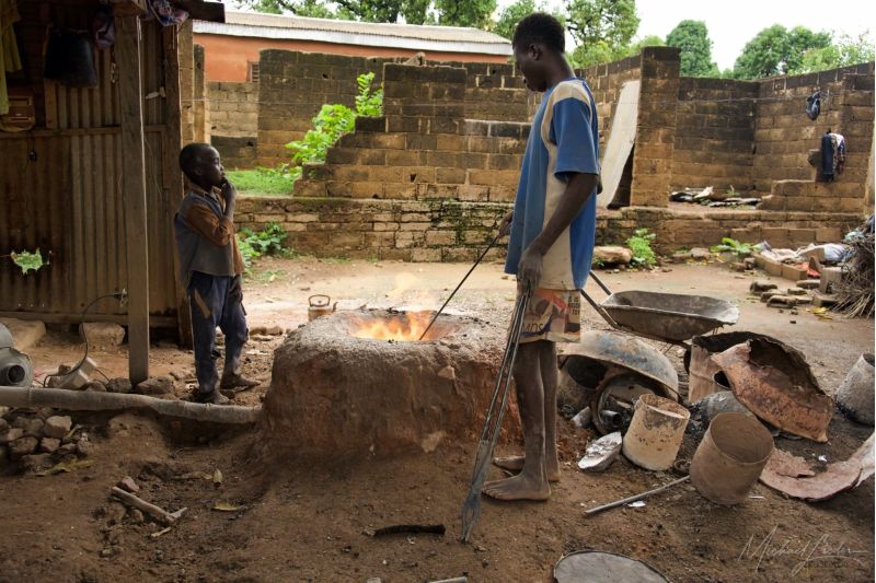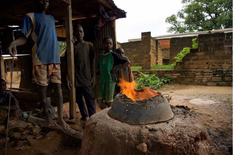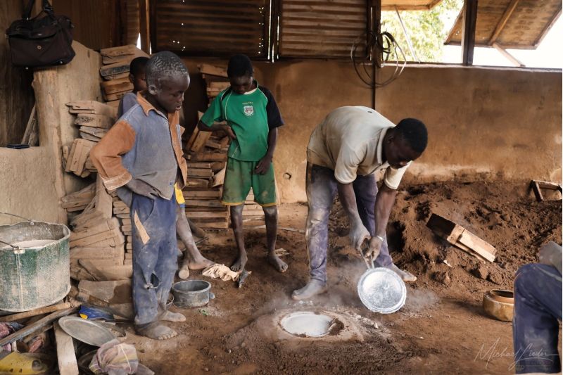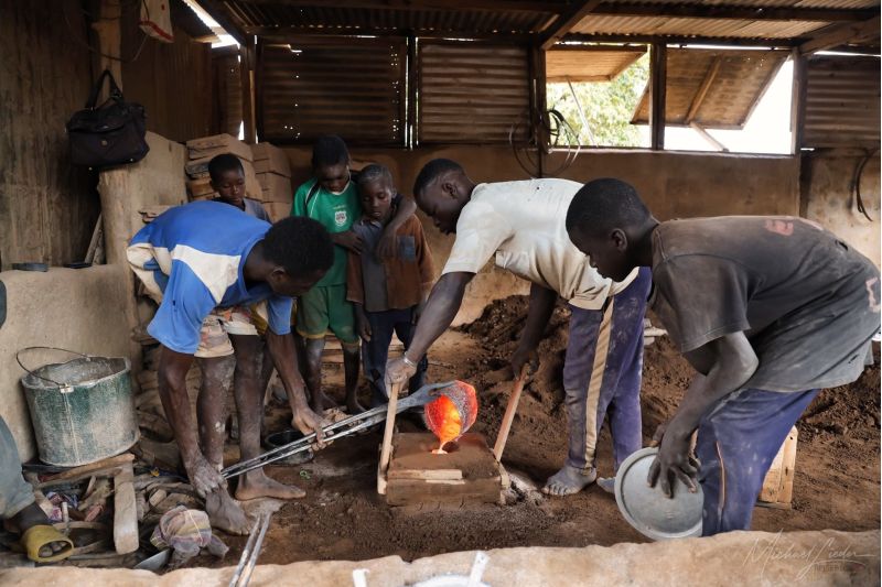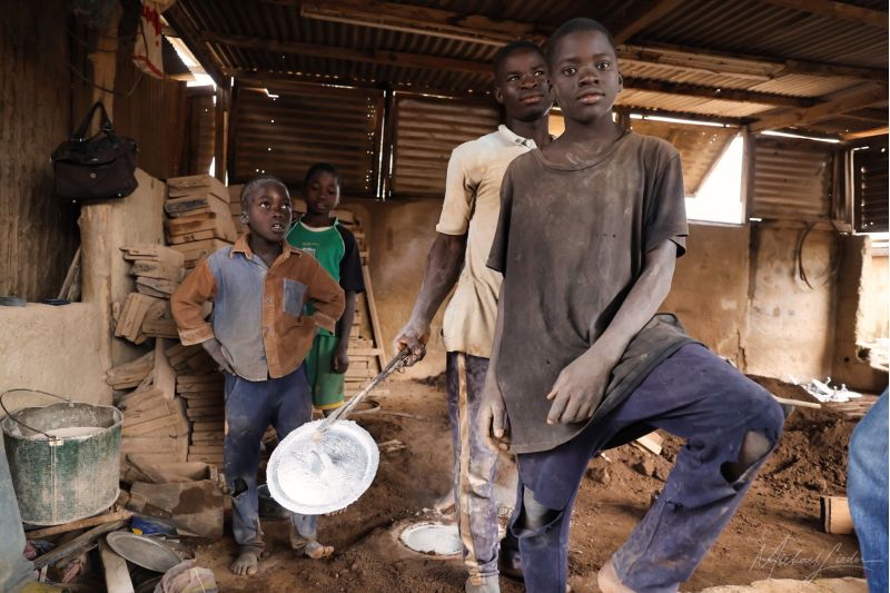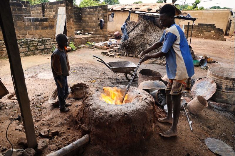 Der Werkstattbesitzer, ein älterer Mann mit ruhiger Autorität, dirigiert die Arbeit. Doch seine „Mitarbeiter“ sind Kinder – kaum älter als zehn. Kleine Körper in einem Umfeld aus Feuer, Rauch und glühender Hitze. Ihre Augen brennen vom Qualm, ihre Gesichter sind mit Ruß bedeckt. Manche tragen Brandnarben, andere zerschlissene Kleidung. Und doch arbeiten sie weiter, still, konzentriert, wie kleine Erwachsene, die keine Wahl haben. In diesem Moment wird mir bewusst, wie viel Glück in meiner eigenen Selbstverständlichkeit liegt. Dass Kinder in meiner Welt spielen dürfen, dass Bildung keine Frage von Überleben ist. Hier, in Korhogo, kostet Kindheit ihren Preis – und manchmal ist er zu hoch.