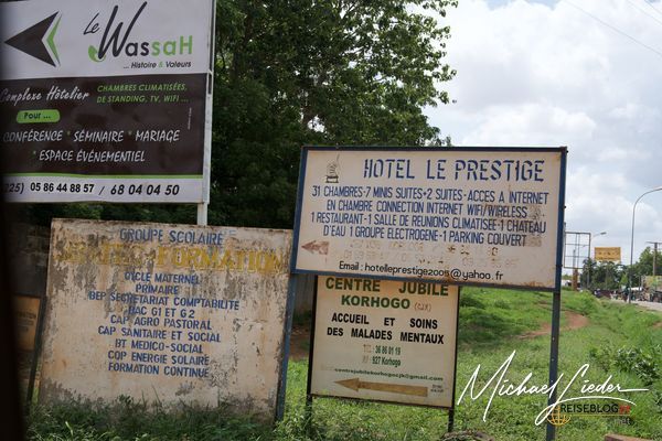 Das Hotel liegt mitten in Korhogo, leider kann ich gar nicht richtig sagen, wo genau. In Korhogo gibt es nahezu keine Straßennamen und ich habe die Anschrift auch nicht gefunden.