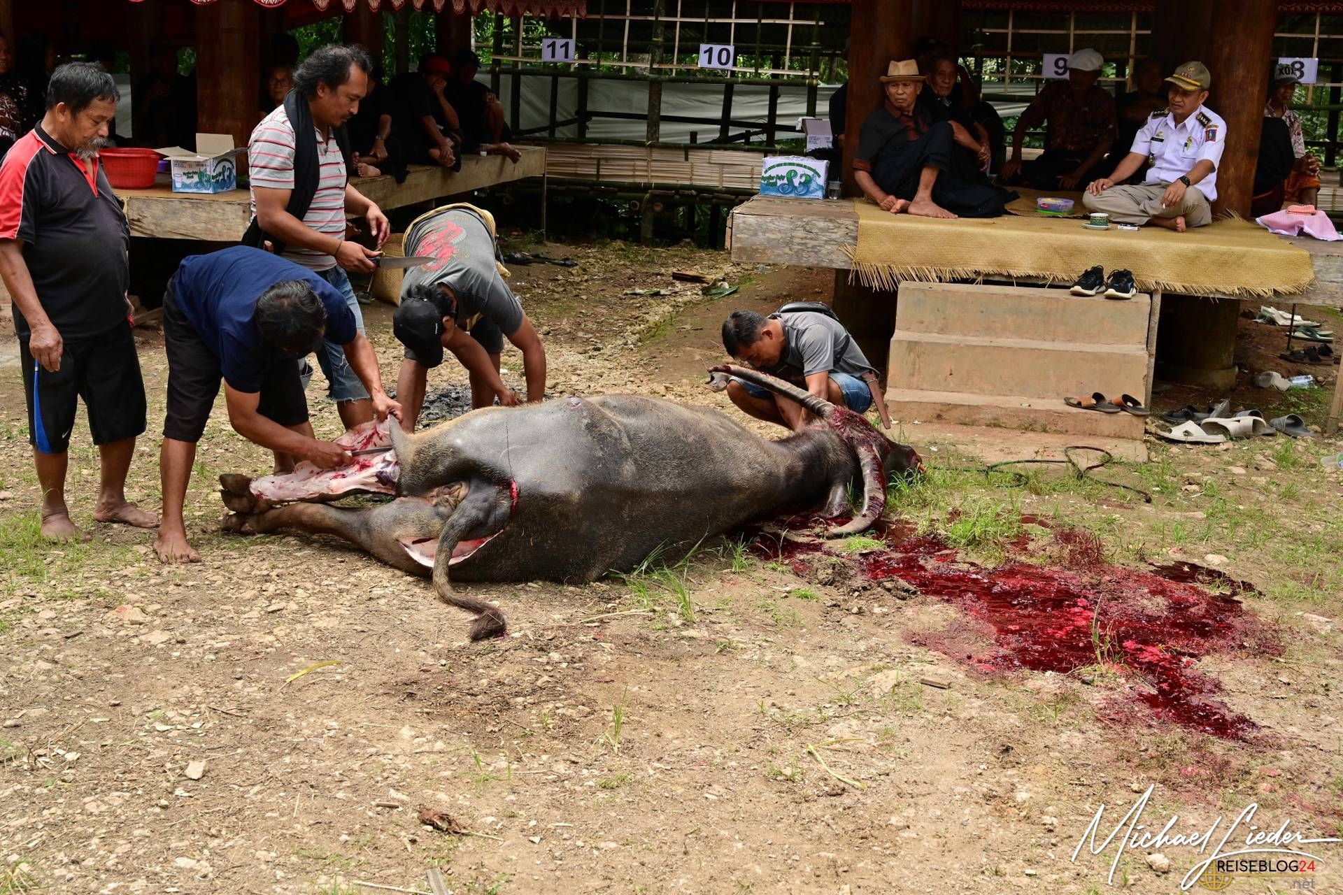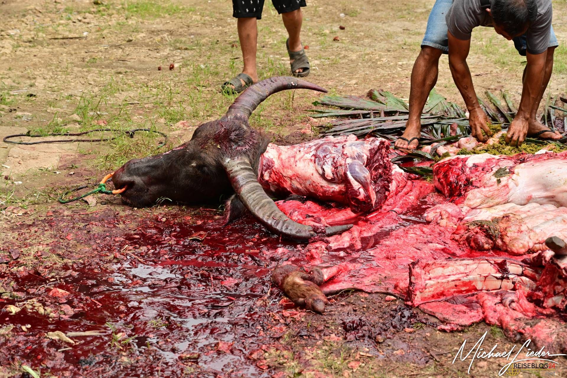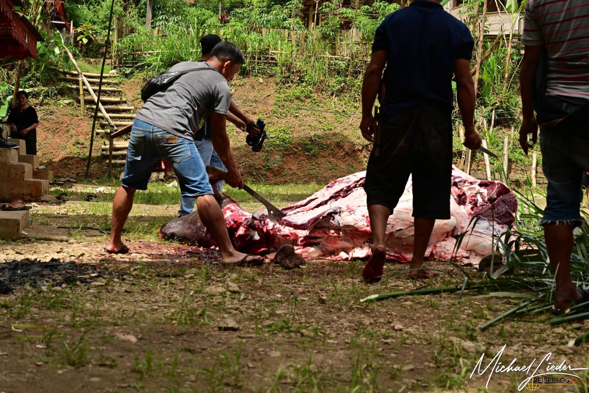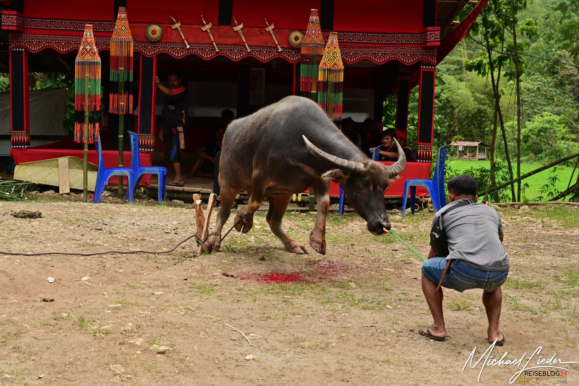 Bitte sei darauf vorbereitet, dass die folgende Bilderserie des Büffelopfers emotional herausfordernd sein kann. Während des Rituals, das wir miterleben durften, wurden insgesamt zwölf Wasserbüffel geopfert – ein tief verwurzelter Brauch mit spiritueller Bedeutung für die lokale Gemeinschaft. Diese Zeremonie erstreckte sich über mehrere Tage und war für uns sowohl beeindruckend als auch bewegend.