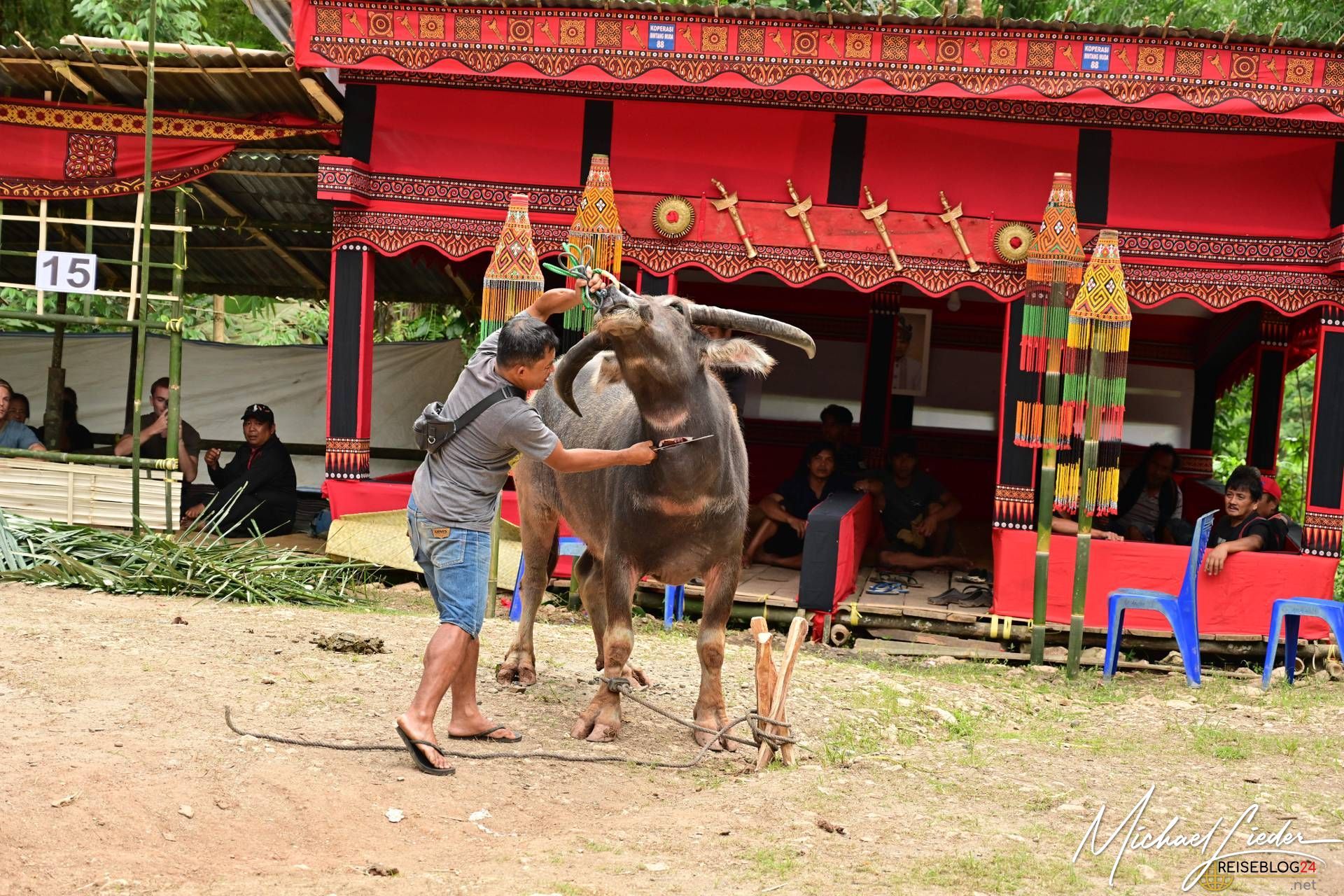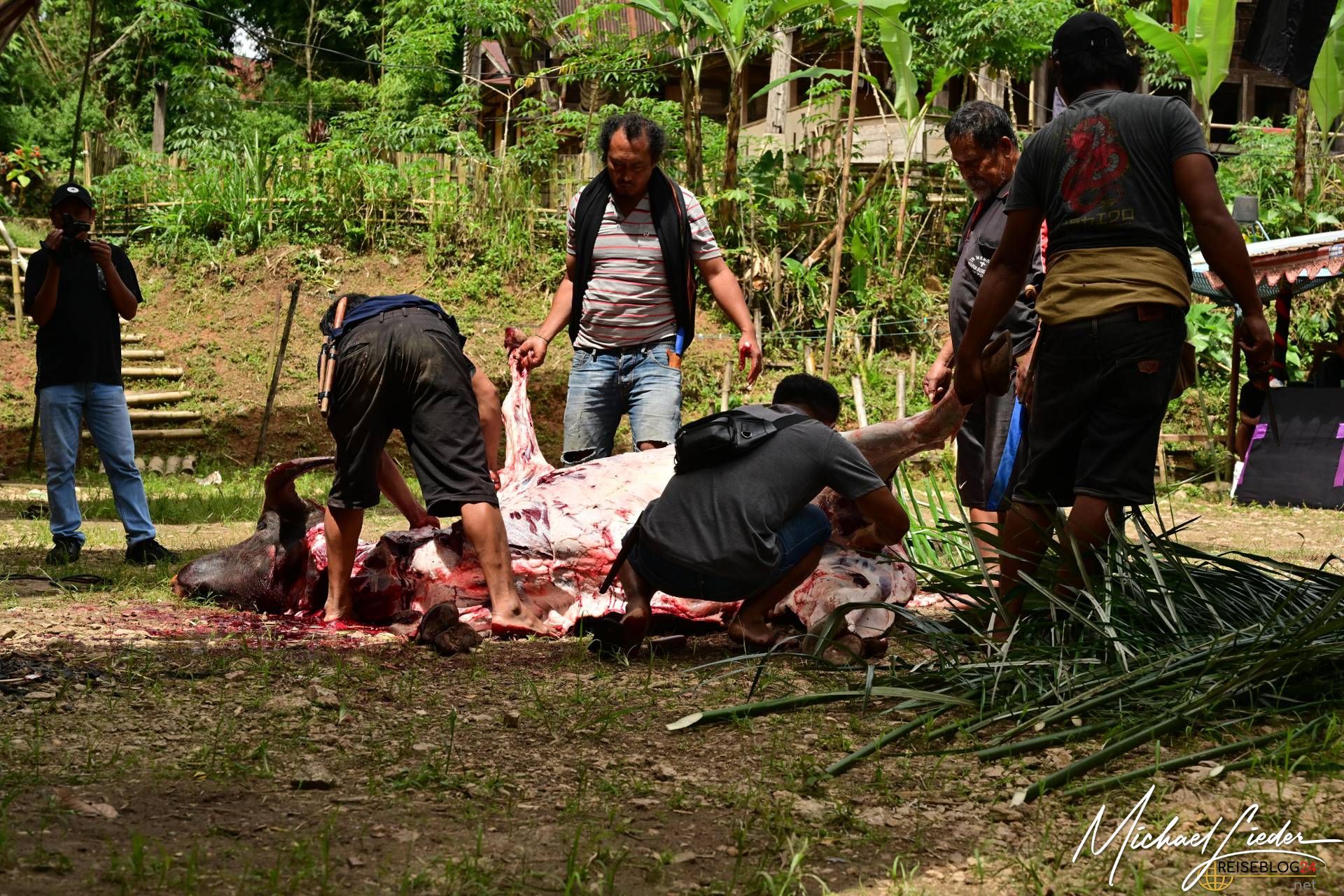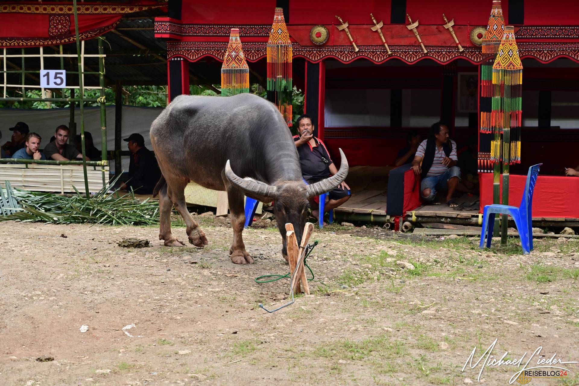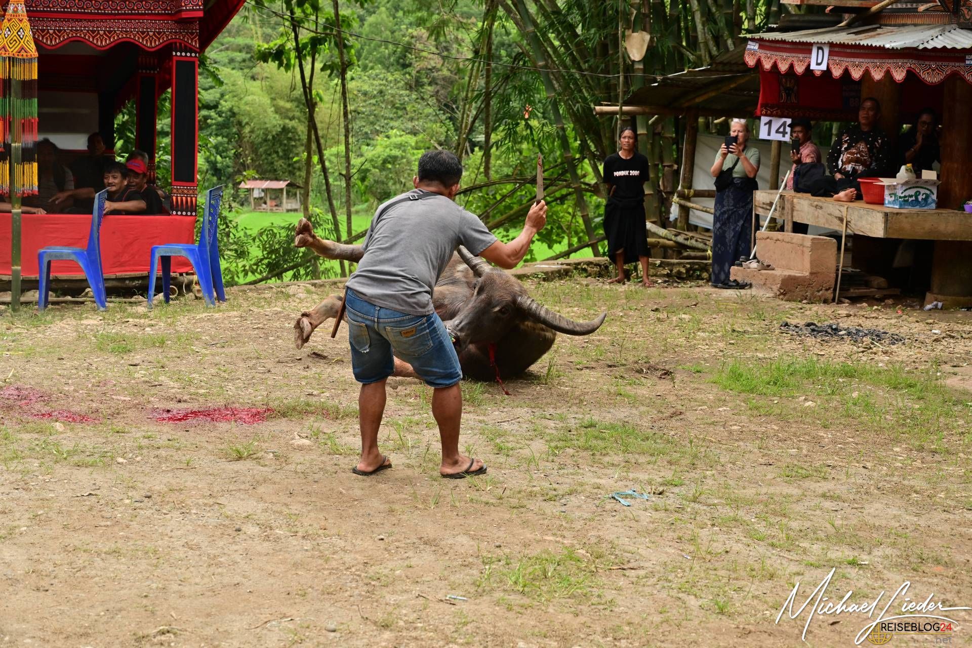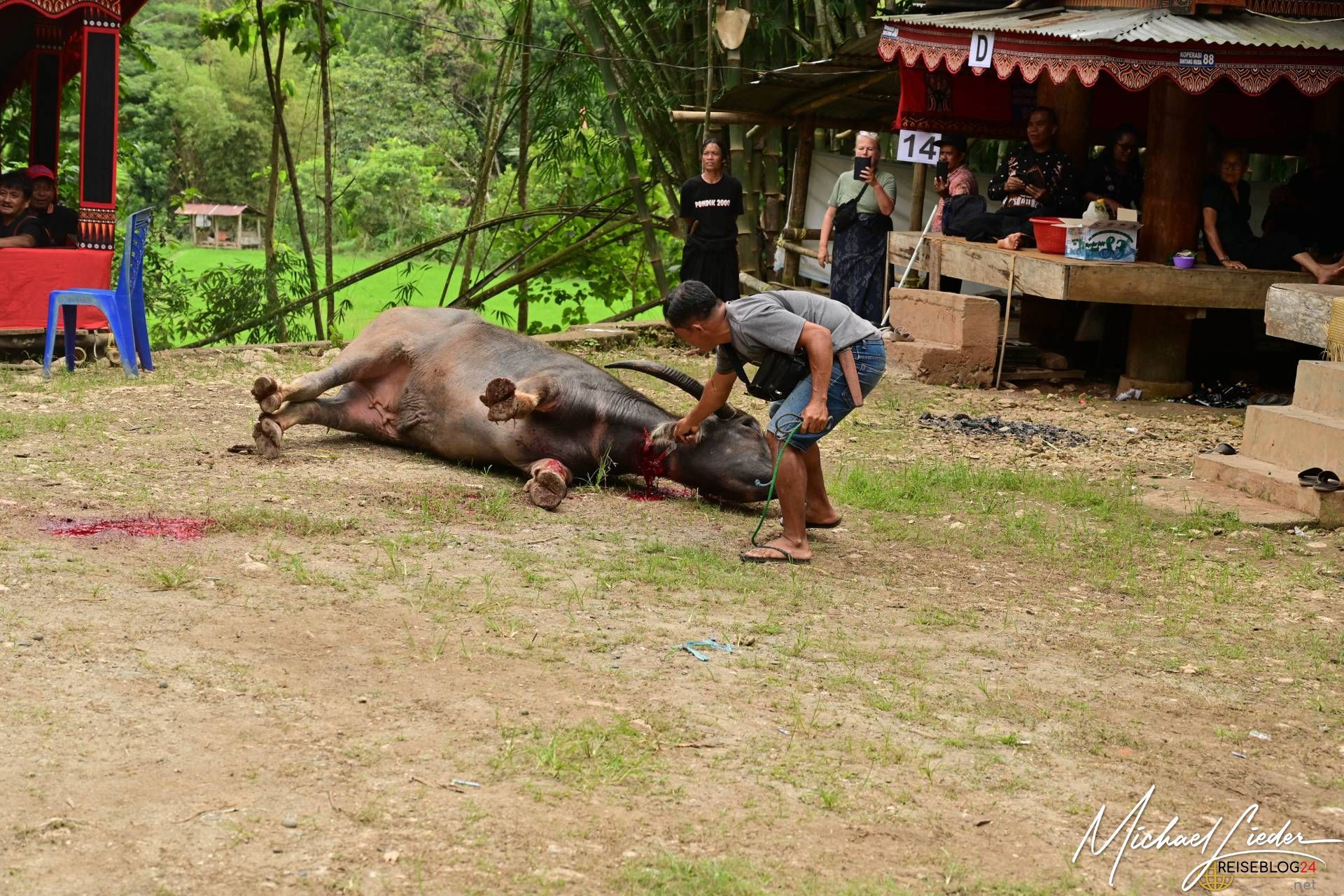 Bitte sei darauf vorbereitet, dass die folgende Bilderserie des Büffelopfers emotional herausfordernd sein kann. Während des Rituals, das wir miterleben durften, wurden insgesamt zwölf Wasserbüffel geopfert – ein tief verwurzelter Brauch mit spiritueller Bedeutung für die lokale Gemeinschaft. Diese Zeremonie erstreckte sich über mehrere Tage und war für uns sowohl beeindruckend als auch bewegend.