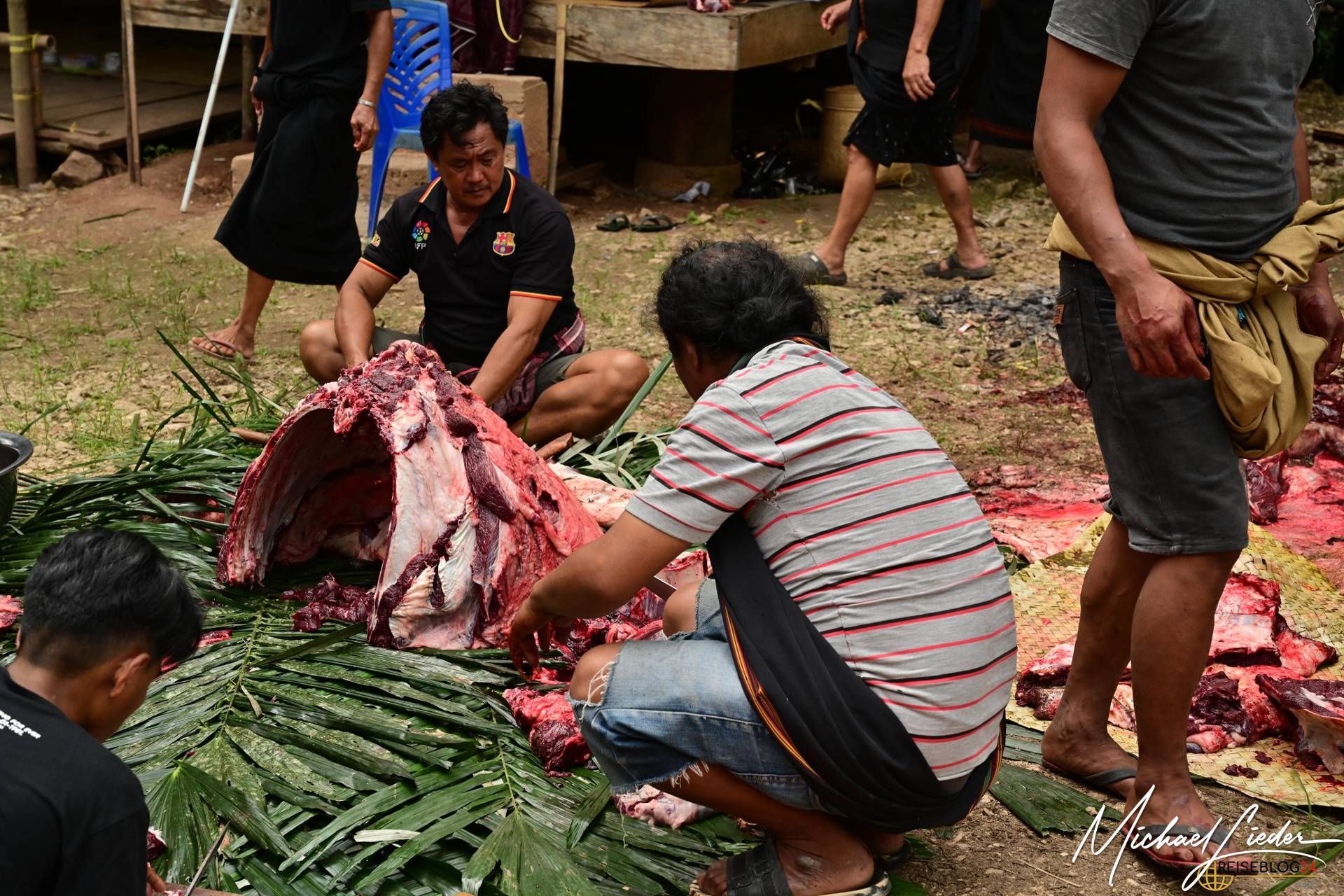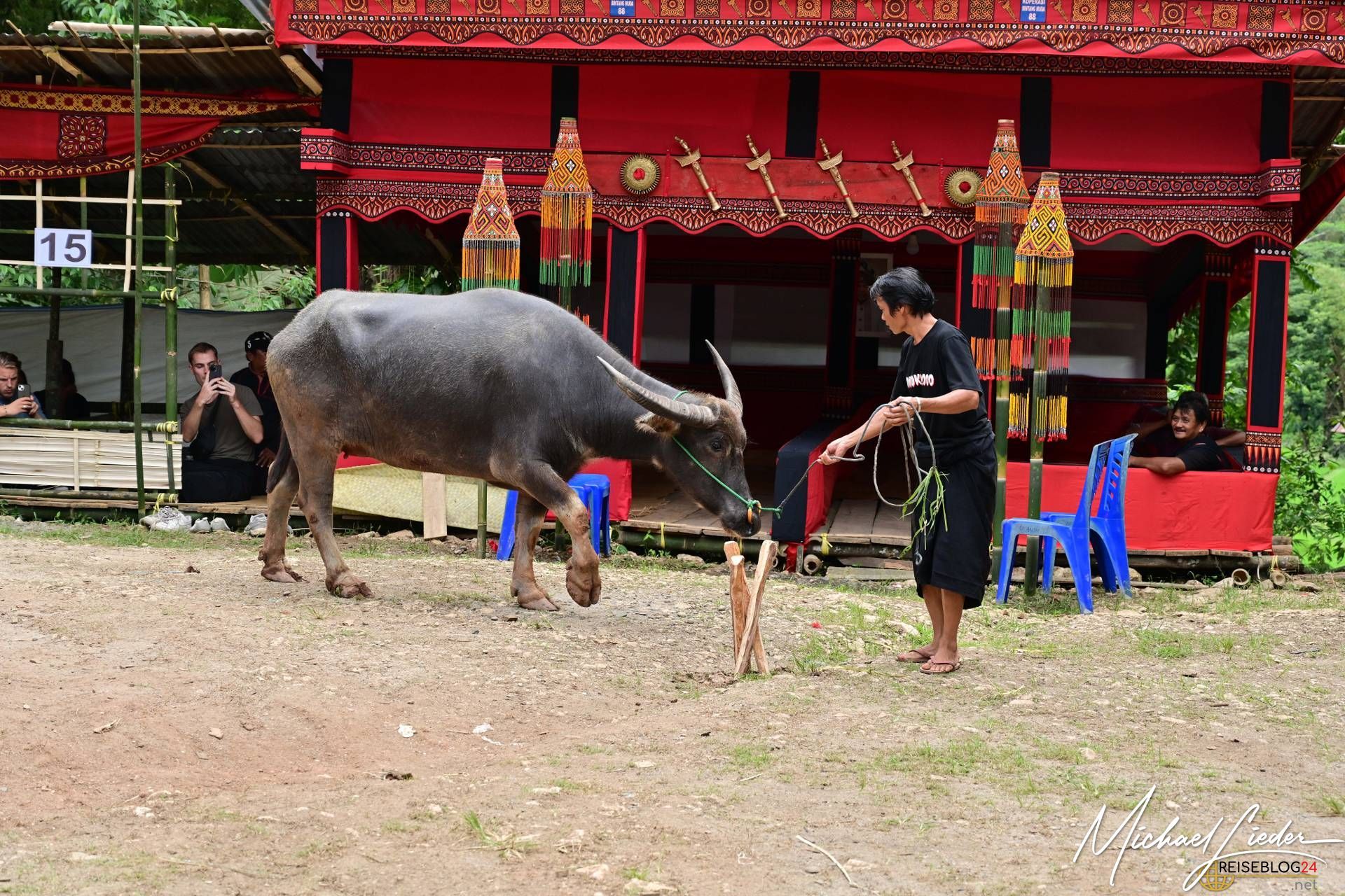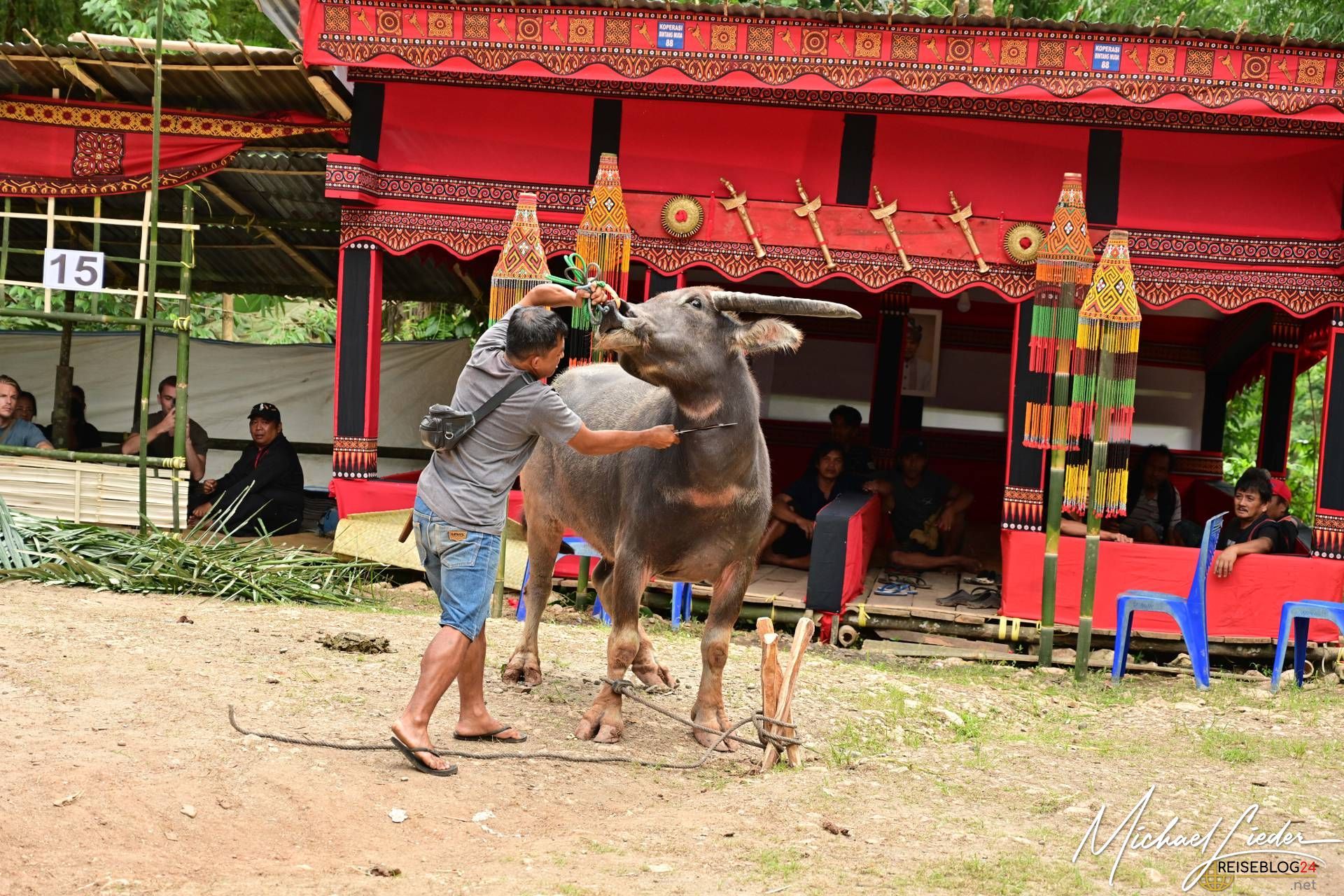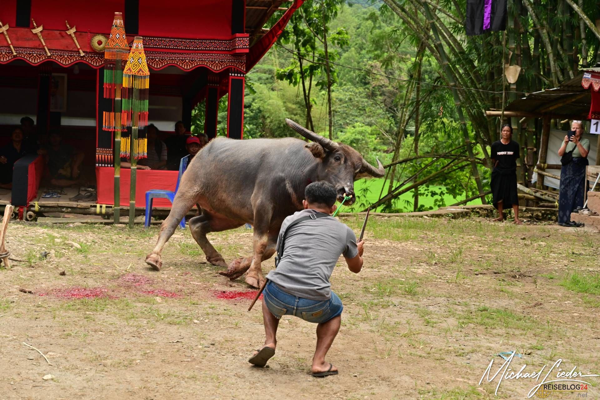 Bitte sei darauf vorbereitet, dass die folgende Bilderserie des Büffelopfers emotional herausfordernd sein kann. Während des Rituals, das wir miterleben durften, wurden insgesamt zwölf Wasserbüffel geopfert – ein tief verwurzelter Brauch mit spiritueller Bedeutung für die lokale Gemeinschaft. Diese Zeremonie erstreckte sich über mehrere Tage und war für uns sowohl beeindruckend als auch bewegend.