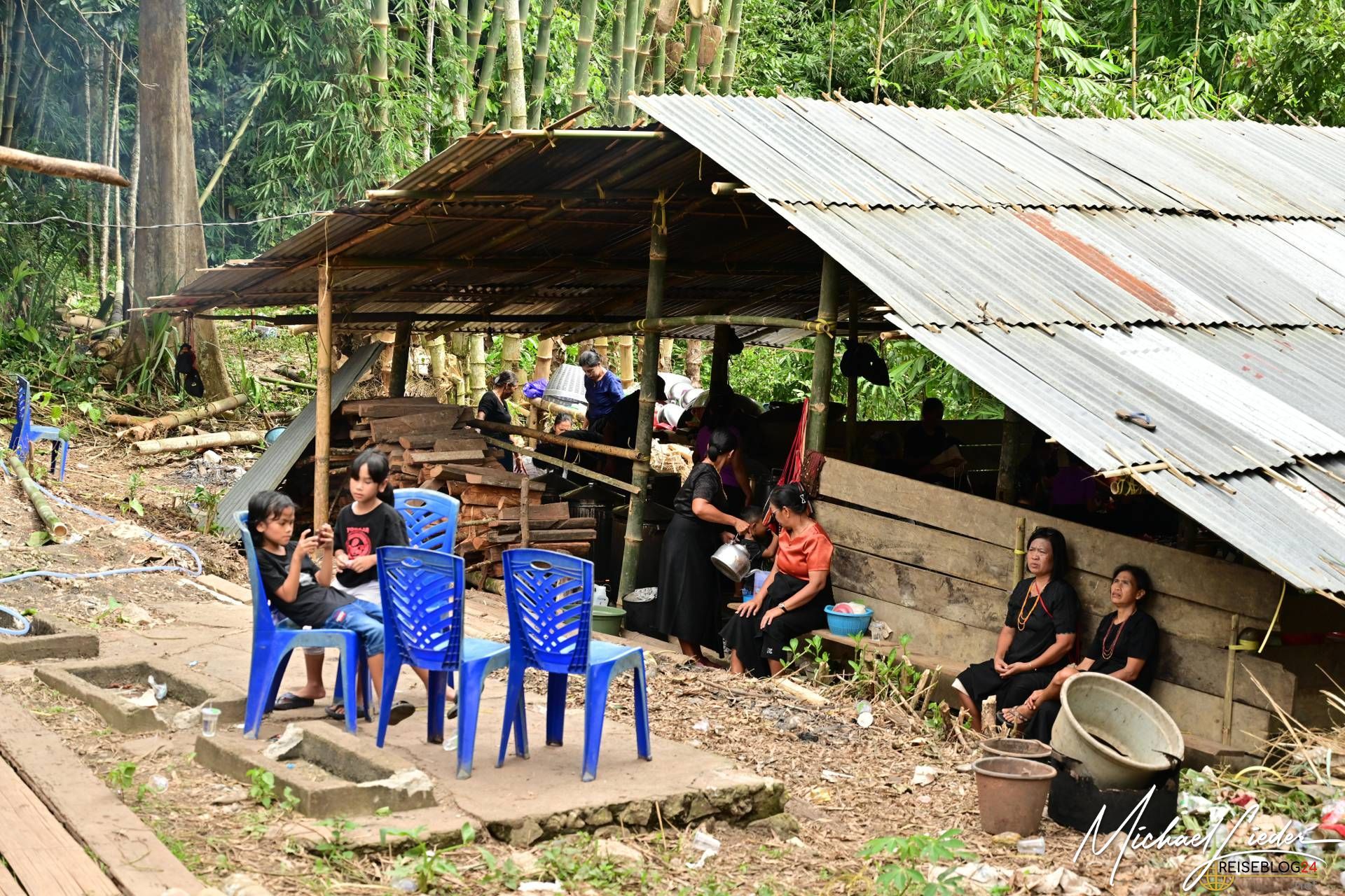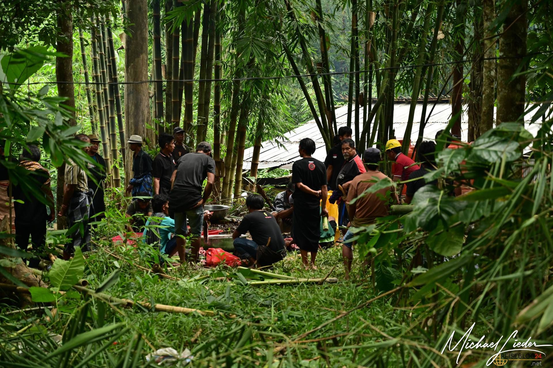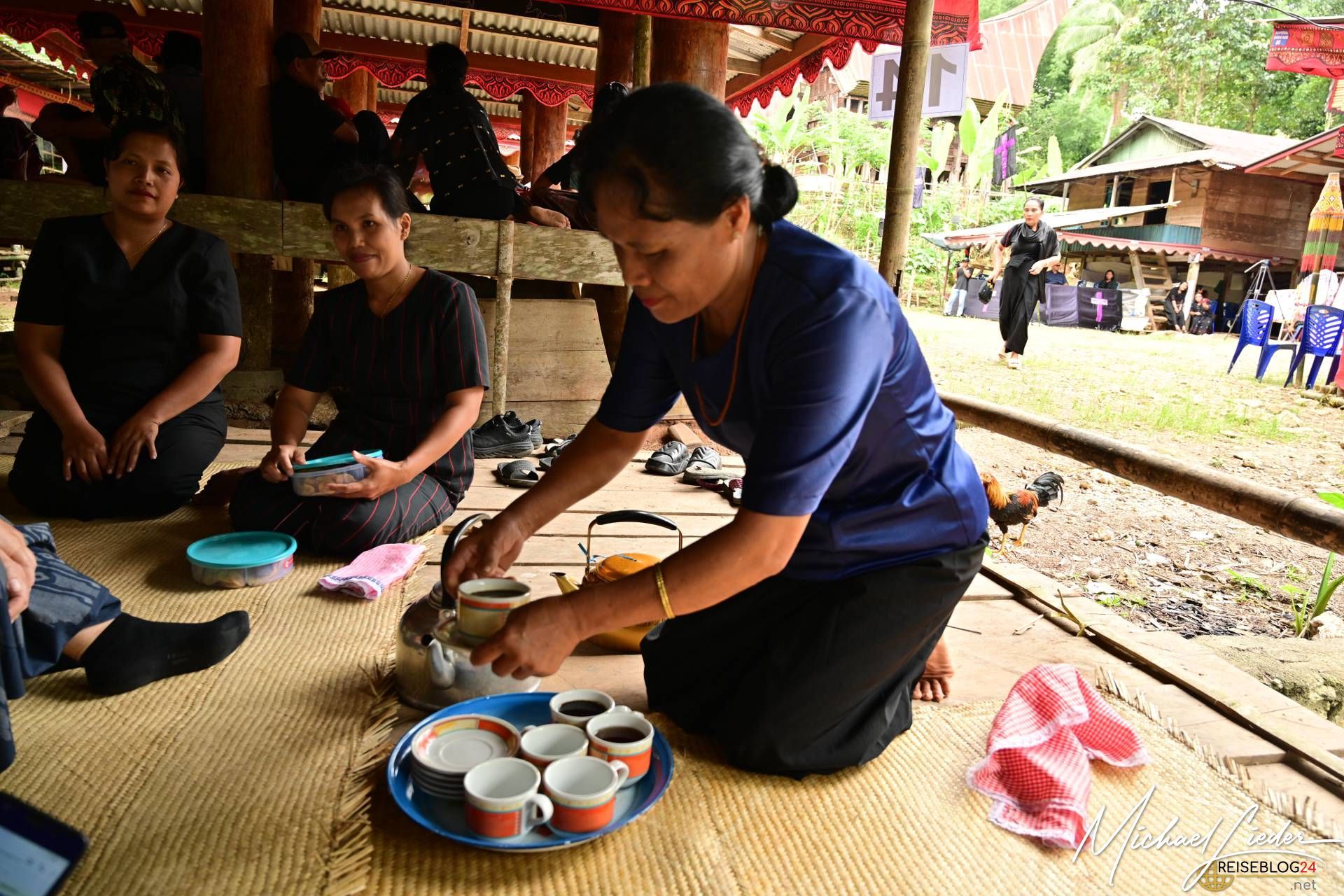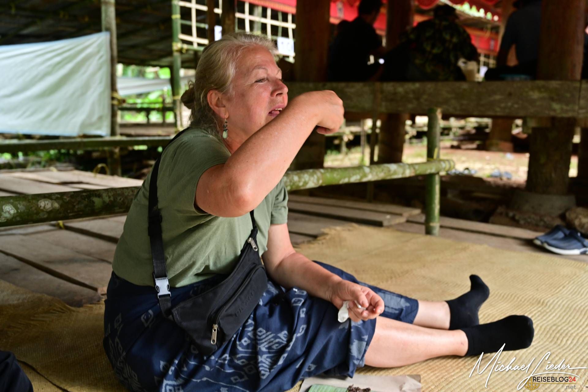 Doch trotz der Tragik des Abschieds ist die Atmosphäre keineswegs nur von Trauer geprägt. Die Familie, Freunde und die gesamte Gemeinschaft kommen zusammen, um Erinnerungen zu teilen, gemeinsam zu essen, zu singen und das Leben des Verstorbenen zu feiern. Auch wir durften an einer solchen Zeremonie teilnehmen und wurden mit offenen Armen empfangen. Wir probierten das traditionelle Totenmahl: Schweinefleisch, eingelegt und mit Gewürzen und Kräutern in Bambusrohren gegart, serviert mit Reis und heißem Tee. Gegessen wurde, wie in der Region üblich, mit den Fingern. Als Zeichen des Respekts erhielten wir Sarongs, um uns in die Gemeinschaft einzufügen.