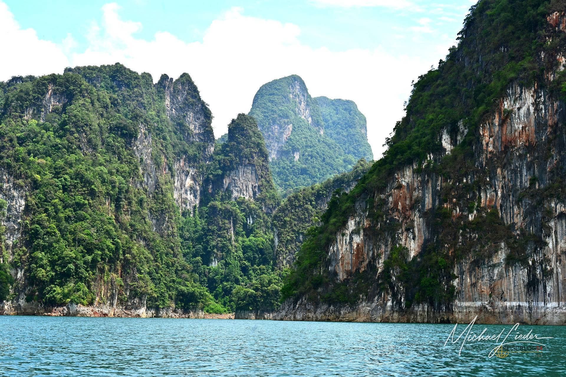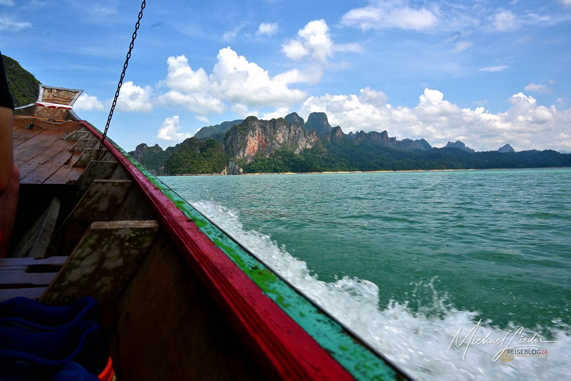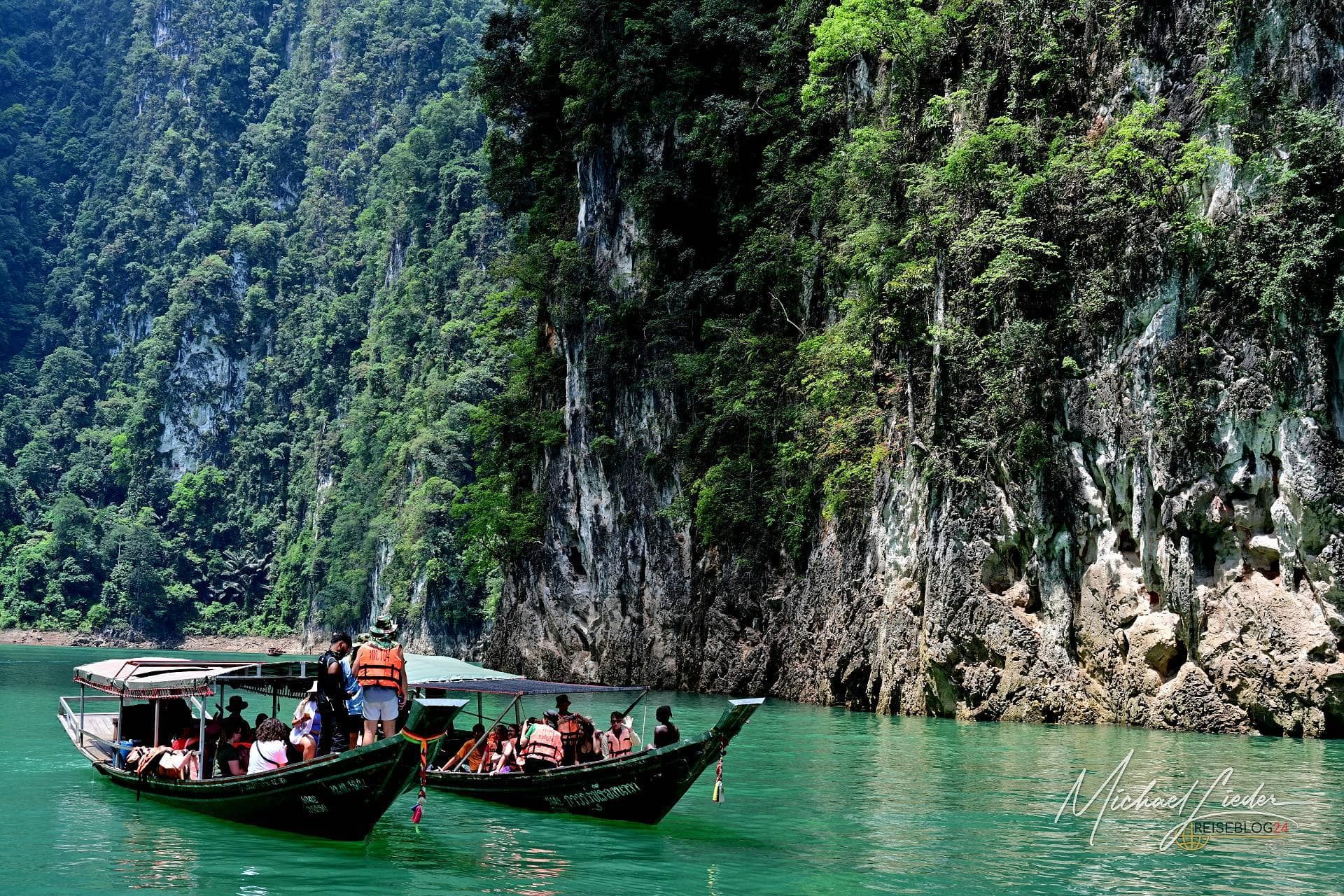Die Tour habe ich direkt über meine Unterkunft gebucht. Abfahrt war um 8:30 Uhr – und tatsächlich: Der Guide stand pünktlicher vor der Tür als jede deutsche Regionalbahn. Ein extrem gut gelaunter Thai, der mit viel Humor, kleinen Faxen und erstaunlich viel Fachwissen unsere zehnköpfige Gruppe durch den Tag begleitet. Allein dafür hätte man ihm eigentlich schon Trinkgeld geben müssen. Geplant ist eine etwa anderthalbstündige Bootsfahrt zu einem schwimmenden Camp mitten auf dem See. Dort gibt es Mittagessen, Zeit zum Baden und optional eine Cave Tour. Die eigentlich angebotene Alternative – eine Wanderung zu einem Wasserfall – fällt heute leider aus. Kein Drama. Bei dieser Kulisse vermisst man wenig. Mit dröhnendem Motor und ordentlich Spritzwasser geht es quer über den See. Vorbei an mächtigen Felsen, die bis in die Spitzen bewaldet sind und wirken, als hätten sie sich einfach aus dem Wasser geschoben. Diese Formationen sind legendär. Jeder, der sich schon einmal mit Thailand beschäftigt hat, hat sie irgendwo gesehen – in Prospekten, auf Webseiten oder als kitschiges Hintergrundbild. Und trotzdem: In echt sind sie noch einmal eine ganz andere Hausnummer.