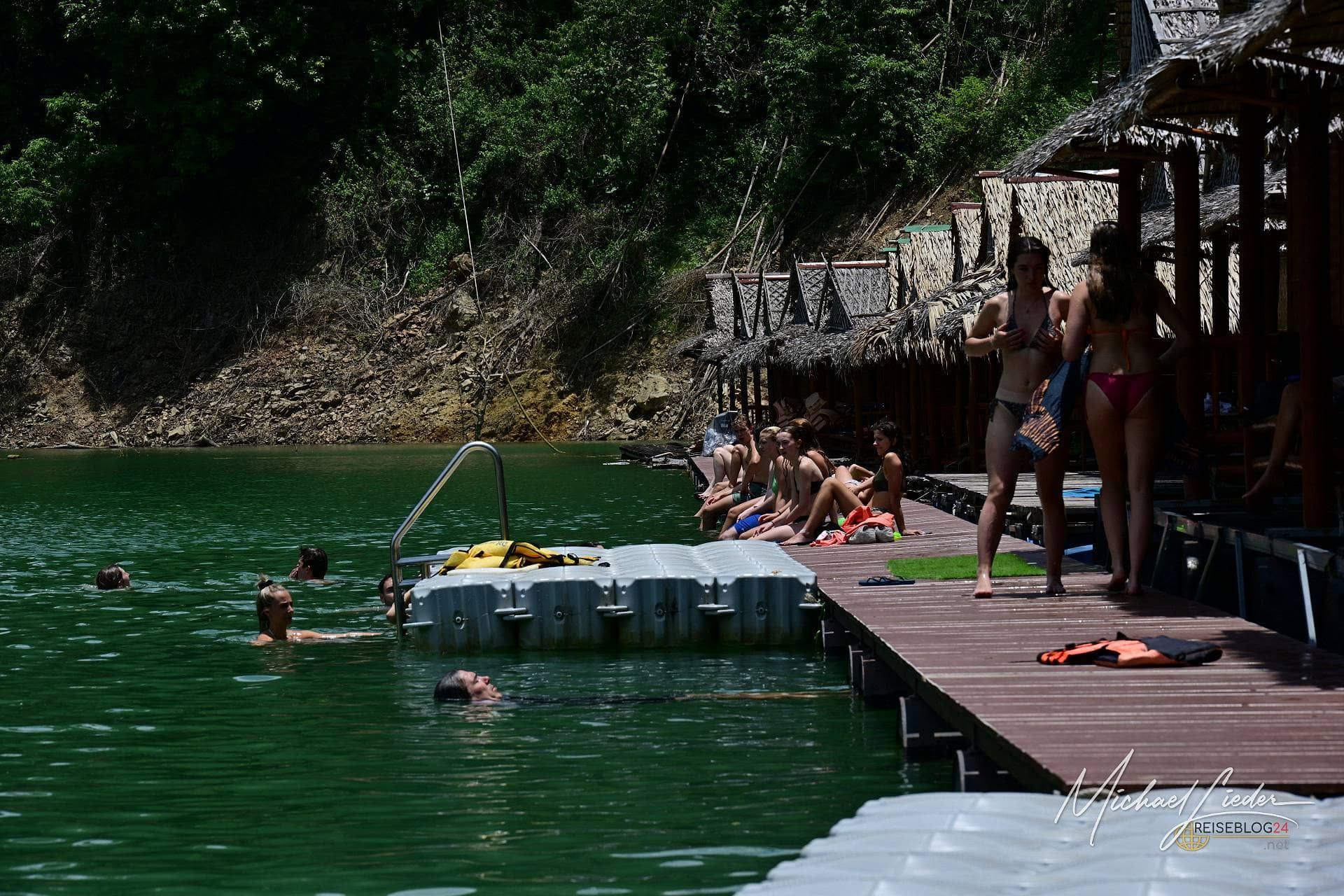 Mitten auf dem See, dort wo wir unser Mittagessen einnehmen, offenbart sich eine ganz eigene Welt. Auf dem Wasser treiben schwimmende Hütten, angeordnet wie kleine Dörfer. Hier findet nicht nur das Restaurantleben statt, sondern auch der Hotelbetrieb. Ja, man kann tatsächlich mitten auf dem See übernachten – umgeben von Kalksteinfelsen, Wasser und dieser besonderen Stille, die tagsüber schon magisch wirkt. In der Theorie ein Traum. In der Vorstellung noch mehr.