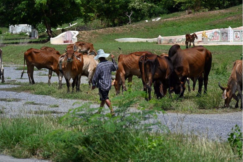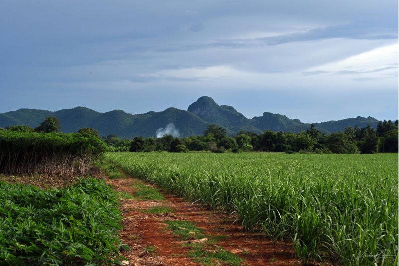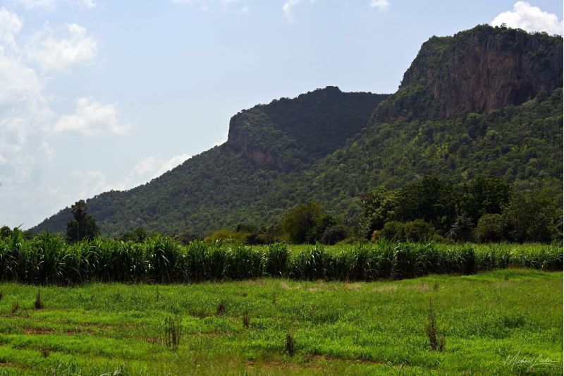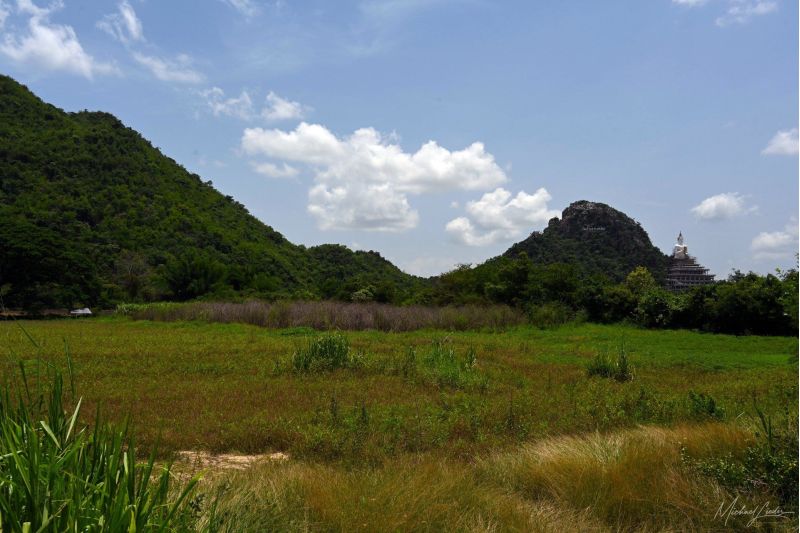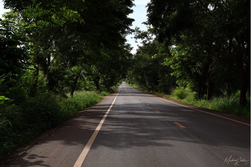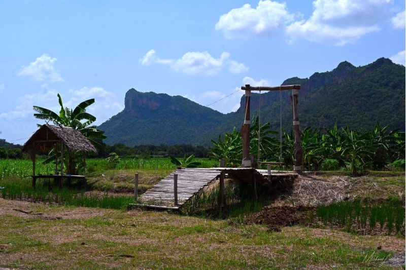 Von Ayutthaya aus fahre ich Richtung Westen. Hinter mir bleiben die ehrwürdigen Tempelruinen, vor mir öffnet sich die Straße ins Unbekannte. Kaum habe ich die Stadtgrenze hinter mir gelassen, wird es still. Reisfelder ziehen vorbei – manche leuchten grün wie frisch gestrichen, andere schimmern bereits goldgelb und warten geduldig auf die Ernte. Der Wind streicht übers Land, als wolle er mir zuflüstern: Jetzt beginnt das echte Thailand.
