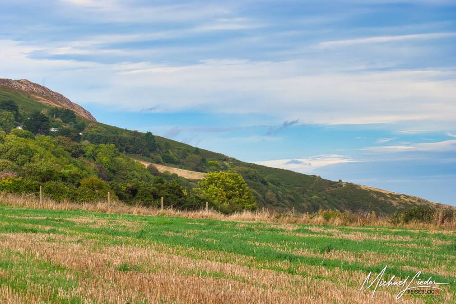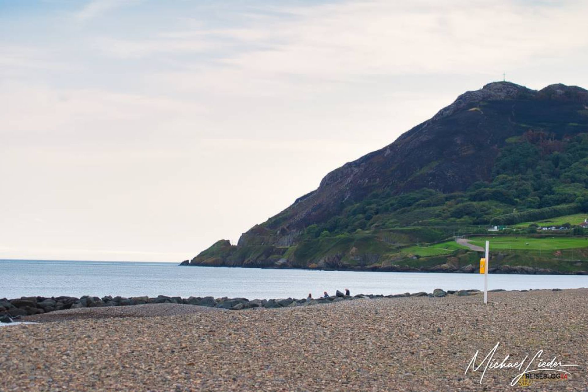 Der Weg führte uns zunächst zum Bray Head. Der Aufstieg zum Kreuz oberhalb der Stadt ist nicht besonders lang, aber durchaus knackig. Die Steigung fordert die Waden, vor allem, wenn man noch im gemütlichen „Ich-steige-aus-dem-Zug“-Modus ist. Doch wie so oft in Irland gilt: Jammern lohnt sich nicht – oben wird man belohnt. Am Gipfel angekommen öffnet sich ein Panorama, das man nicht plant, sondern einfach erlebt. Unter mir lag die Küste, weit und offen, und der Blick reichte von der Dublin Bay bis hinüber zu den Wicklow Mountains. Wind im Gesicht, Weite vor Augen, Gedanken irgendwo zwischen Alltag und Atlantik. Einer dieser Momente, in denen man automatisch langsamer wird. Hier oben habe ich kurz innegehalten, tief durchgeatmet und mir gedacht: Genau dafür bin ich hier. Bray Head ist kein Spektakel, kein Instagram-Zwangspunkt – sondern ein stiller Einstieg in eine Wanderung, die zeigt, wie nah in Irland Stadt, Natur und Meer beieinanderliegen. Und das war erst der Anfang.