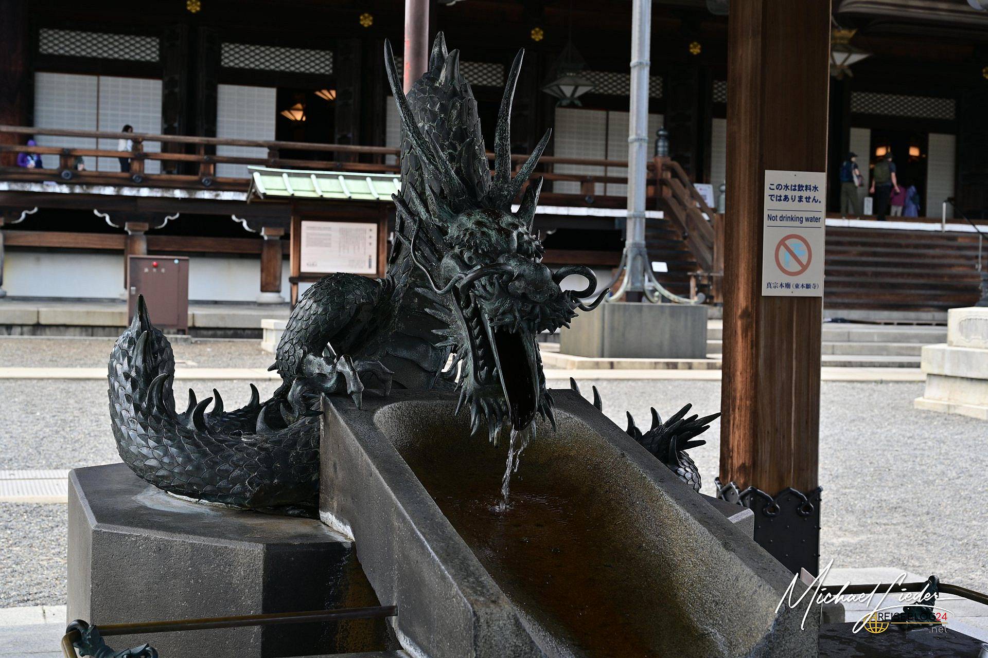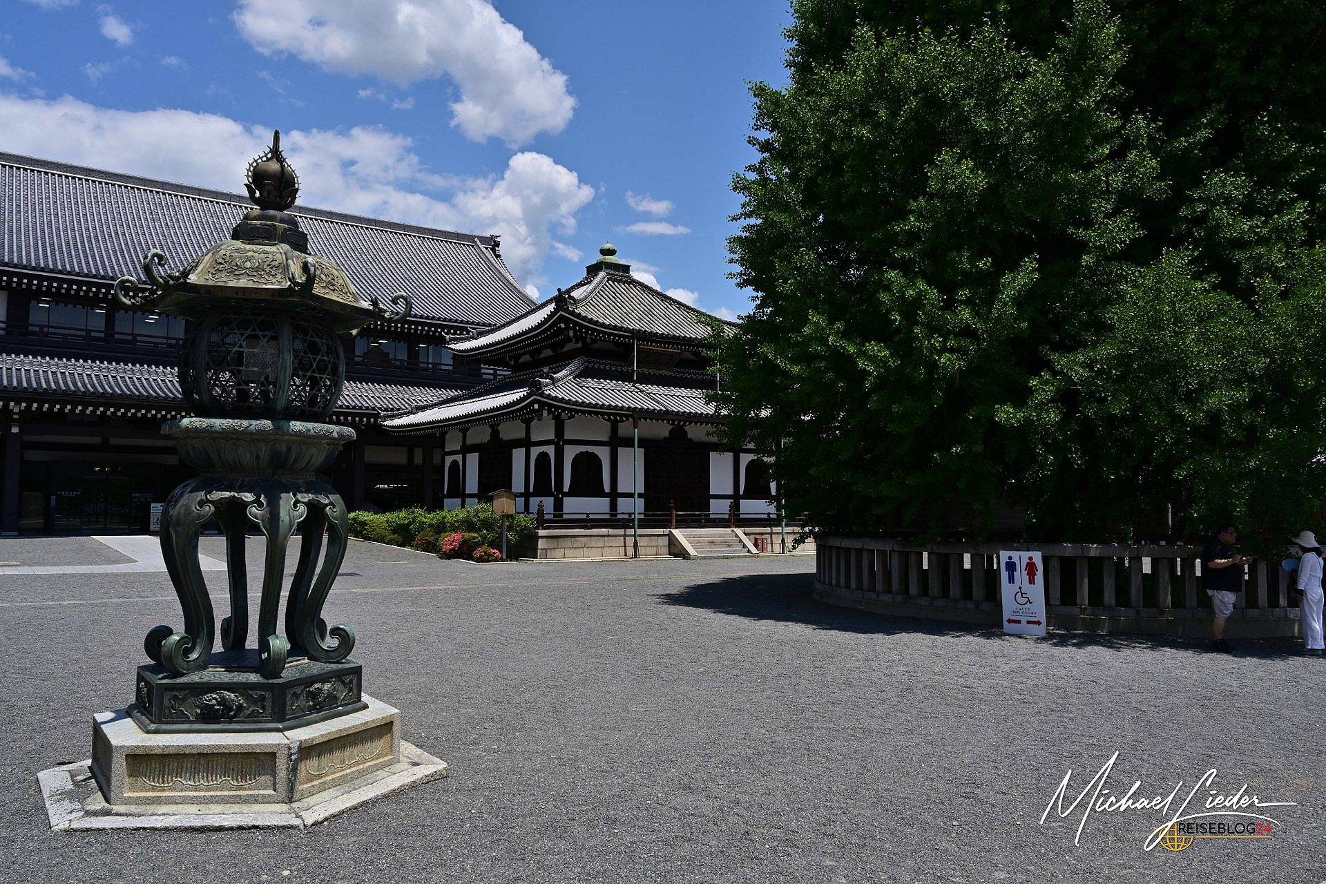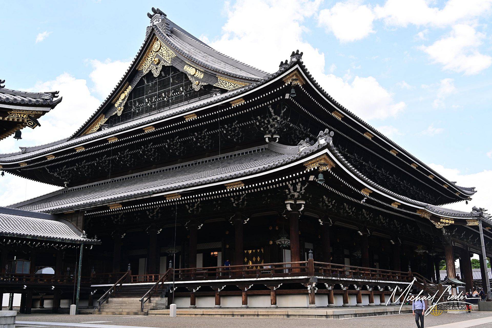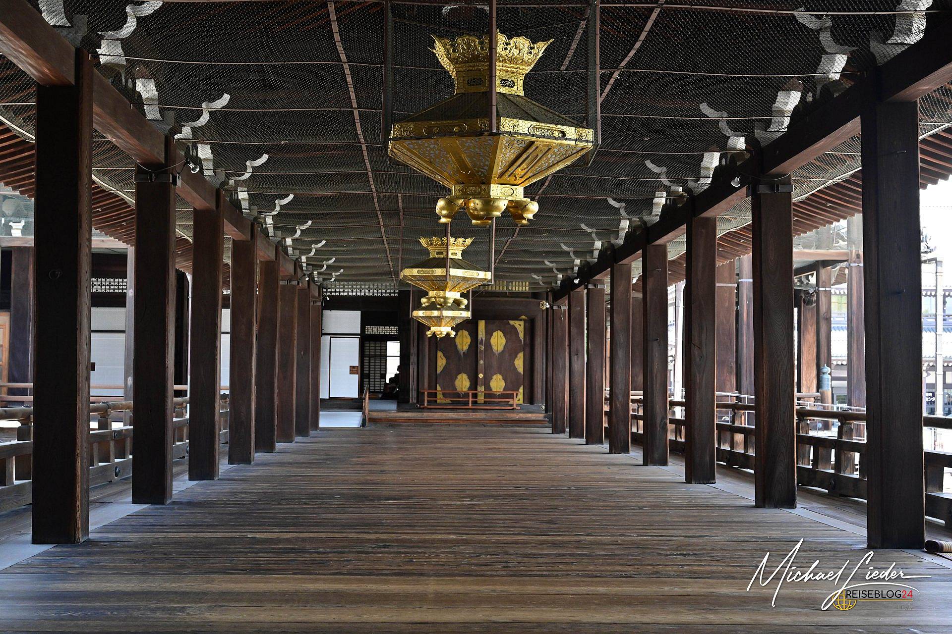 Manchmal plant man in Kyoto ganz bewusst – und merkt erst später, wie viel Tiefe in einer Entscheidung stecken kann. Wir hatten uns gezielt für das Gästehaus in der Nähe des Higashi Hongan-ji entschieden. Nicht, um „nur“ einen Tempel zu besuchen, sondern um für ein paar Tage Teil dieses besonderen Ortes zu sein. Schon beim ersten Spaziergang am Abend war klar: Dieser Tempel ist keine Sehenswürdigkeit im klassischen Sinne. Er protzt nicht, er ruht. Dunkles Holz, gewaltige Dachstrukturen, goldene Verzierungen, die nicht glänzen wollen, sondern einfach dazugehören. Ein Monument der Stille mitten im urbanen Kyoto.