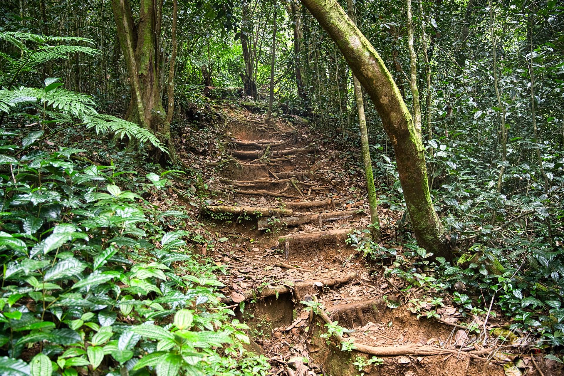 Statt aus Stein gehauener Stufen oder netter Holzstege erwartet einen ein Aufstieg zwischen rutschigen Felsen und verschlungenen Wurzeln – eine Art natürlicher Hindernisparcours mit tropischer Luftfeuchtigkeit als Bonuslevel. Diese Wurzeln haben allerdings eine erstaunliche Ästhetik: Sie wirken, als wollten sie den Waldboden zärtlich umarmen, während sie uns gleichzeitig mit schelmischem Grinsen ein Bein stellen. Man redet sich das gern schön – vielleicht, um die schweißnasse Realität etwas zu übertönen. Nach den ersten 300 Metern klingt das Atmen eher wie das rhythmische Fauchen eines überforderten Teekessels. Und während man versucht, nicht auf feuchten Moosmatten auszurutschen, kommt da wieder dieses Schild: alle 200 Meter. Immerhin eine kleine moralische Unterstützung. Es signalisiert: Ja, du bist noch auf dem richtigen Weg.