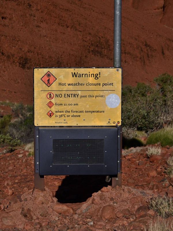Die Landschaft hat uns sofort in ihren Bann gezogen, und wir sind gespannt, was die Kata Tjuta für uns bereithalten. Der Wanderweg beginnt direkt am Parkplatz, und wie so oft wird auch hier auf mögliche Gefahren hingewiesen. Besonders der Wassermangel ist – primär im Hochsommer – eines der größten Risiken. Ab einer Temperatur von 36 °C, so steht es auf den Warnschildern, wird der Rundweg sogar gesperrt, da er dann zu gefährlich ist.