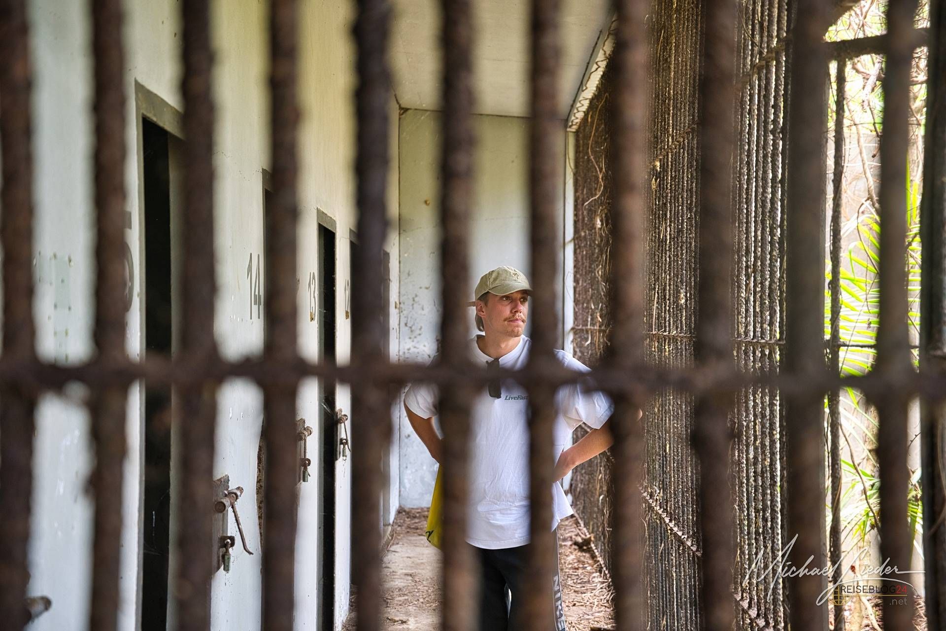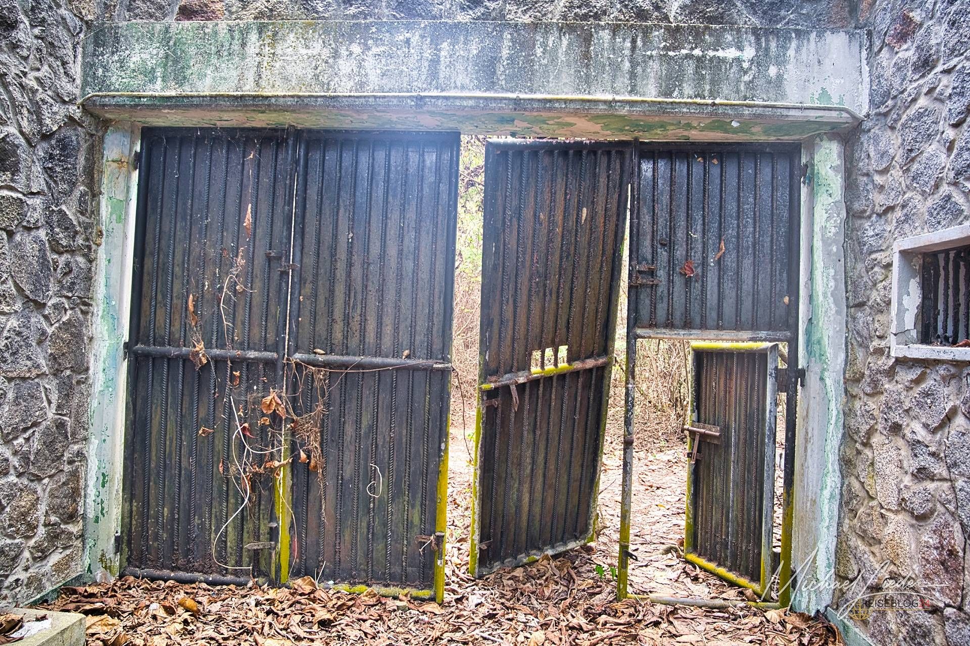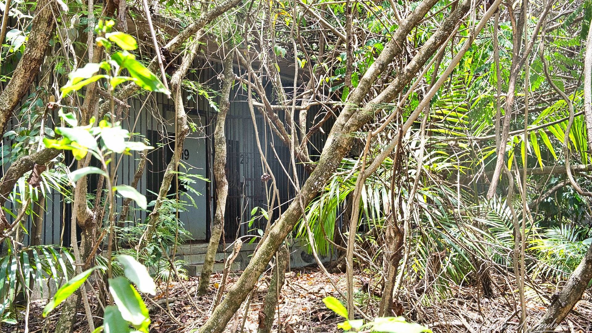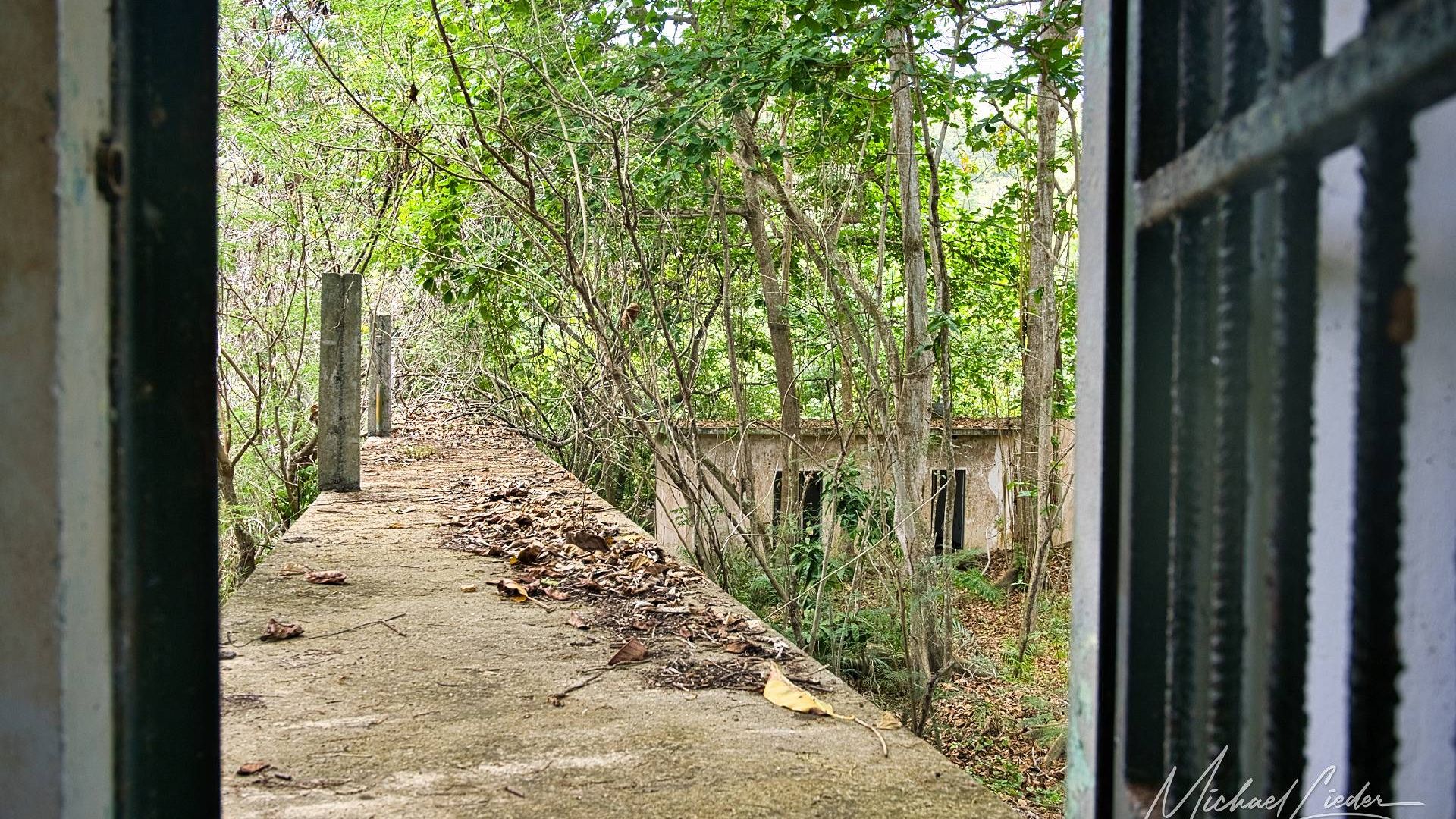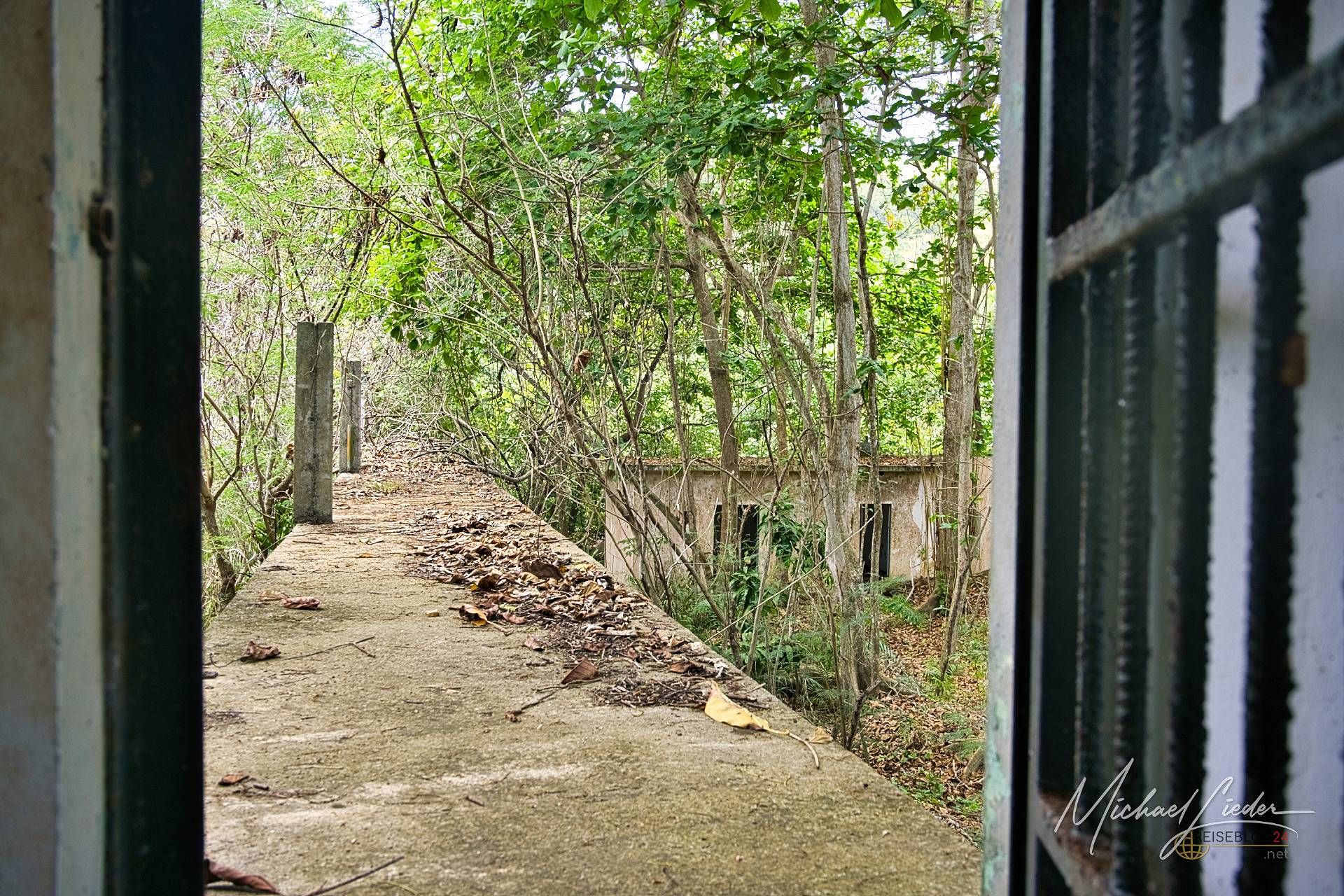 Es ist still. Nur das Zirpen der Zikaden, das leise Rauschen des Meeres in der Ferne und das gelegentliche Knacken trockener Äste. Zwischen den Bäumen ragen graue Betonwände hervor, von Lianen umschlungen, die sich um alte Gitterreste winden wie eine Naturversion von Stacheldraht. Ein kleiner Mungo huscht vorbei, schaut kurz irritiert – wahrscheinlich denkt er, wir seien die neuen Wärter – und verschwindet wieder ins Dickicht.
