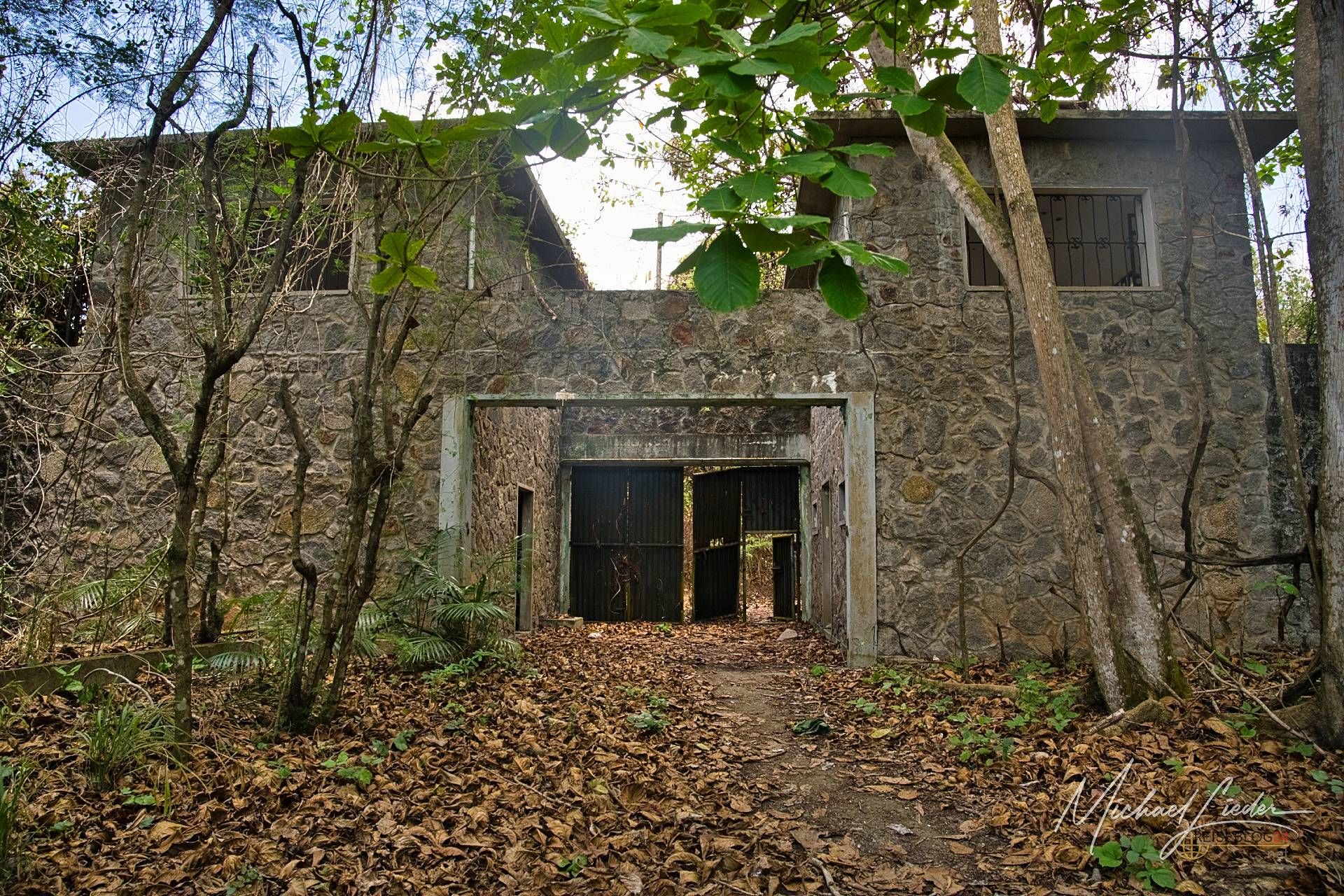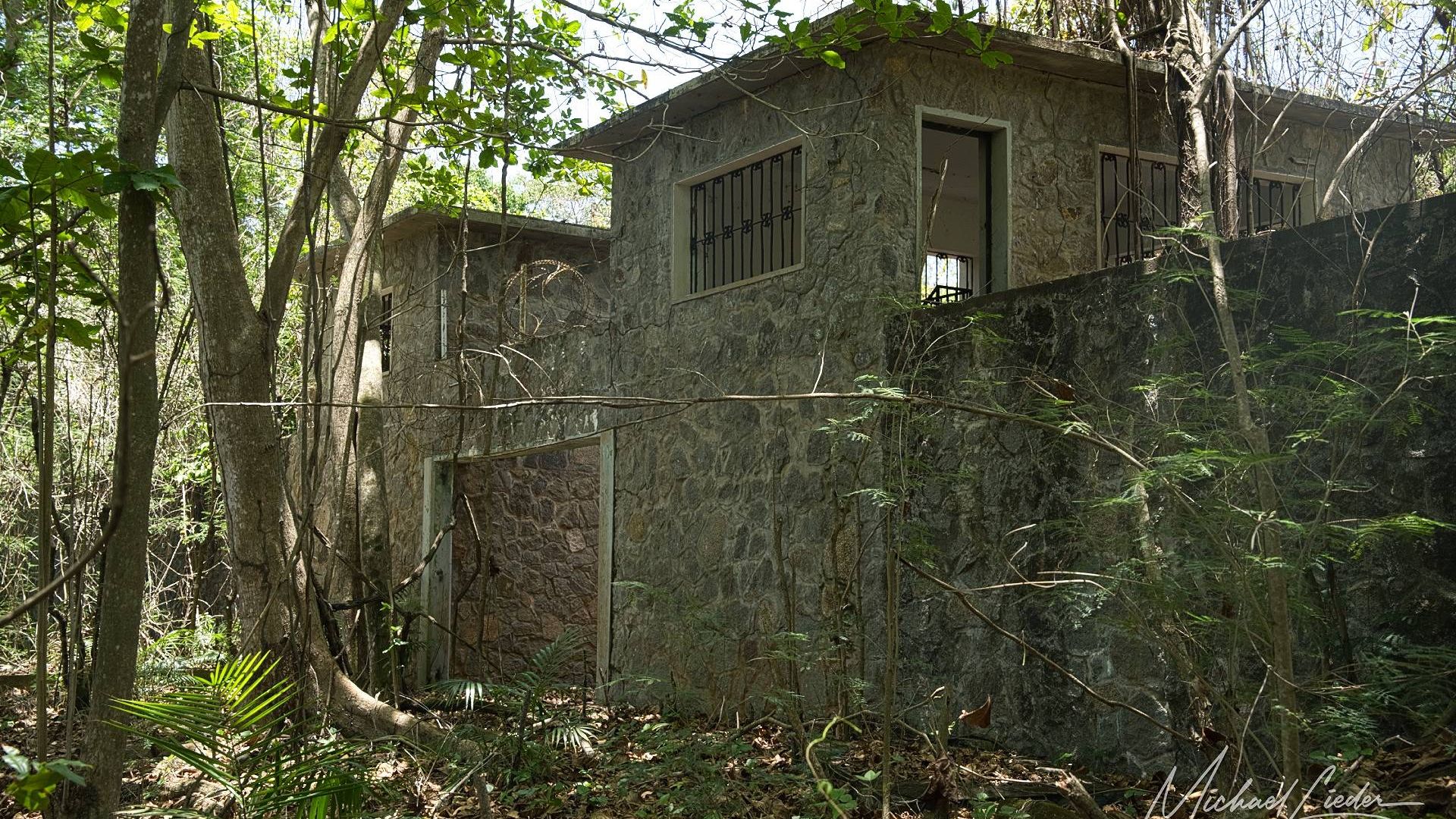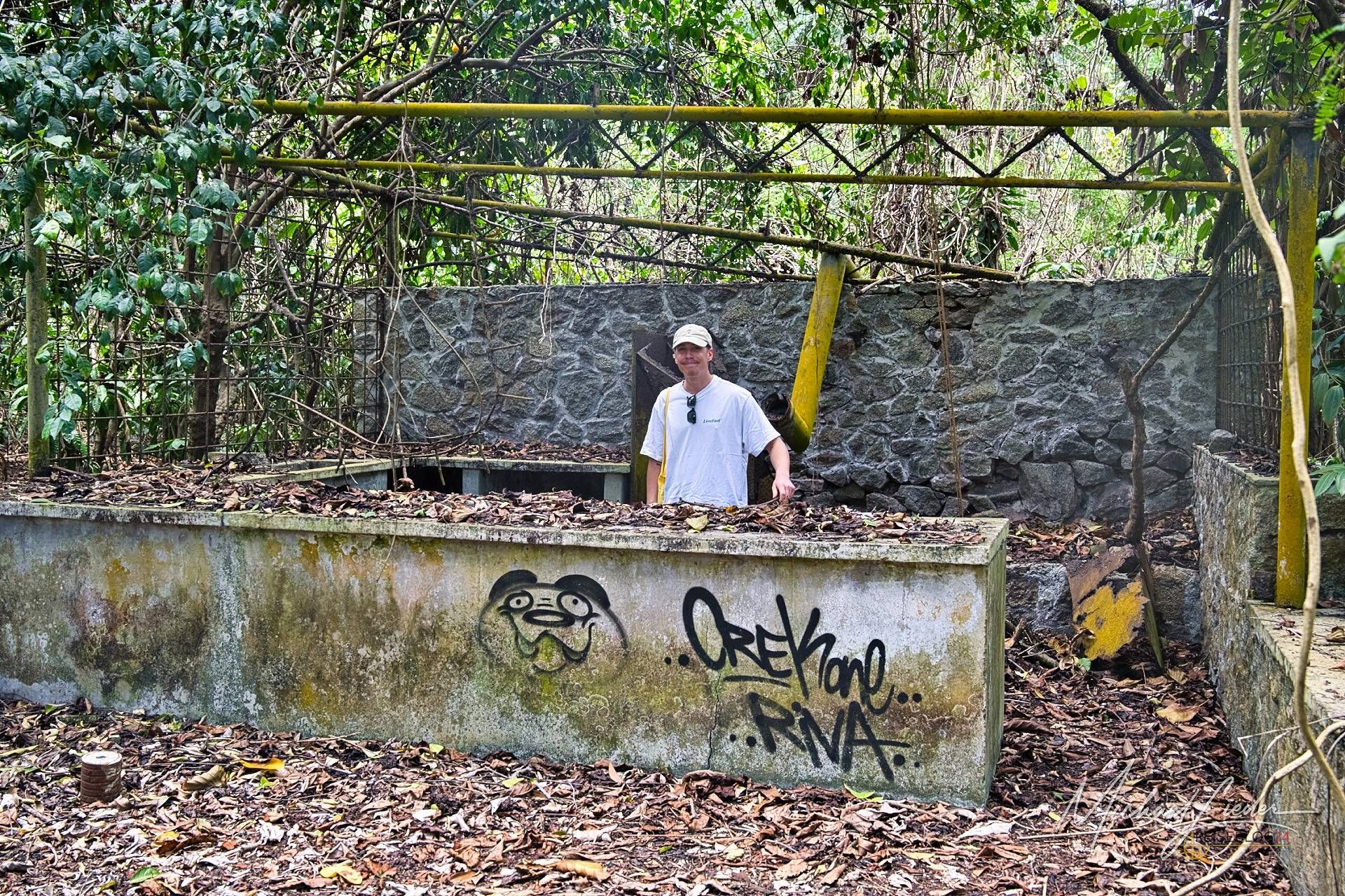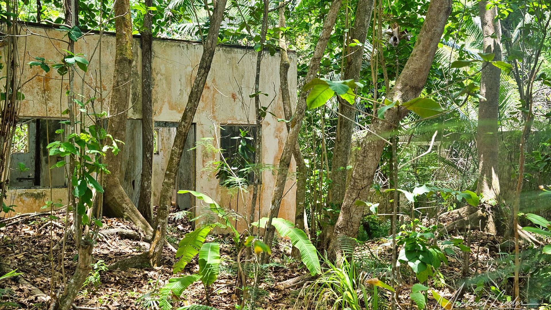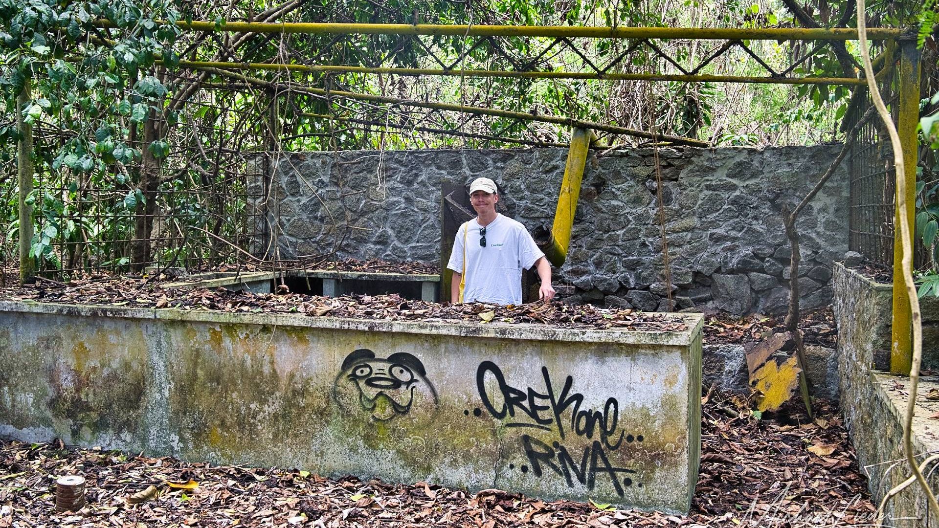 Es ist still. Nur das Zirpen der Zikaden, das leise Rauschen des Meeres in der Ferne und das gelegentliche Knacken trockener Äste. Zwischen den Bäumen ragen graue Betonwände hervor, von Lianen umschlungen, die sich um alte Gitterreste winden wie eine Naturversion von Stacheldraht. Ein kleiner Mungo huscht vorbei, schaut kurz irritiert – wahrscheinlich denkt er, wir seien die neuen Wärter – und verschwindet wieder ins Dickicht.