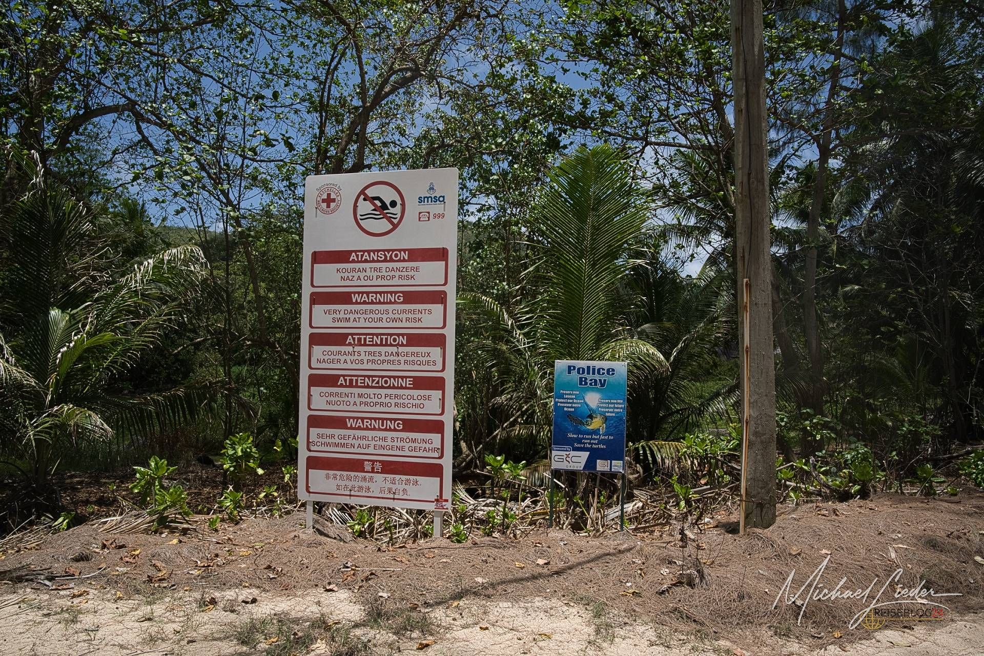 Und dann – plötzlich – öffnet sich der Blick: Ein endloser Strand, türkisblaues Wasser, Wellen, die mit solcher Wucht anrollen, dass selbst erfahrene Surfer kurz überlegen, ob sie vielleicht doch lieber Muscheln sammeln sollten. Es ist wild, roh, ungezähmt – und genau deshalb wunderschön. Direkt am Eingang zur Police Bay steht ein Schild, das vor der gefährlichen Strömung warnt. Und ehrlich gesagt: Wir haben uns angeschaut, genickt – und beschlossen, dass wir hier wohl keinen Badestopp einlegen. Stattdessen genießen wir die Brandung, die im Takt eines kosmischen Metronoms gegen die Küste schlägt. Jede Welle ist lauter, mächtiger, lebendiger als die vorige. Weit und breit kein Mensch, nur wir, ein einsames Auto am Straßenrand – und irgendwo vielleicht noch ein anderer Glückspilz, der den Tag genauso zelebriert. Hier versteht man, warum viele Reisende sagen, die Seychellen sind mehr als Honeymoon-Klischee und Resort-Romantik. Police Bay ist die ungeschminkte Wahrheit – das Gesicht der Insel, bevor der Tourismus Make-up auftrug. Man steht da, den Sand zwischen den Zehen, die Gischt im Gesicht, und denkt: Wenn das hier das Ende der Welt ist, dann soll sie bitte noch ein paar Meter so weitergehen.