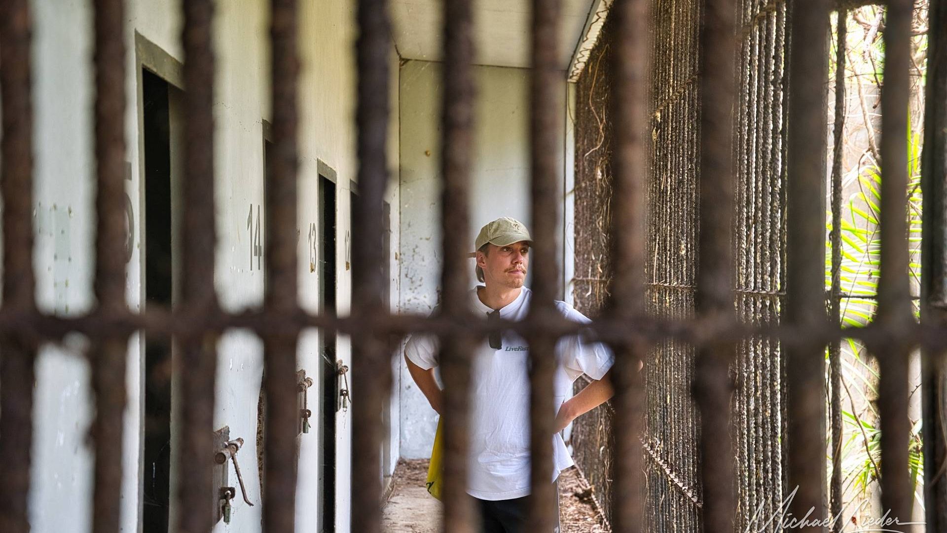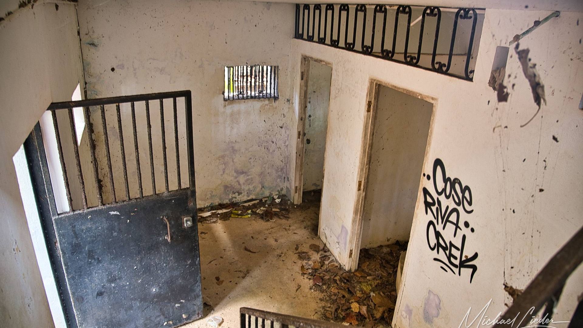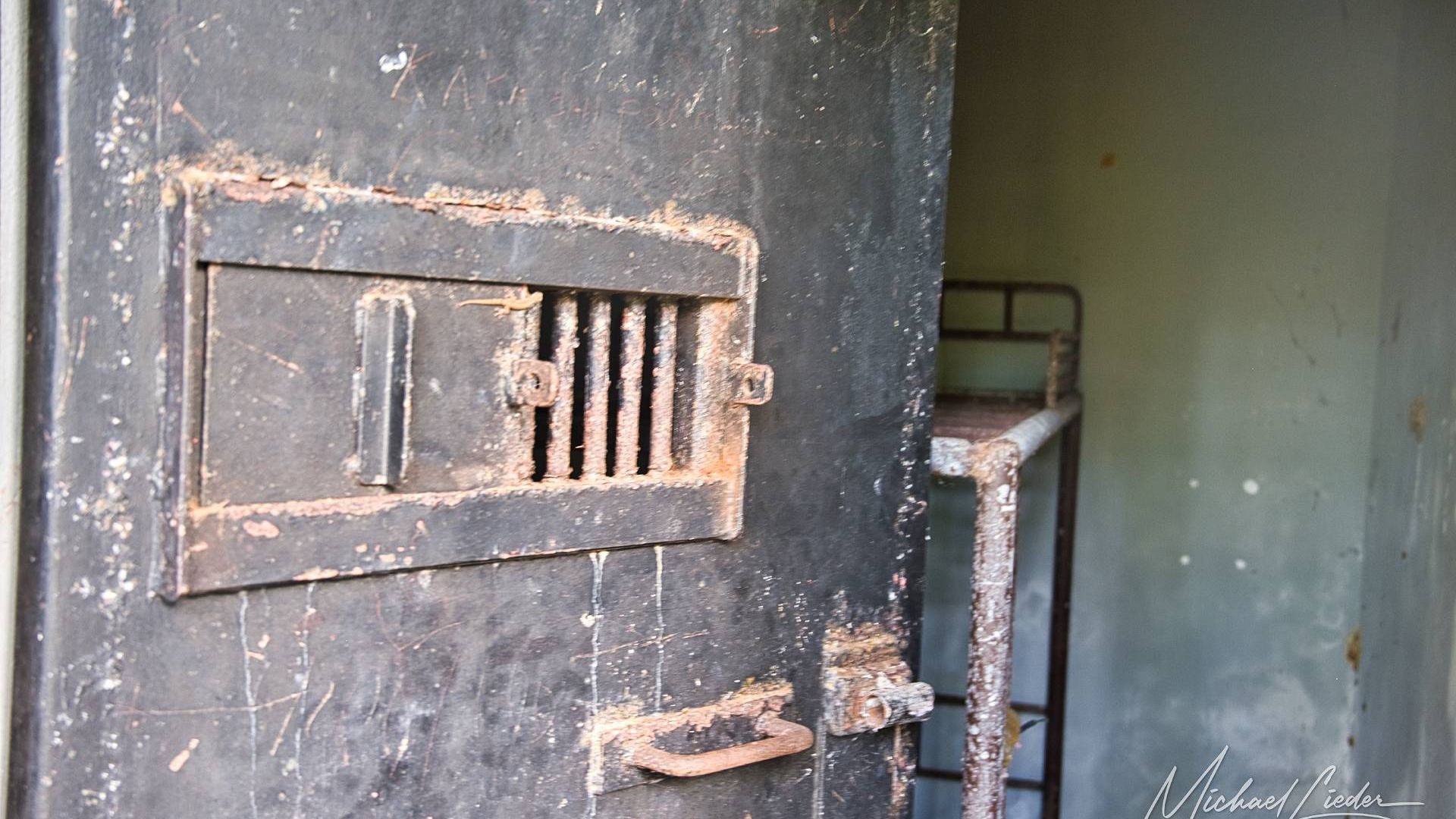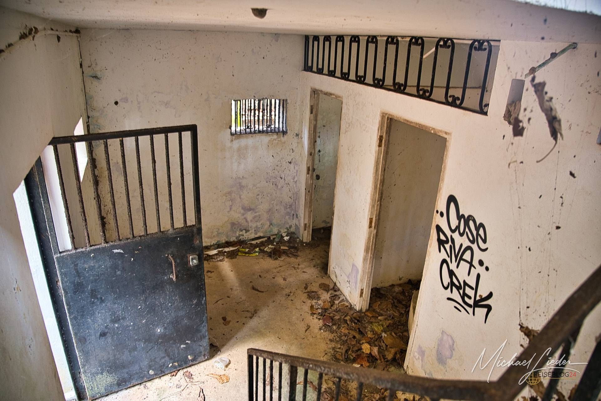 Ein verbeultes Eingangstor mit verblasstem Graffiti führt in einen Hof, in dem einst Zellen standen. Manche Mauern halten noch stand, andere sind längst in sich zusammengesackt. Sonnenstrahlen fallen durch Blätter und Gitter, als wolle die Natur zeigen, wie schön Verfall sein kann.