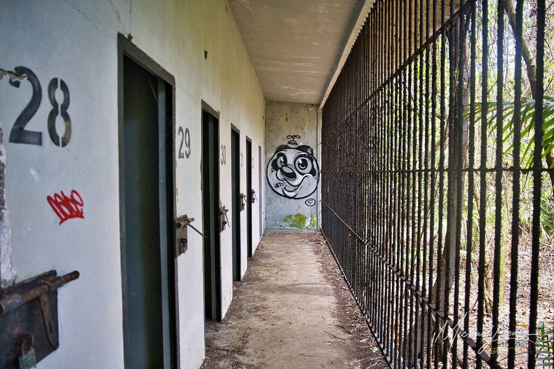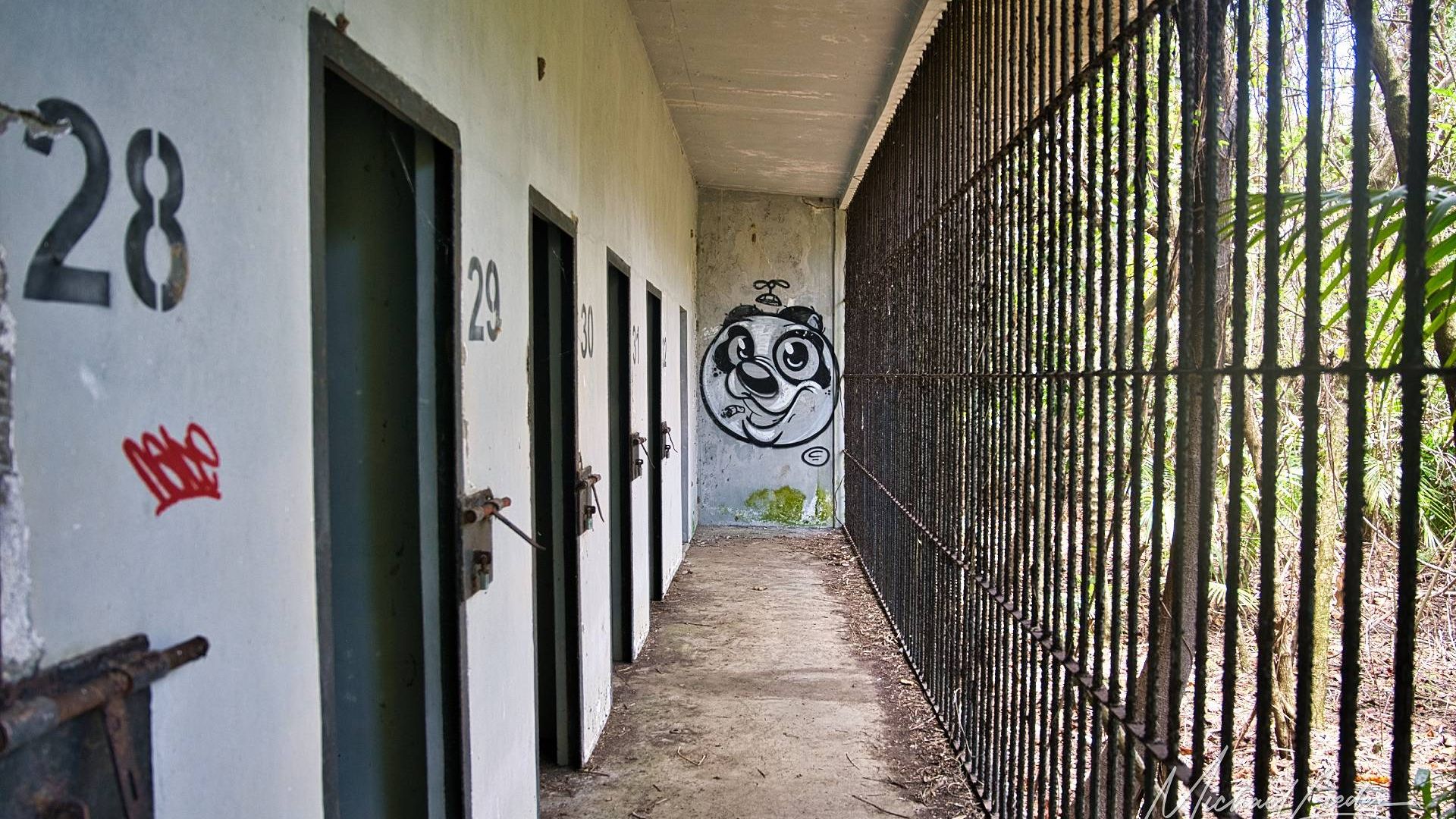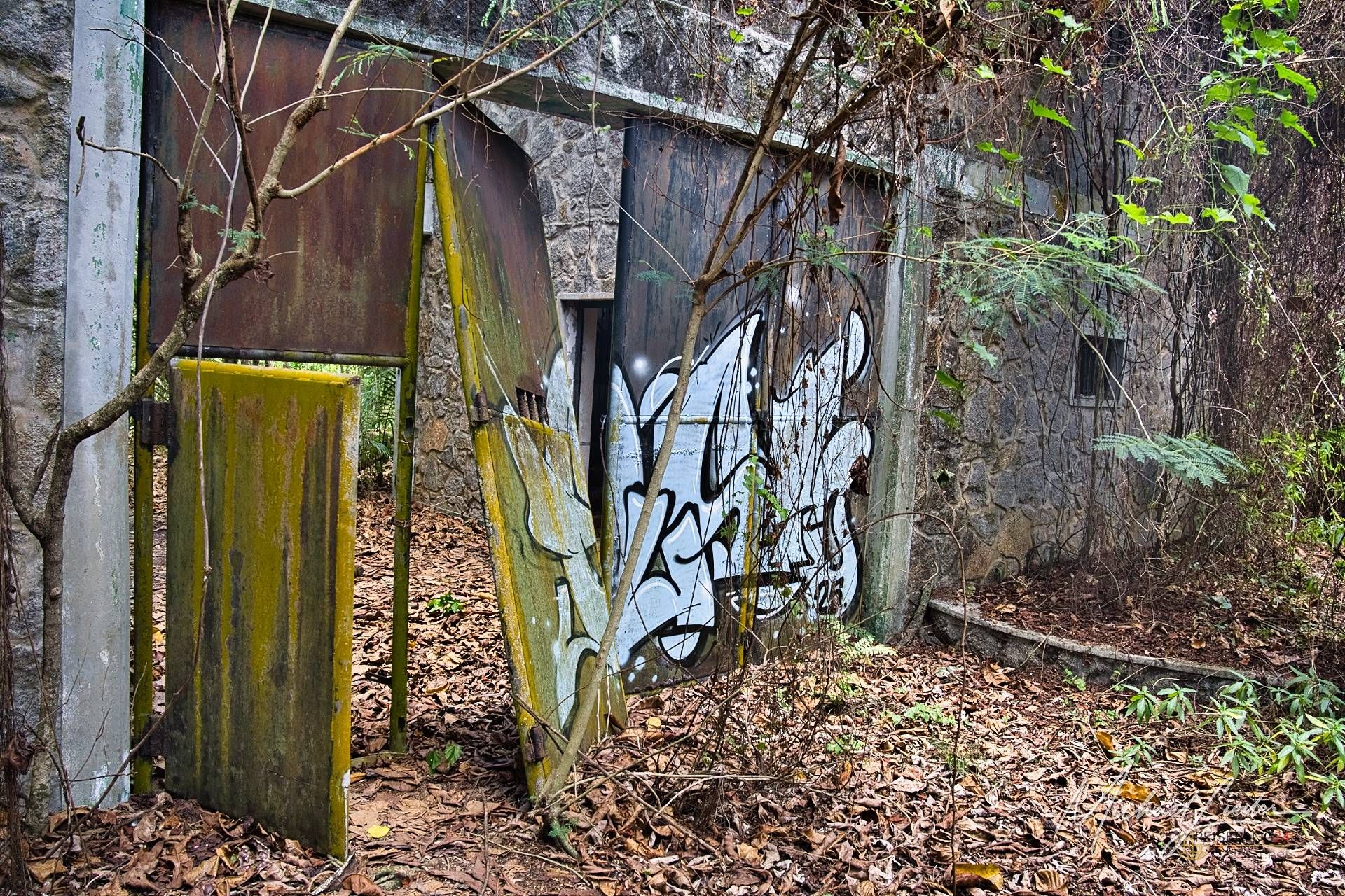 Ein verbeultes Eingangstor mit verblasstem Graffiti führt in einen Hof, in dem einst Zellen standen. Manche Mauern halten noch stand, andere sind längst in sich zusammengesackt. Sonnenstrahlen fallen durch Blätter und Gitter, als wolle die Natur zeigen, wie schön Verfall sein kann.