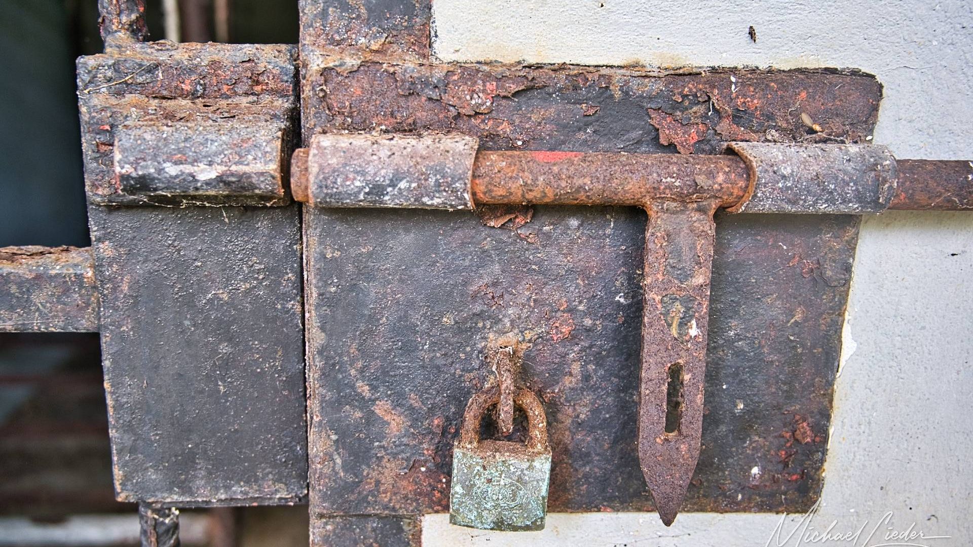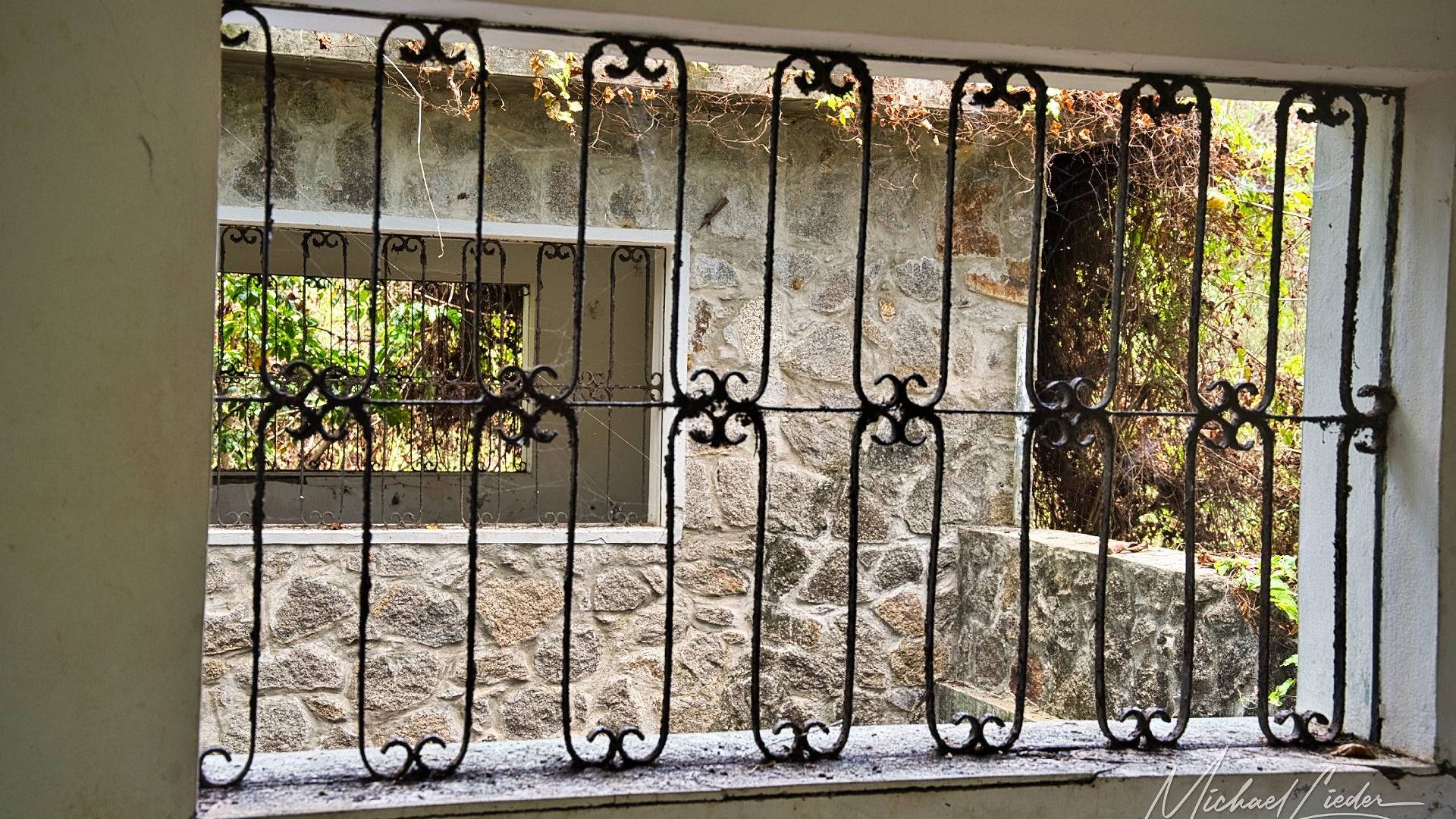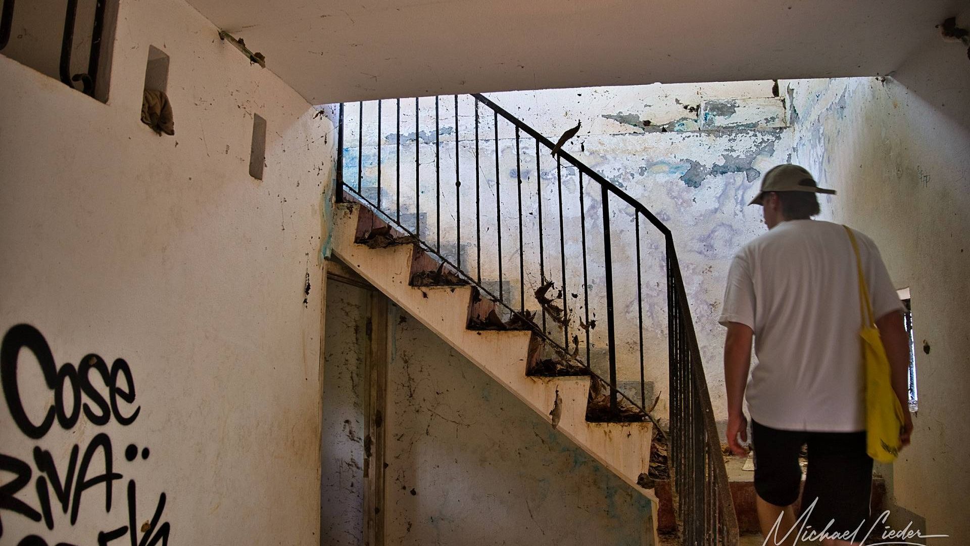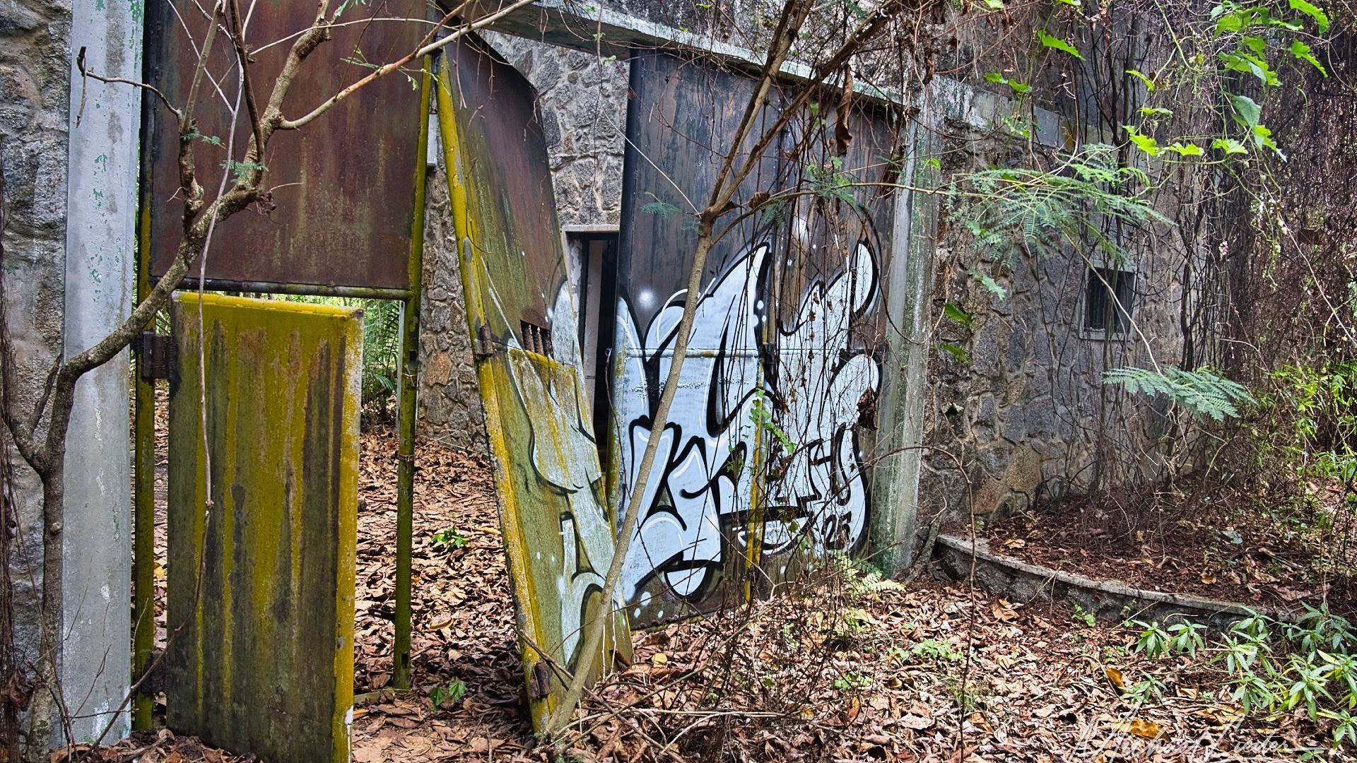 Ein verbeultes Eingangstor mit verblasstem Graffiti führt in einen Hof, in dem einst Zellen standen. Manche Mauern halten noch stand, andere sind längst in sich zusammengesackt. Sonnenstrahlen fallen durch Blätter und Gitter, als wolle die Natur zeigen, wie schön Verfall sein kann.