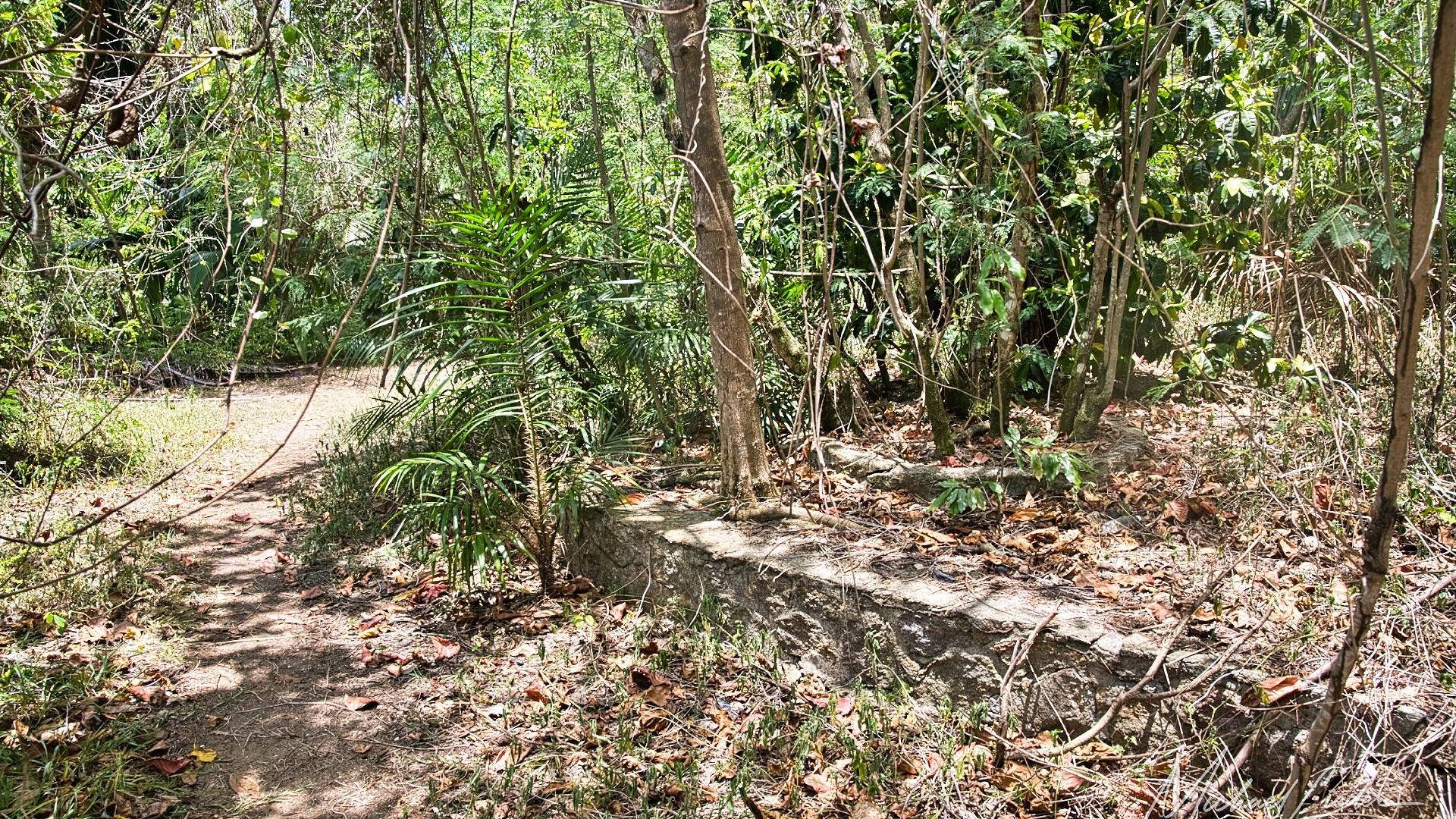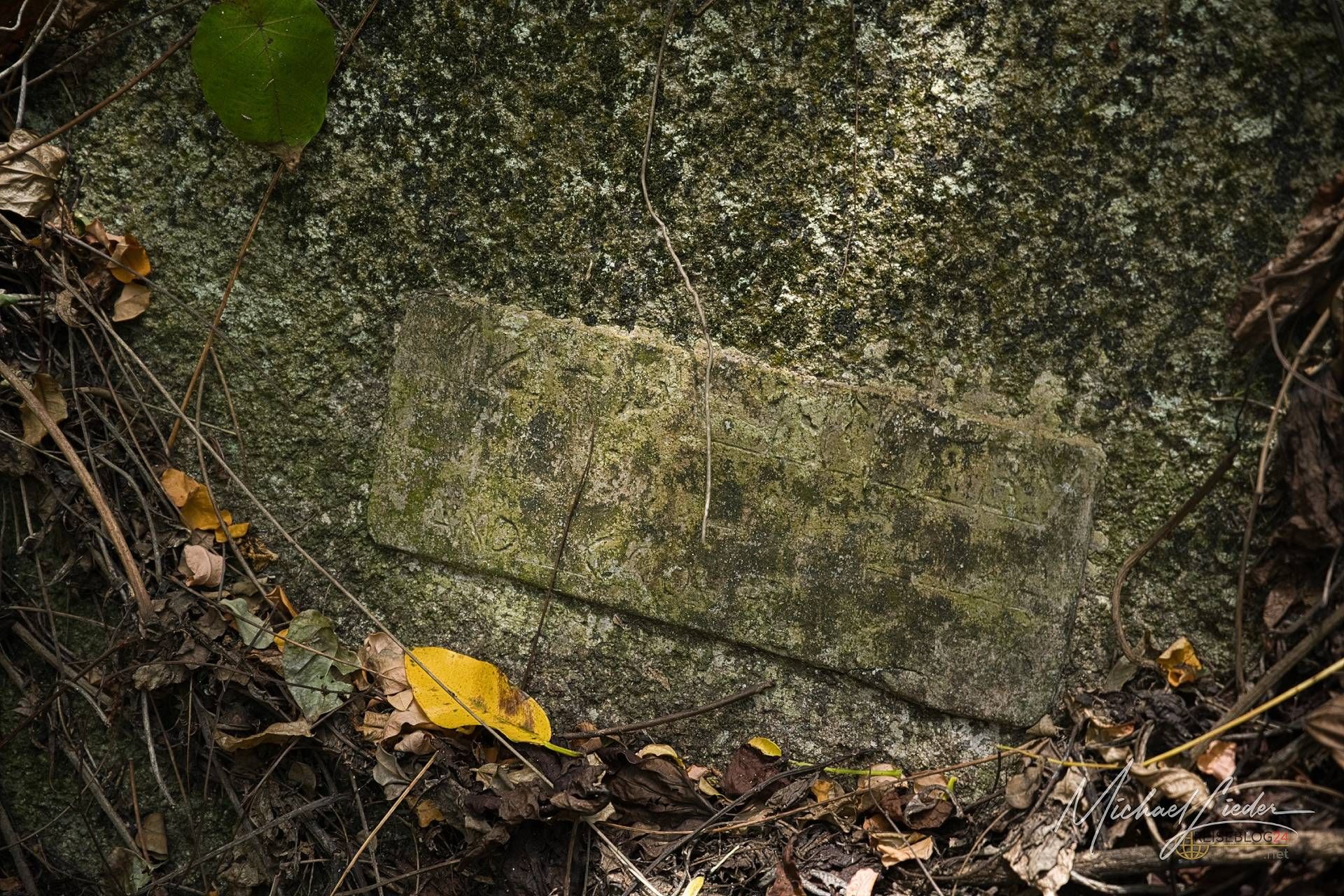 Ein paar hundert Meter zurück: links ein Felsen, davor eine unscheinbare Gedenktafel. Dahinter ein Pfad – schmal, feucht, geheimnisvoll. Perfekt. Also hinein. Der Dschungel umarmt uns mit tropischer Feuchtigkeit, die Haare kleben, die Mücken feiern – und nach wenigen Minuten tauchen die ersten Mauerreste auf. Überwuchert, gebrochen, aber voller Geschichten. Als würden sie flüstern: „Du bist nah dran, Fremder.“
