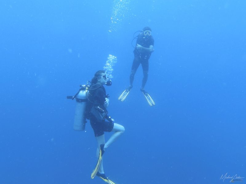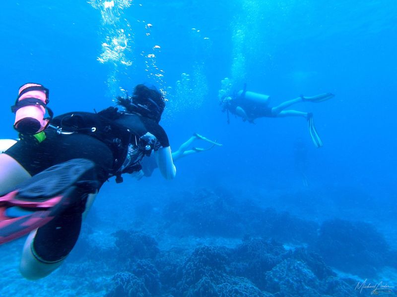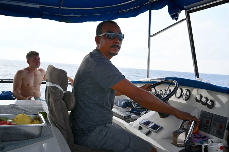 Nachdem die Schnorchler ins Wasser gelassen wurden, fuhr der Katamaran noch ein Stück weiter und setzte die Taucher an einem Felsen ab. Die Organisation an Bord war tadellos. Ausrüstung vollständig, passend, alles so, wie man es sich wünscht. Daran lag es nicht. Auch der erste Eindruck im Wasser ist zunächst beeindruckend: rund 30 Grad Wassertemperatur – und das bis in etwa 30 Meter Tiefe. Mehr als ein Shorty wäre hier schlicht übertrieben.