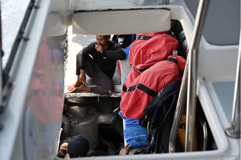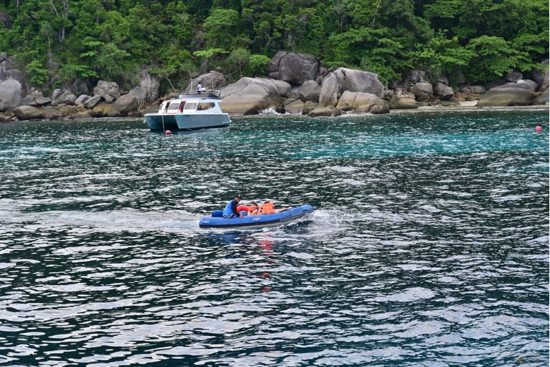 Nach der Abholung am Hotel ging es recht zügig Richtung Boot. Ein Katamaran, der uns laut Plan in etwa zwei Stunden zu den Inseln bringen sollte. Soweit die Theorie. In der Praxis entwickelte sich die Fahrt etwas… entschleunigter. Einer der beiden Motoren hatte offenbar andere Pläne und musste unterwegs mehrfach von der Crew repariert werden. Improvisation auf offener See. Gehört wohl dazu. Am Ende kamen wir mit einiger Verspätung am Tauchgebiet an – aber immerhin angekommen. Der Einfachheit halber sind die Similan Islands durchnummeriert, unser Ziel waren die Inseln fünf und sieben. Laut Beschreibung auf der Website erwartete uns dort ein entspannter Tag: geeignet für Familien und nichttauchende Partner, Strandgänge möglich, für Taucher ruhige Rifftauchgänge und Felsformationen. Klingt nach einem sehr harmonischen, fast schon pädagogisch wertvollen Ausflug.