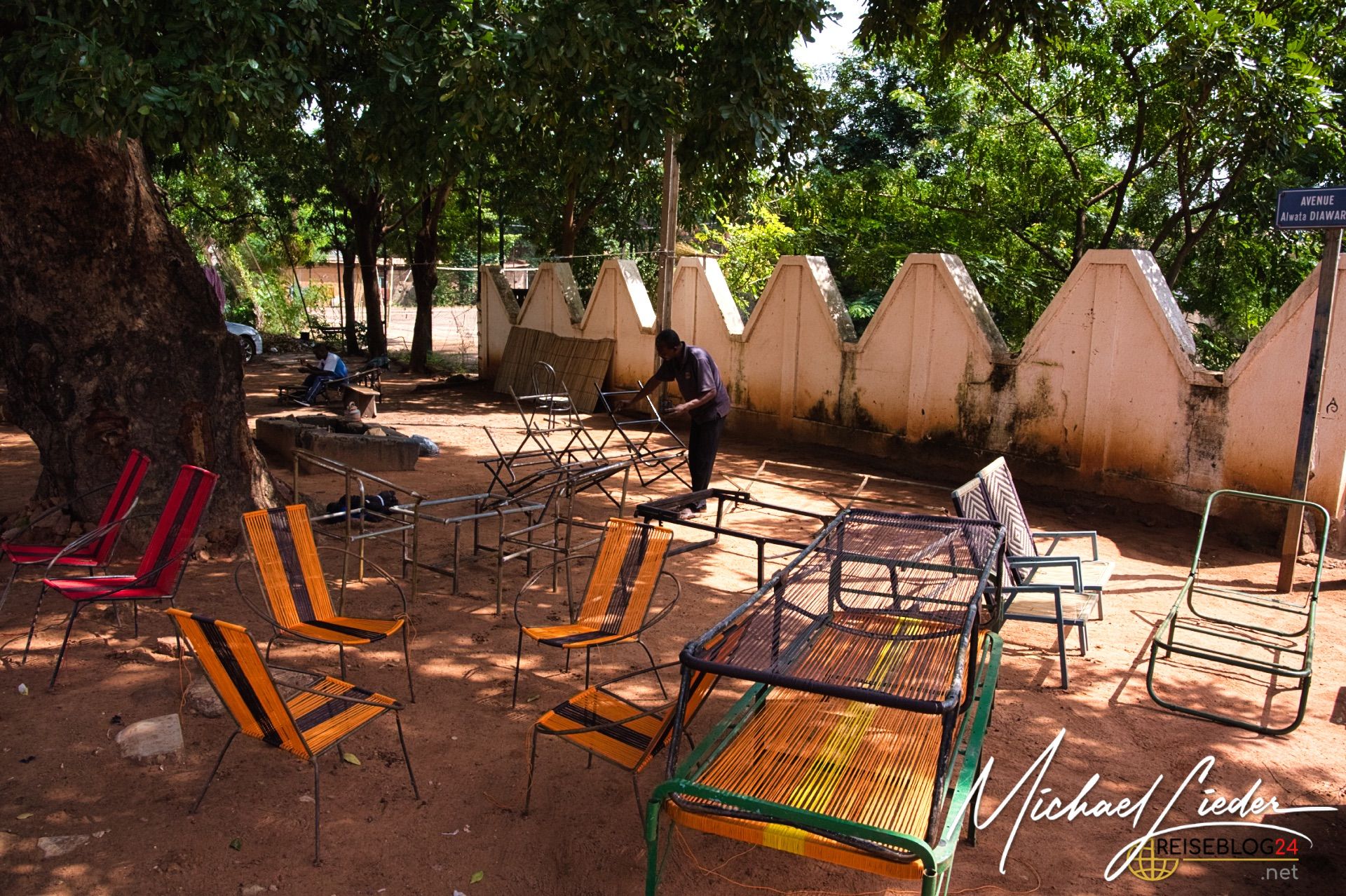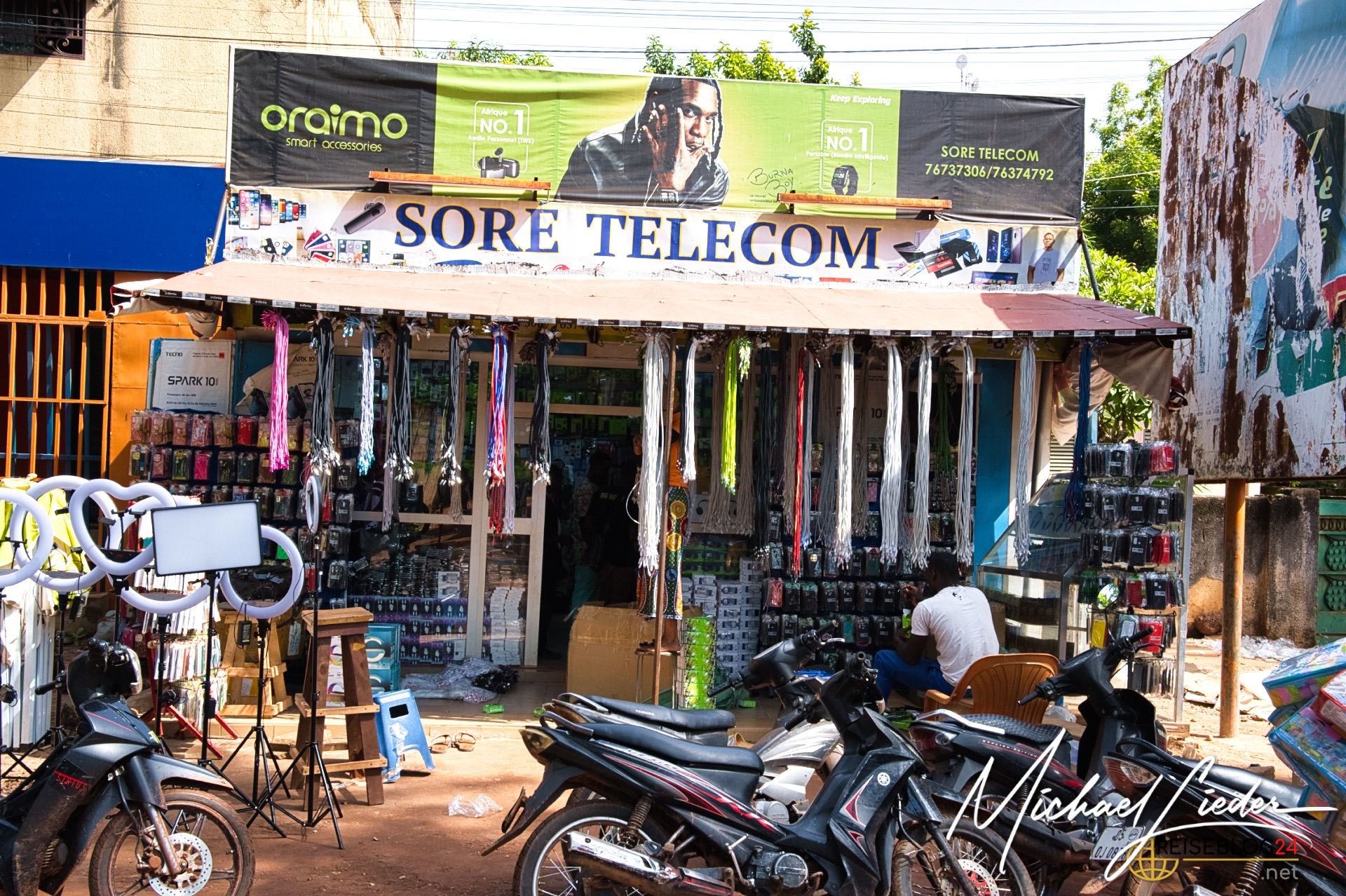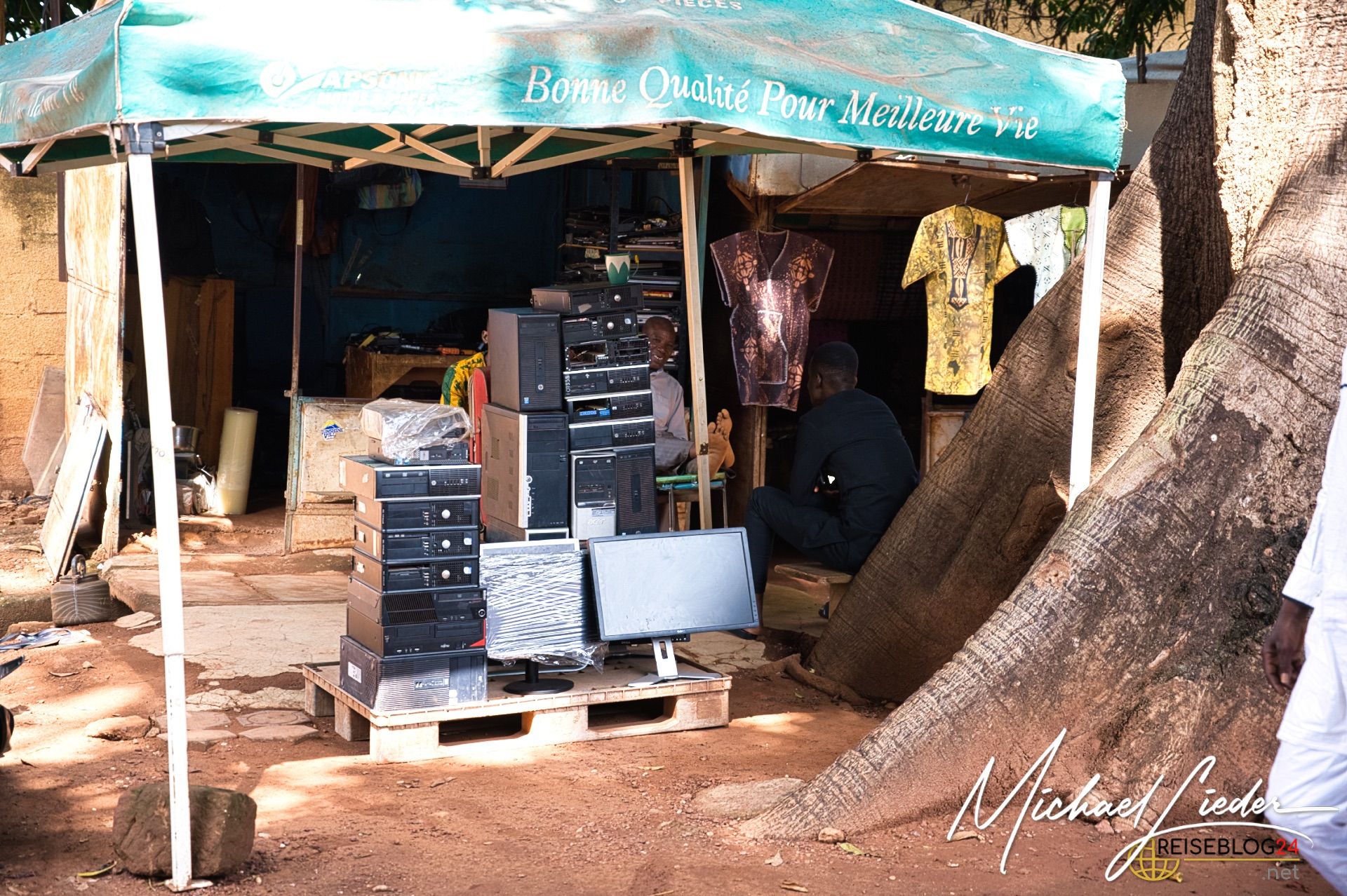 Ich konnte im Zuge meiner Dokumentationsarbeit auch auf´s Land fahren, zu einem kleinen Dorf vor den Toren Bobo´s nach Doufiguisso. Hier ist das Leben ruhig, beschaulich, ursprünglich und einfach landwirtschaftlich geprägt. Die Stadt und die Sorgen scheinen weit weg zu sein, interessant ist, dass sowohl das Wasser als auch die Versorgung mit Strom recht autark betrieben wird. Brunnen mit solarbetriebenen Pumpen sind oft zu sehen, und auch die Gelbatterien, die den Strom für die Nacht speichern, gehören zu vielen Haushalten. Viele versuchen neben den Feldfrüchten für den Eigenbedarf auch etwas für den Weiterverkauf zu produzieren. Das bedeutet, dass kilometerlang die Hauptstraßen von bunten Verkaufsständen gesäumt werden. Hier findet auf dem Land das Leben der Menschen unmittelbar statt.