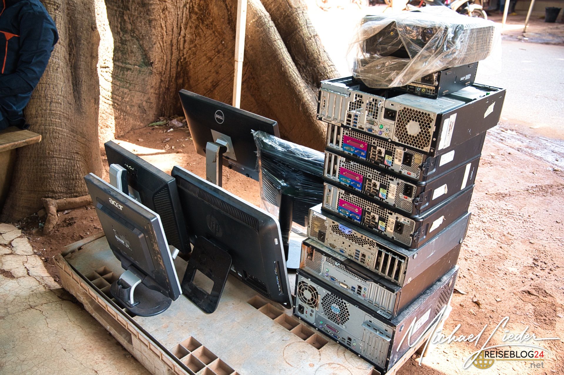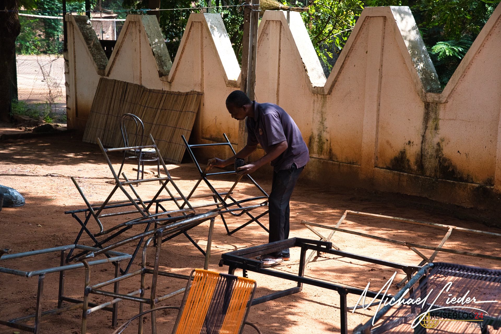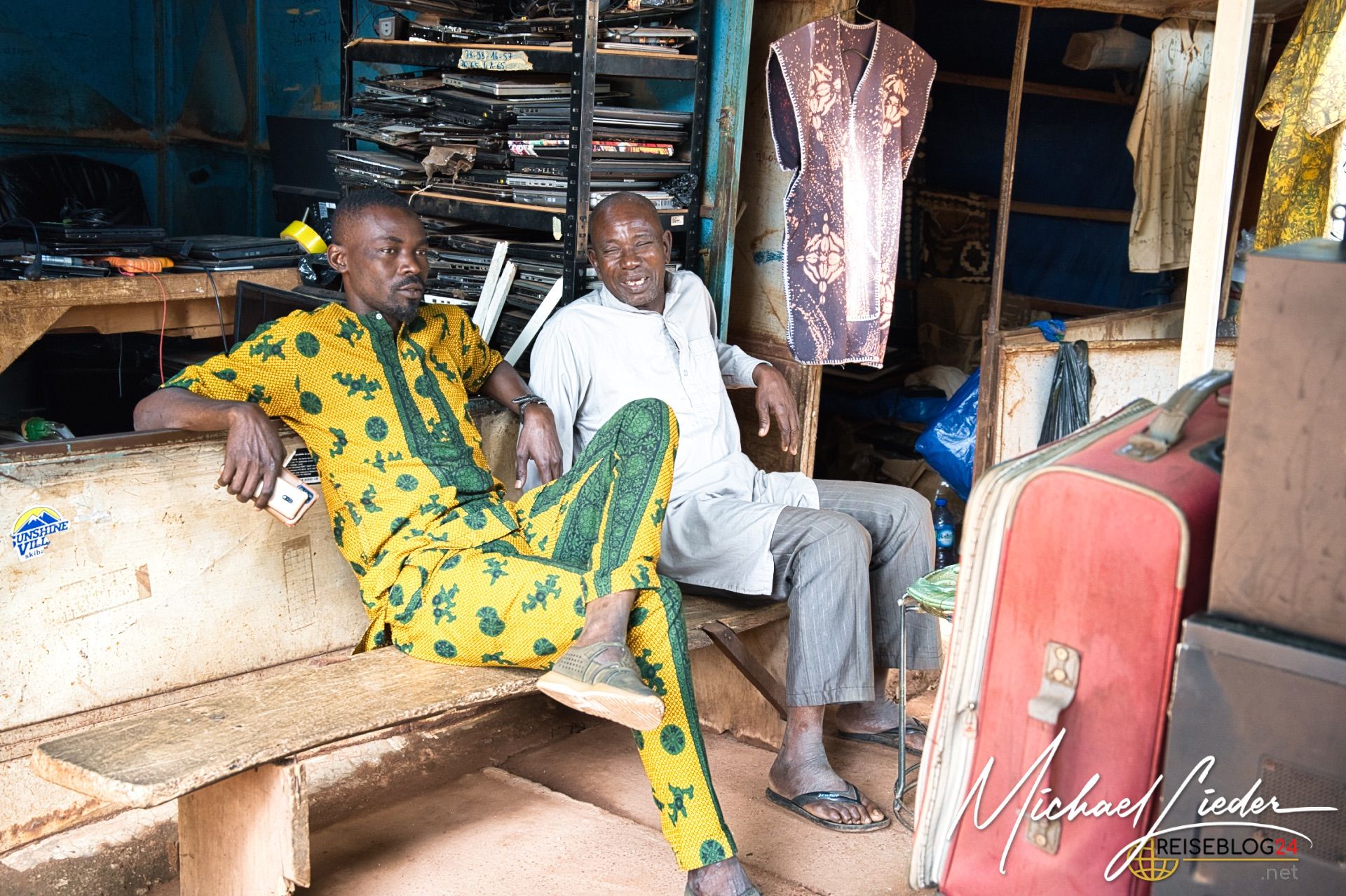 Ich konnte im Zuge meiner Dokumentationsarbeit auch auf´s Land fahren, zu einem kleinen Dorf vor den Toren Bobo´s nach Doufiguisso. Hier ist das Leben ruhig, beschaulich, ursprünglich und einfach landwirtschaftlich geprägt. Die Stadt und die Sorgen scheinen weit weg zu sein, interessant ist, dass sowohl das Wasser als auch die Versorgung mit Strom recht autark betrieben wird. Brunnen mit solarbetriebenen Pumpen sind oft zu sehen, und auch die Gelbatterien, die den Strom für die Nacht speichern, gehören zu vielen Haushalten. Viele versuchen neben den Feldfrüchten für den Eigenbedarf auch etwas für den Weiterverkauf zu produzieren. Das bedeutet, dass kilometerlang die Hauptstraßen von bunten Verkaufsständen gesäumt werden. Hier findet auf dem Land das Leben der Menschen unmittelbar statt.