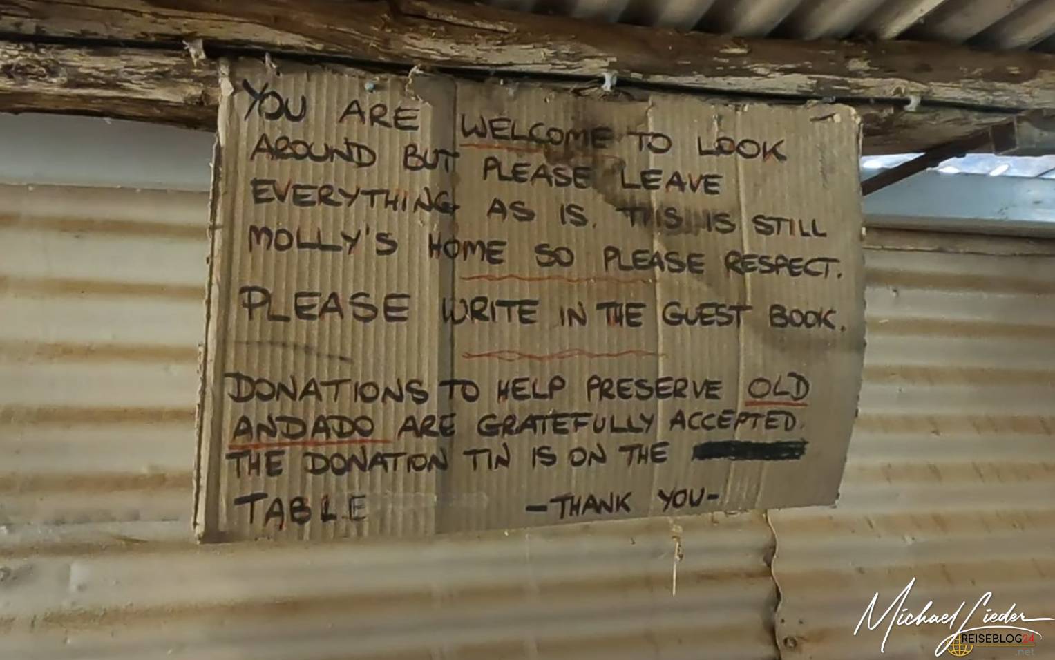 In Australien scheint die Zeit manchmal stillzustehen – und genau dieses Gefühl erlebten wir auf der Old Andado Station, einem Ort, der Geschichte atmet und die Seele berührt. Bei unserer Ankunft wirkte das Gelände wie ausgestorben, doch gleichzeitig lag eine fast greifbare Präsenz in der Luft – als ob der Geist von Molly Clark, der früheren Besitzerin, immer noch über das Anwesen wacht. Nur durch einen glücklichen Zufall stellten wir fest, dass die Türen offenstehen und Besucher ausdrücklich eingeladen sind, die Station und ihre Gebäude zu erkunden. Was wir vorfanden, war mehr als nur ein verlassener Hof – es war eine Reise in die Vergangenheit.