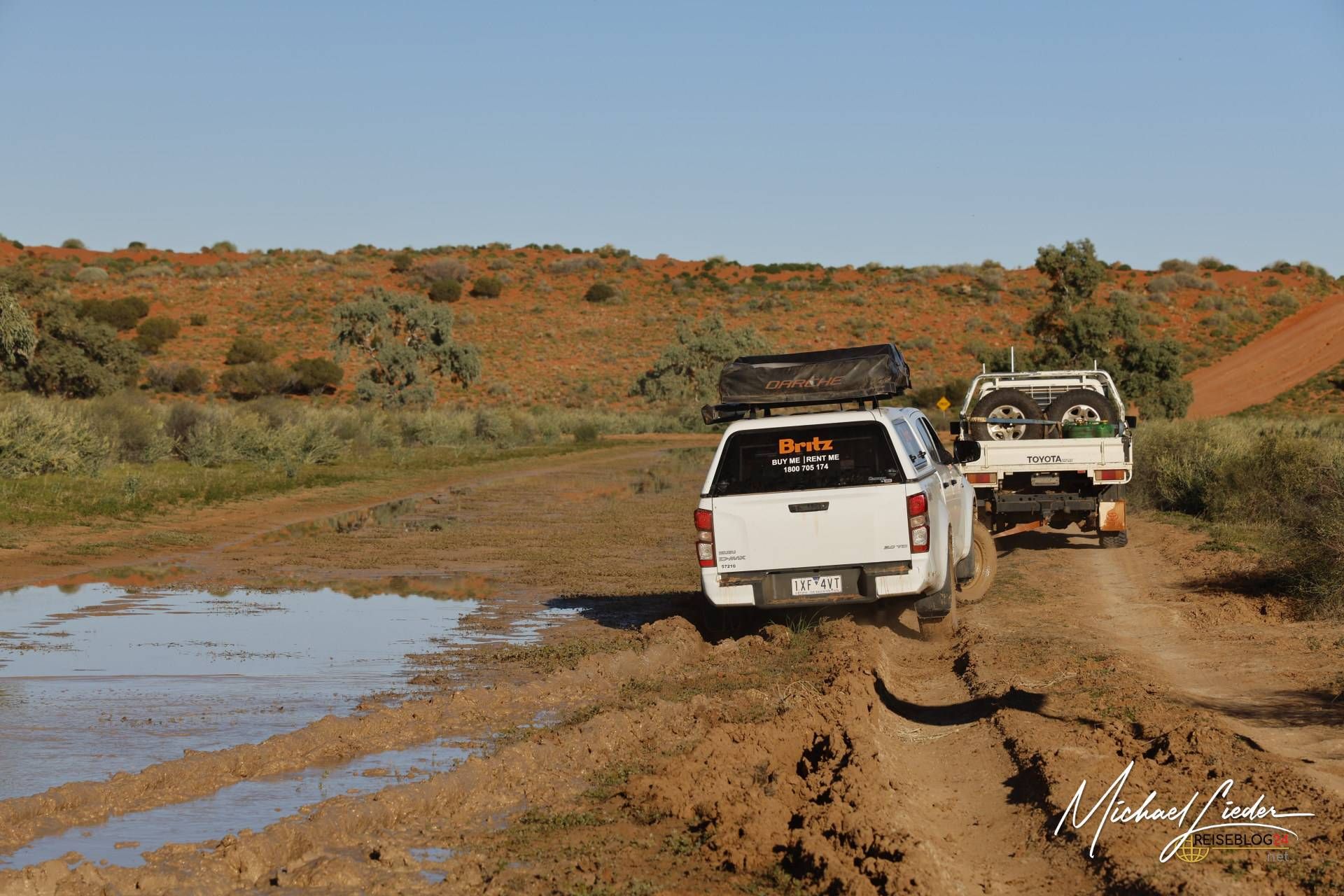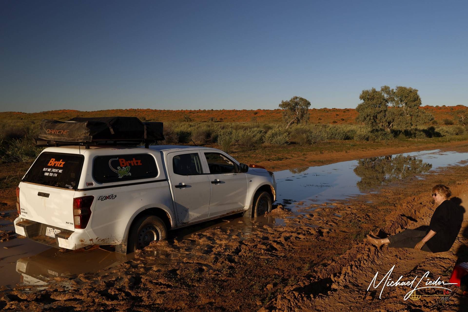 Nach einer kurzen Pause, in der wir die stille, fast unheimliche Atmosphäre auf uns wirken ließen, entschieden wir uns, weiterzufahren. Doch dann passierte das, was man als echten Outback-Klassiker bezeichnen könnte. Ich habe eine – sagen wir mal – unscheinbare Pfütze völlig unterschätzt. Was harmlos wirkte, entpuppte sich als wahre Falle.