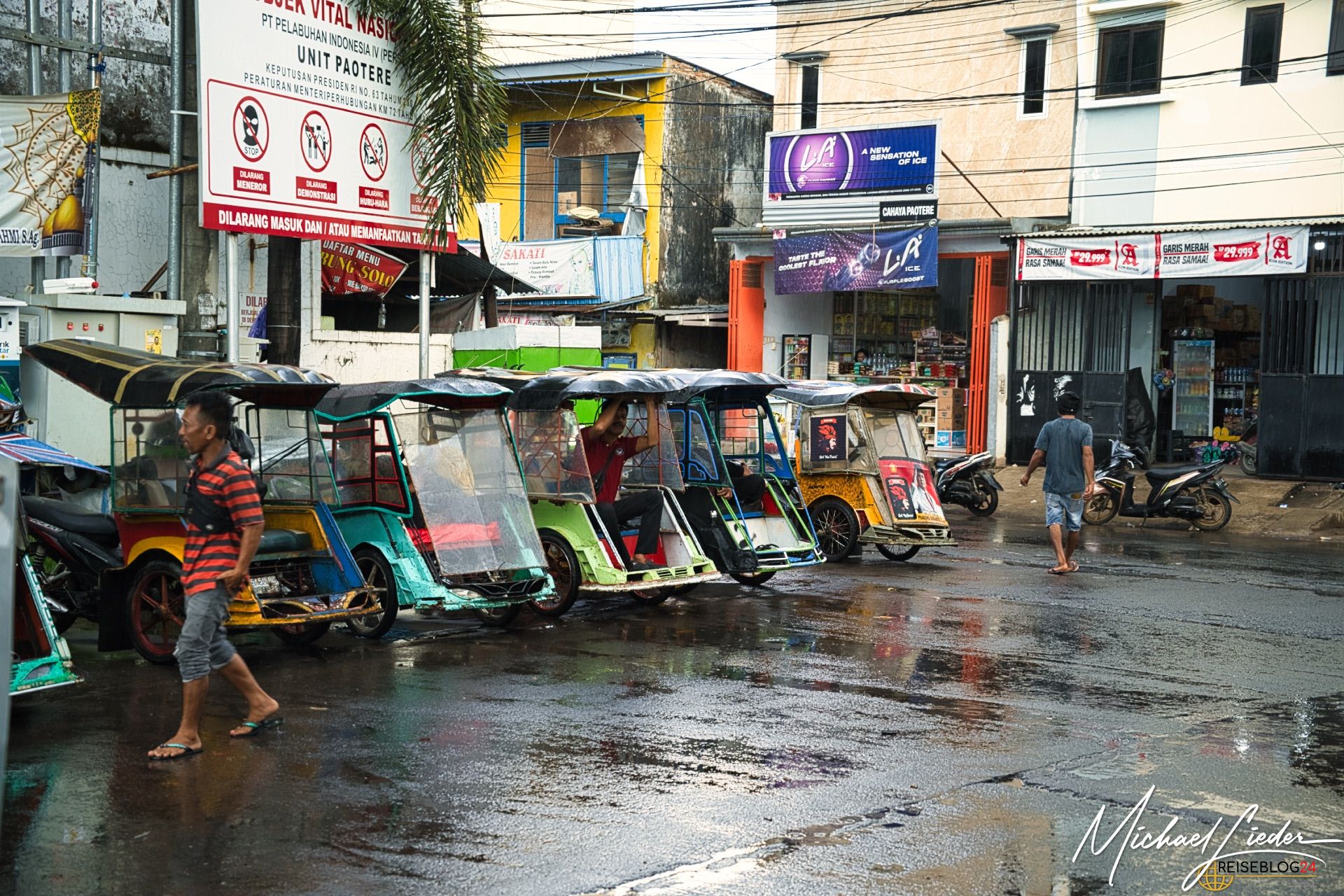 Die Szenerie war fast wie aus einem anderen Jahrhundert. Die alten, von der Sonne ausgebleichten Holzhäuser und Lagerhallen säumten die Kais, und zwischen ihnen herrschte geschäftiges Treiben. Kinder liefen barfuß umher, spielten lautstark Fußball zwischen den Booten und Karren, während riesige Blöcke von klarem Eis mit bloßen Händen auf Schubkarren geladen wurden, um die Fischerboote zu versorgen. Bei einem Regenguss haben sich alle unter die Vordächer oder in die kleinen einfachen Restaurants zurückgezogen, und sobald der Regen vorbei war, ging das bunte Treiben und Spielen von vorn los. Bei den Kindern haben wir schon ein wenig Aufsehen erregt, sie waren neugierig, waren vor und neben uns, einige haben gegrüßt. Einige waren sehr zurückhaltend, aber alle schienen irgendwie neugierig zu sein. Das waren wir ja auch. Wir wollten wissen, wie das Leben hier draußen außerhalb der Innenstadt von Makassar ist.