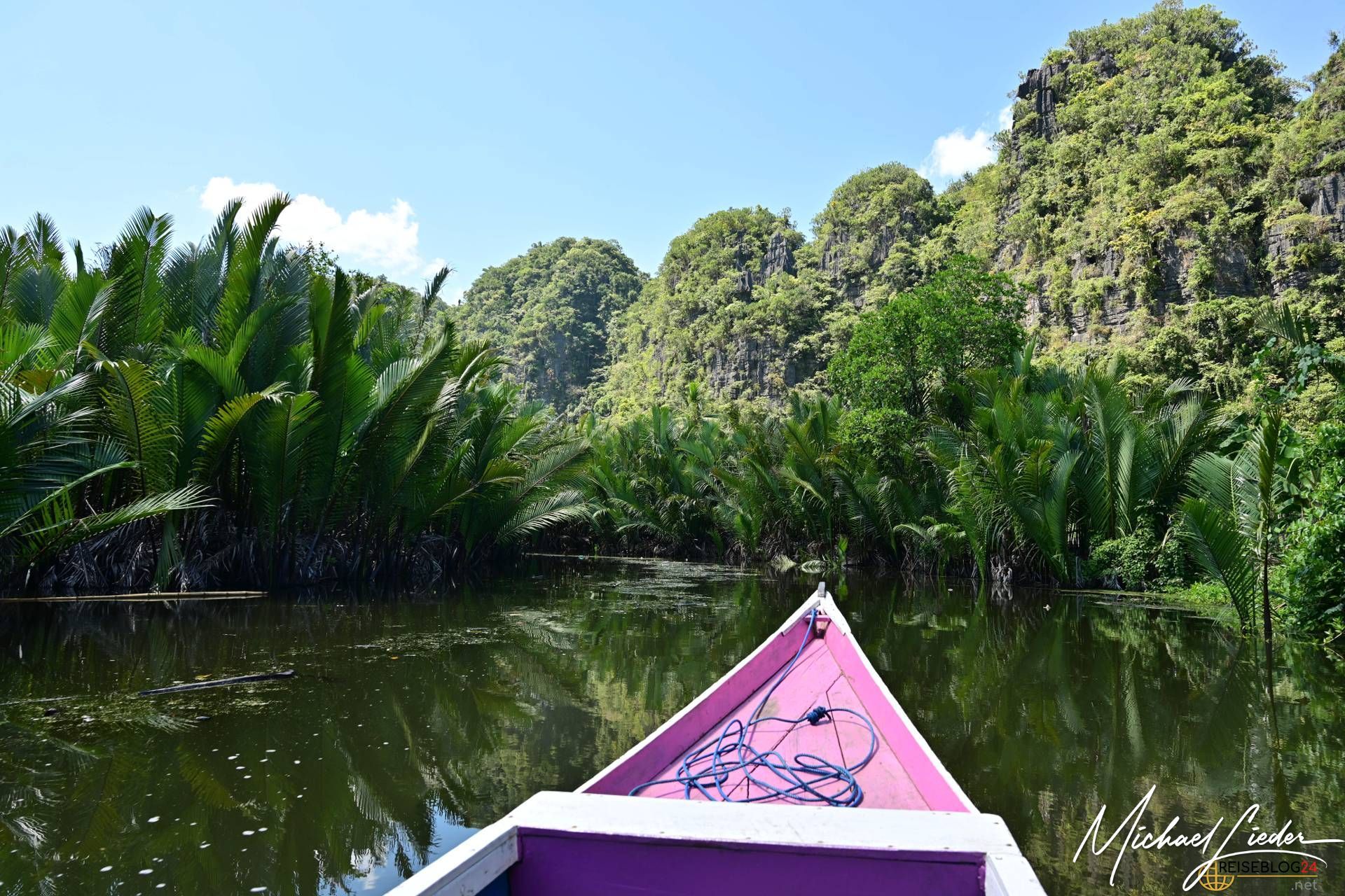 Zwischen den Felsen schimmern sattgrüne Reisfelder, in denen Bauern gemächlich ihrer Arbeit nachgehen. Ein verzweigtes Netz aus Flüssen und Kanälen schlängelt sich durch die Szenerie, gesäumt von dichten Palmenhainen und kleinen, versteckten Dörfern. Die Fahrt mit einem traditionellen Holzboot durch diese Wasserwege ist ein Erlebnis für sich – das leise Plätschern des Wassers, das Echo der tropischen Vögel und das sanfte Wiegen der Vegetation lassen dich eintauchen in eine Welt, die fernab jeder Hektik liegt.