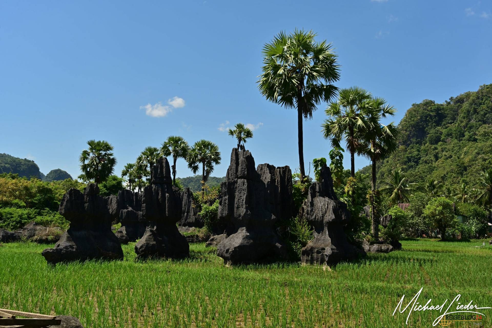 Nun öffnet sich die Landschaft und wir spazieren entlang endloser, smaragdgrüner Reisfelder. Millionen Schattierungen von Grün fluten die Sinne und lassen uns tief durchatmen. Die Karstberge, üppig mit Moosen, Farnen und Bäumen bewachsen, erheben sich majestätisch vor uns – ein Panorama, das die Seele sofort zur Ruhe kommen lässt. Kein Lärm, keine Hektik, nur das sanfte Rauschen des Windes und das entfernte Zirpen der Insekten. Nach den lauten Tagen in Makassar fühlt sich dieser Moment an wie eine Wohltat.