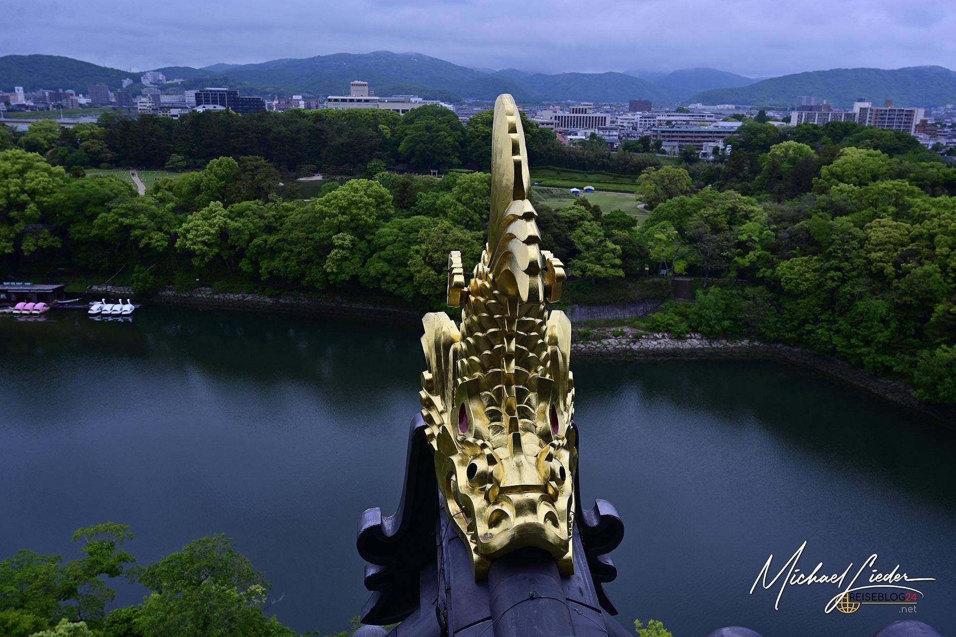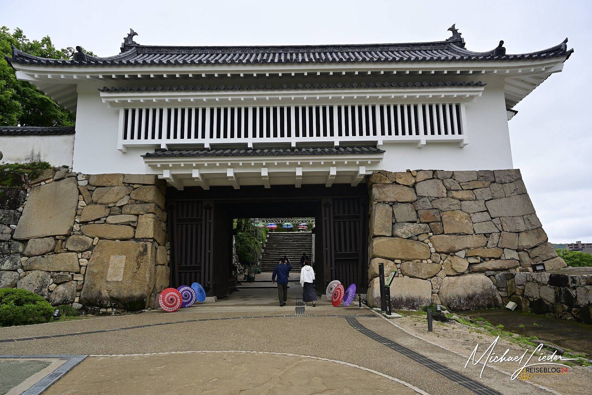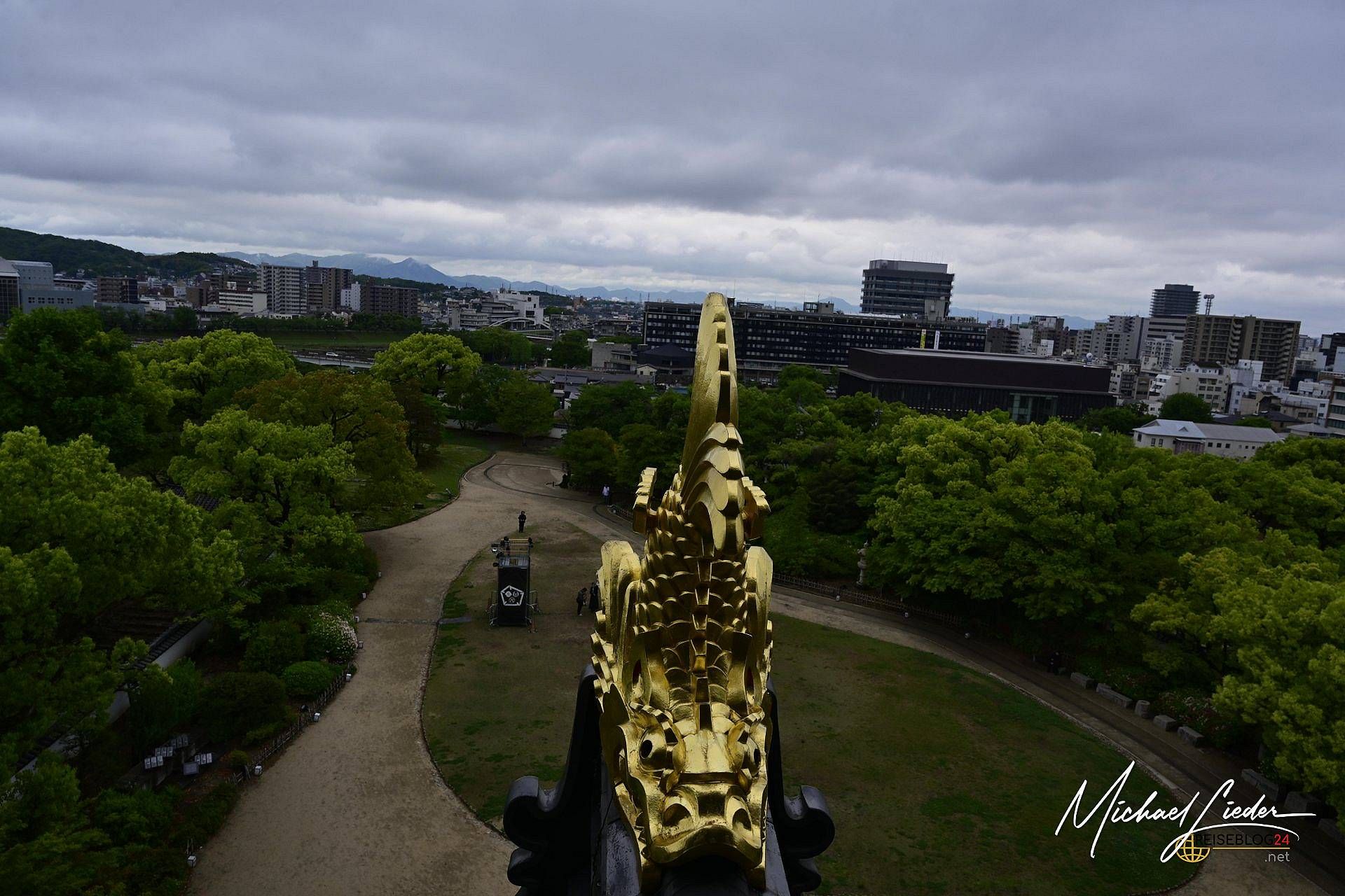 Die Burg selbst – ein Nachbau des Originals, das im Zweiten Weltkrieg zerstört wurde – beeindruckt schon von außen mit ihrer dunklen, fast schwarzen Fassade. Daher auch der Spitzname „Ujō“ – die Krähenburg. Und ja, sie wirkt tatsächlich ein wenig düster. Aber im besten Sinne: statt märchenhaft verspielt eher kraftvoll und stolz.